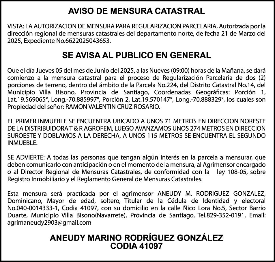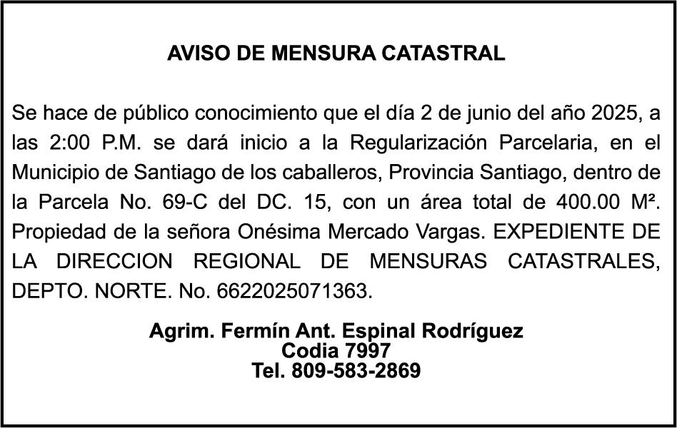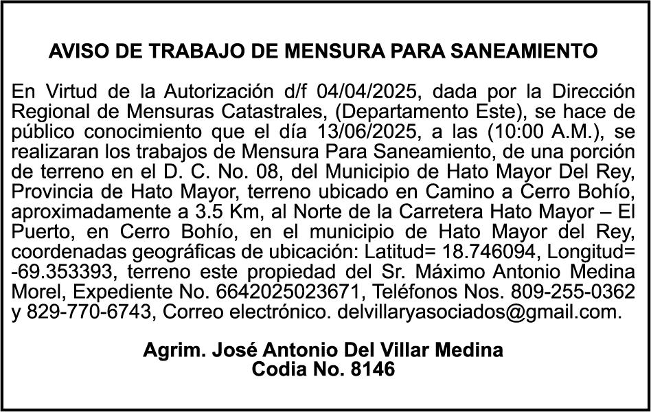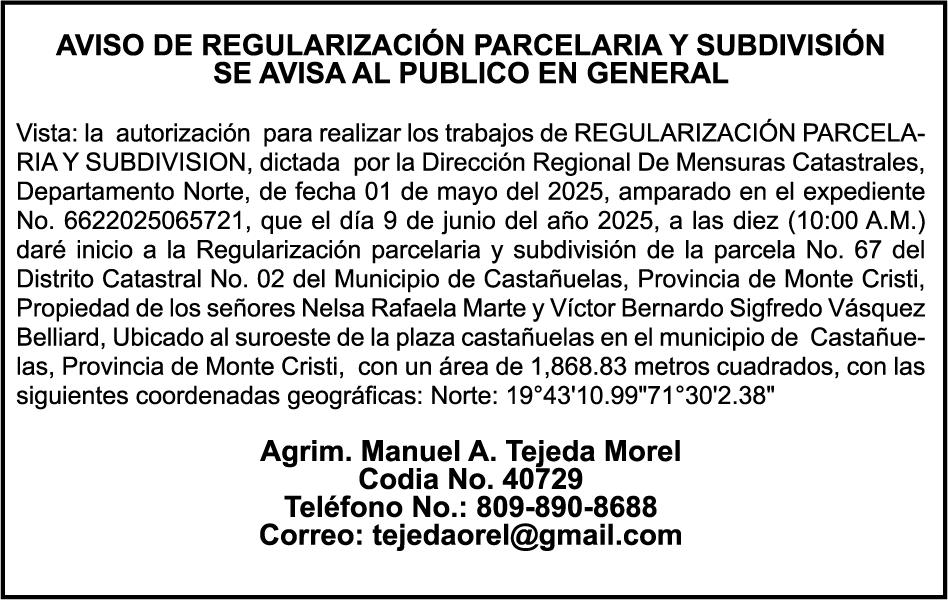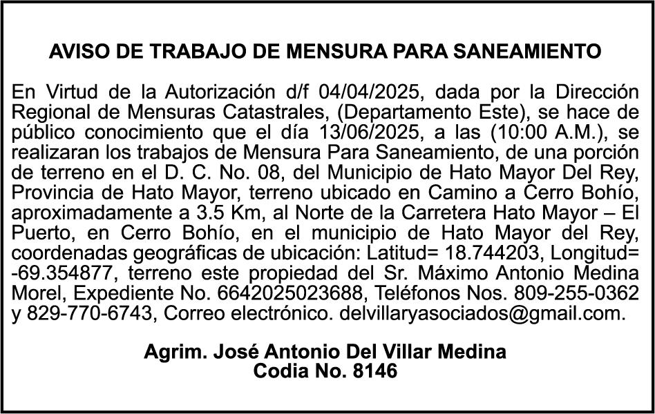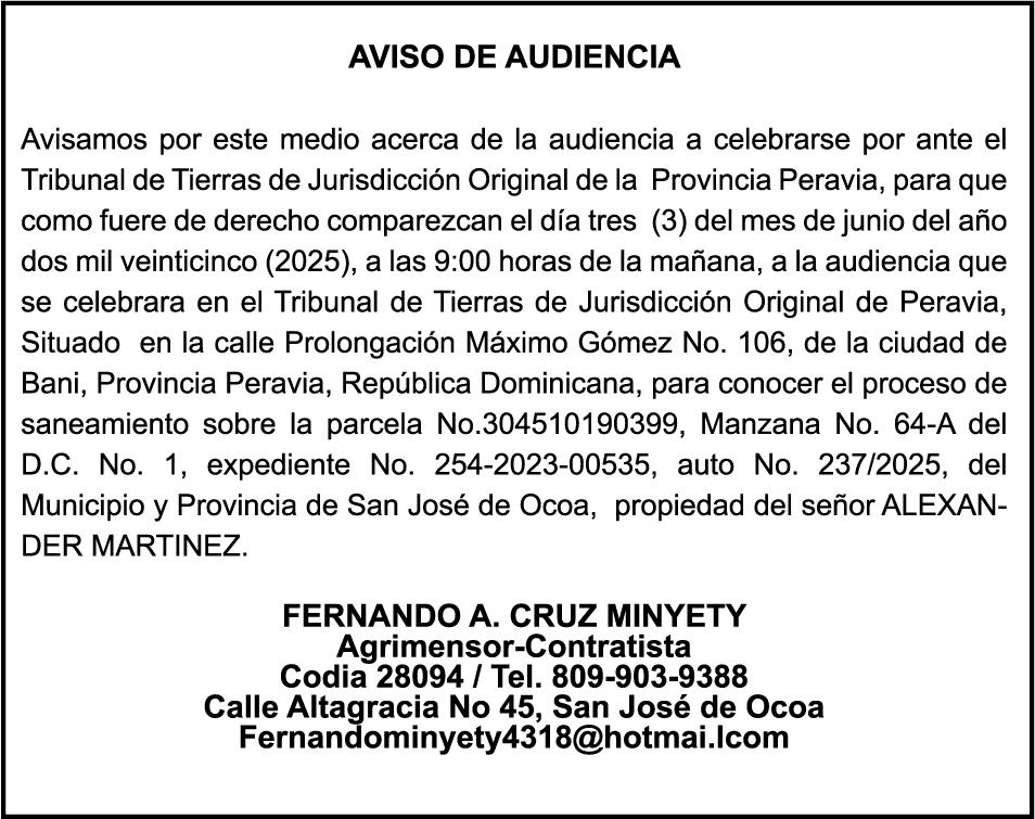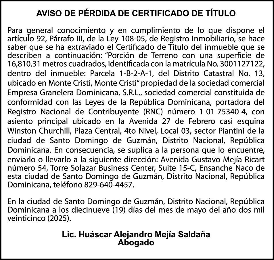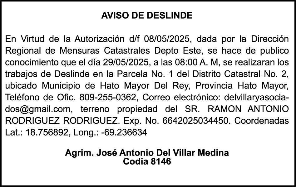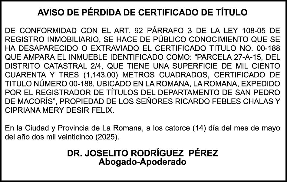 AVISO TRASPASO El señor. OCTAVIO DE JESUS MARTINEZ CRUZ, traspasa el la yola de pesca “RAQUEL-II”, matricula No. YP-R13-333PP, de 17.6 pies de eslora, color Rojo, al señor RAMON GARCIA ACOSTA, como nuevo propietario.