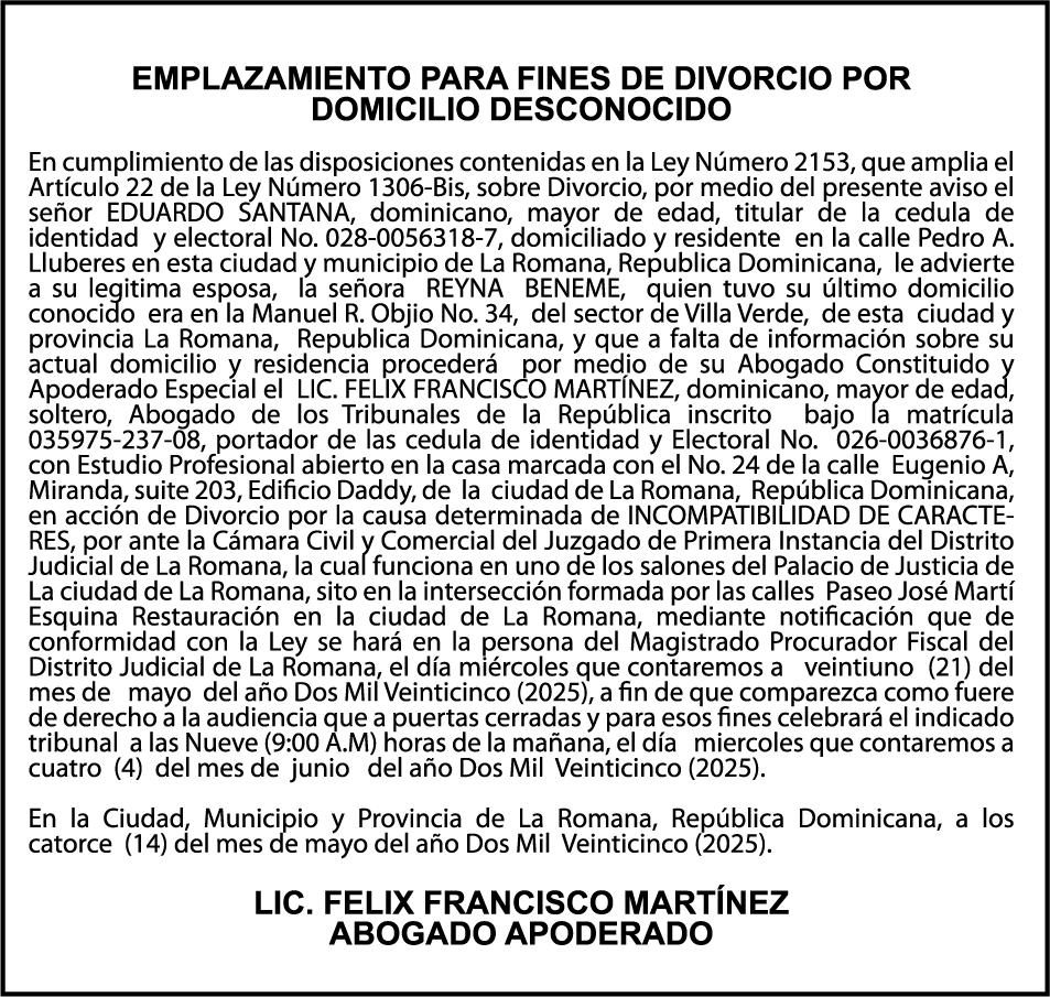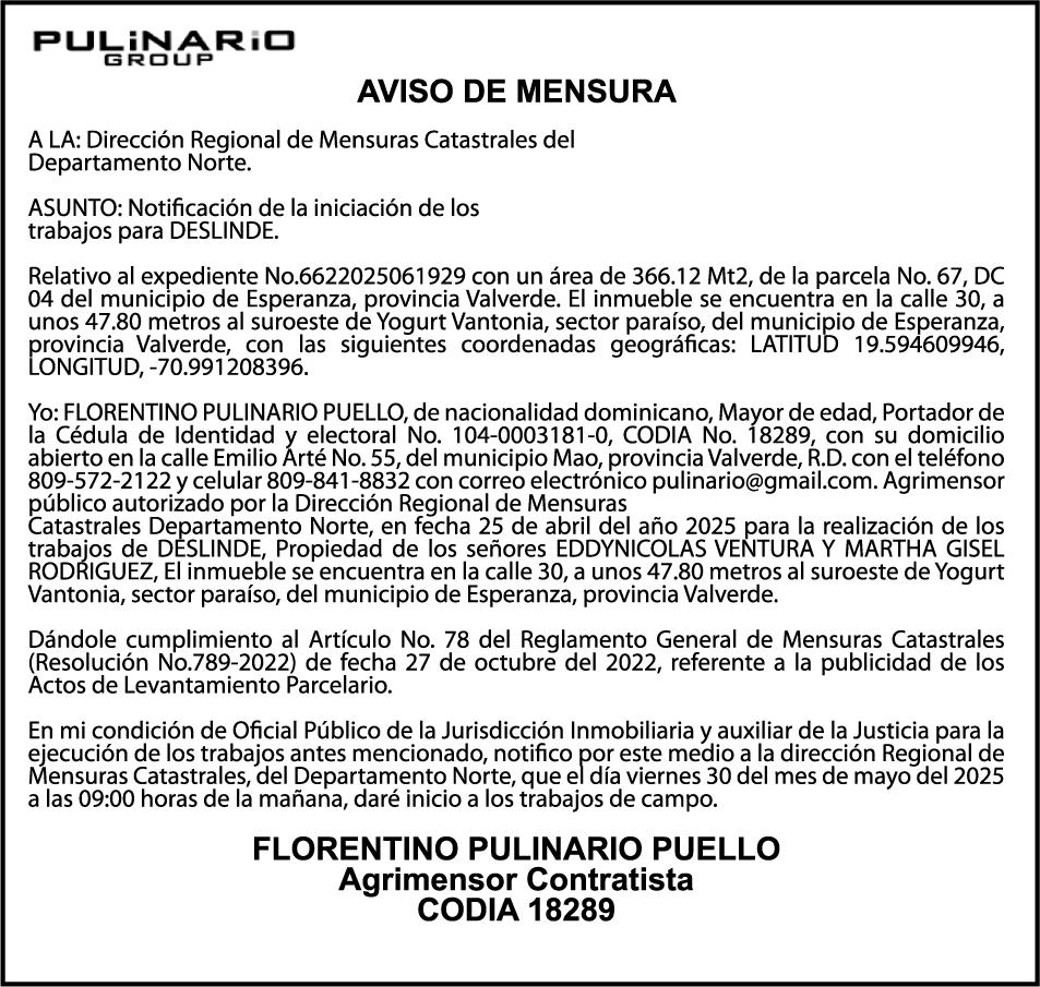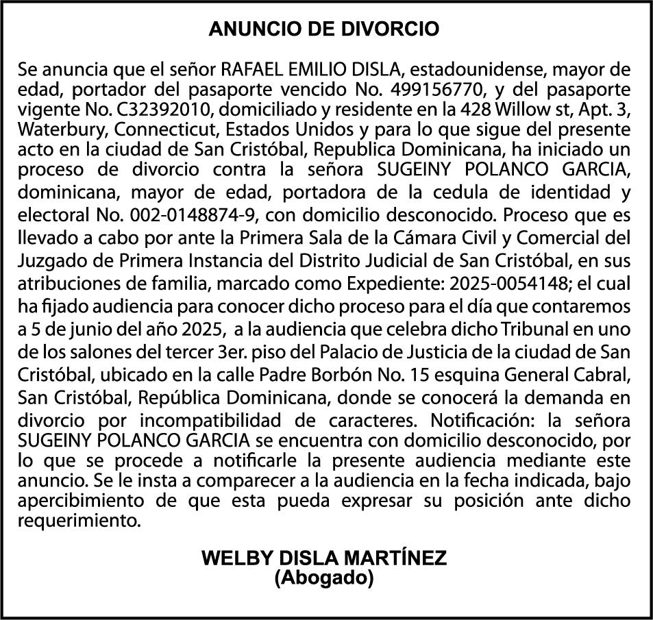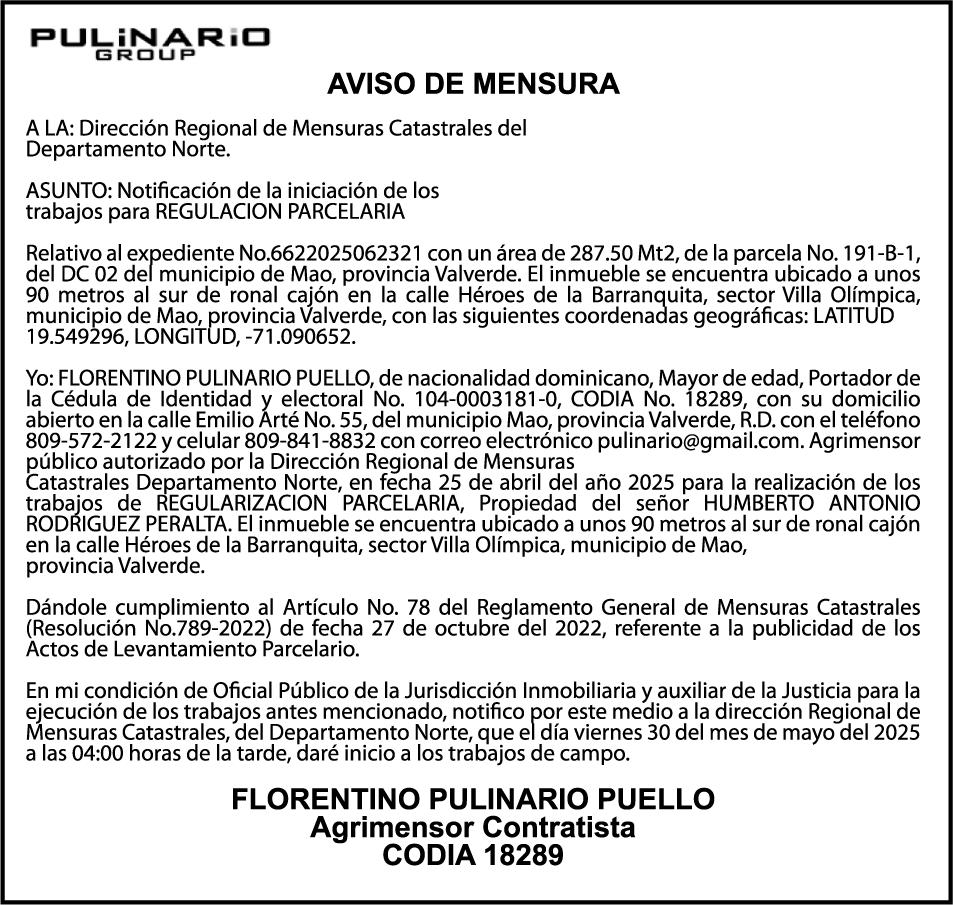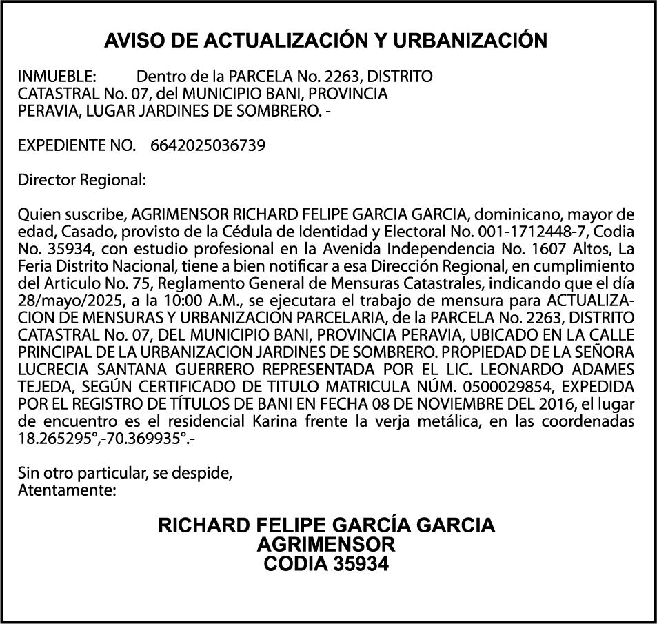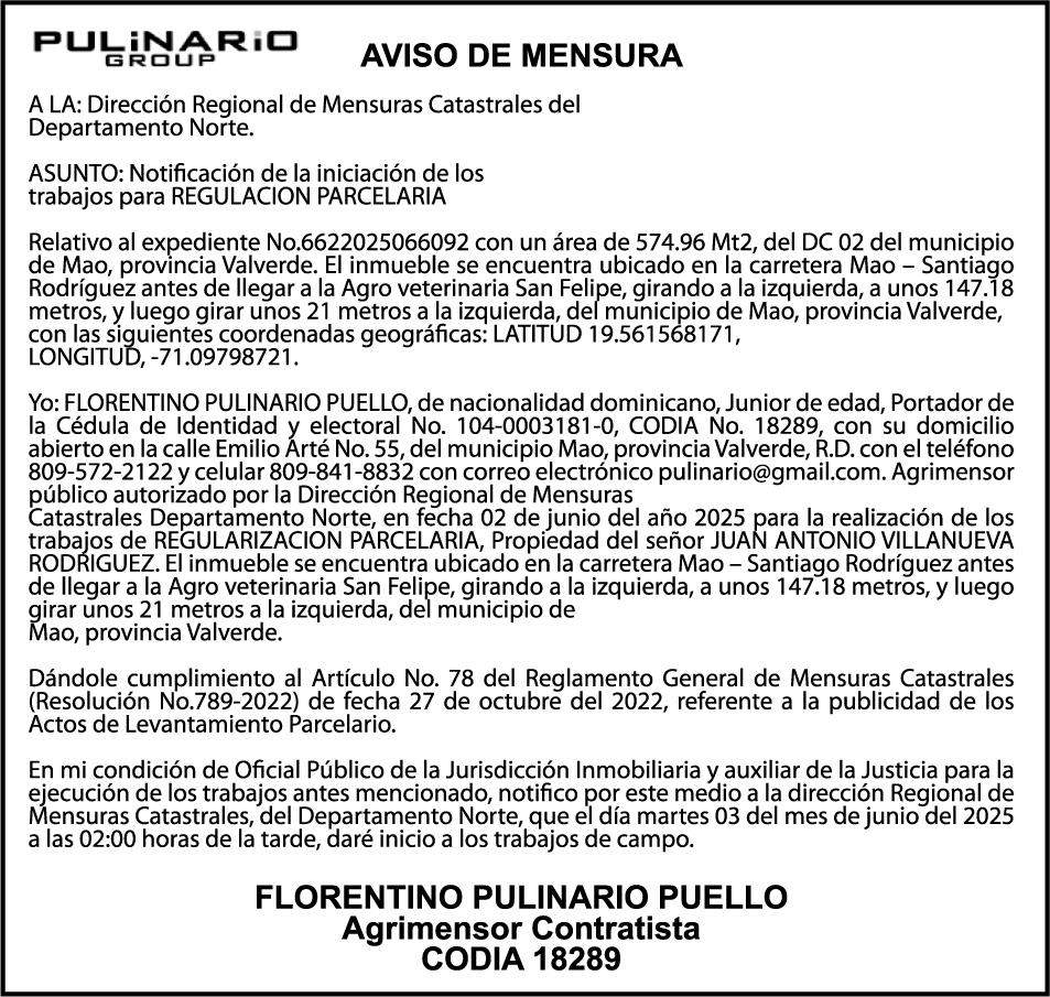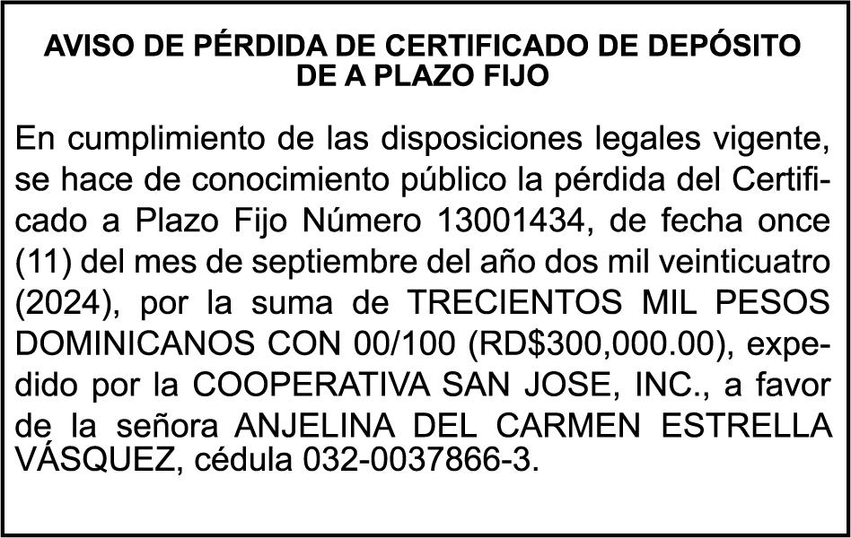 AVISO TRASPASO El señor. OCTAVIO DE JESUS MARTINEZ CRUZ, traspasa el la yola de pesca “RAQUEL-II”, matricula No. YP-R13-333PP, de 17.6 pies de eslora, color Rojo, al señor RAMON GARCIA ACOSTA, como nuevo propietario.
