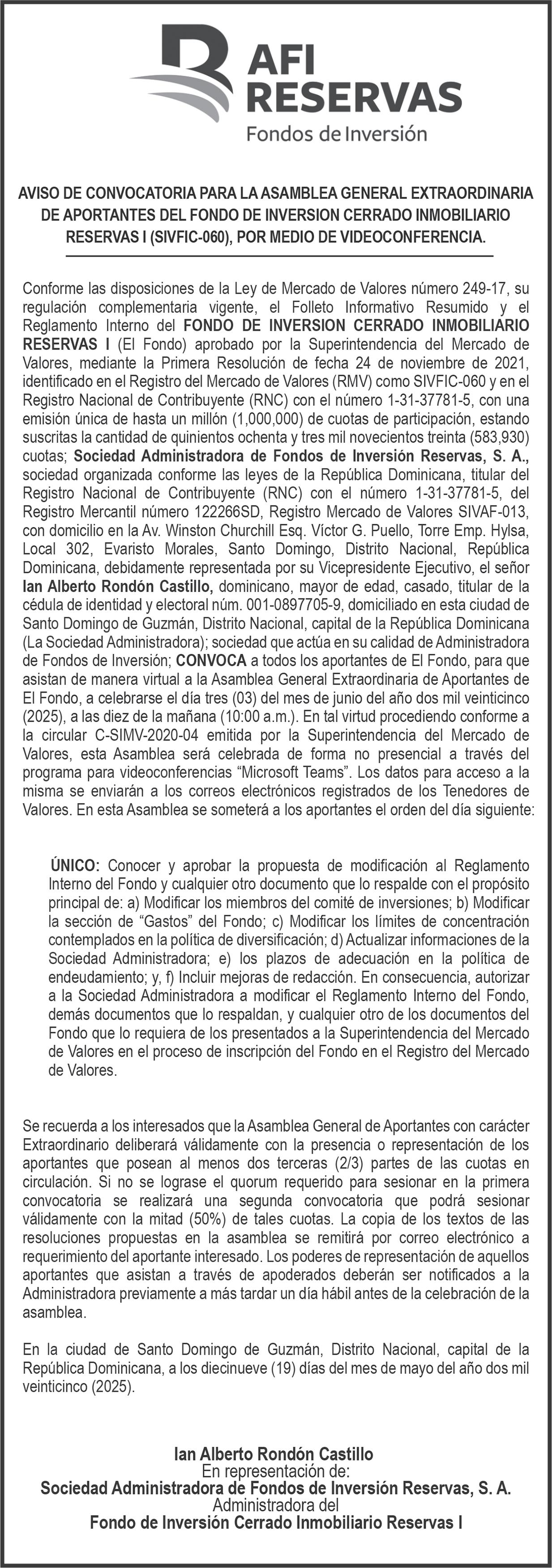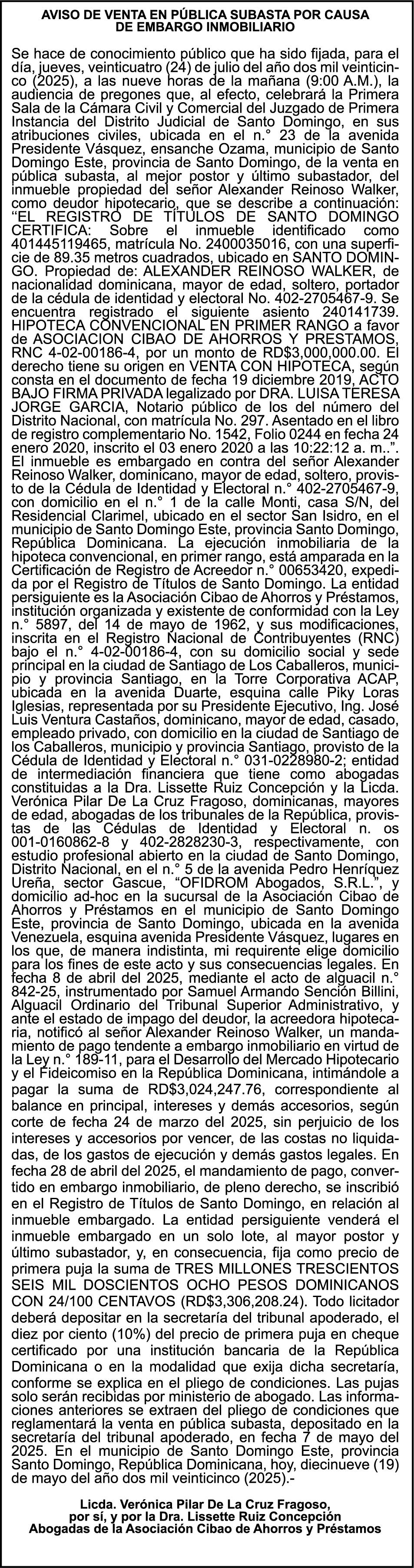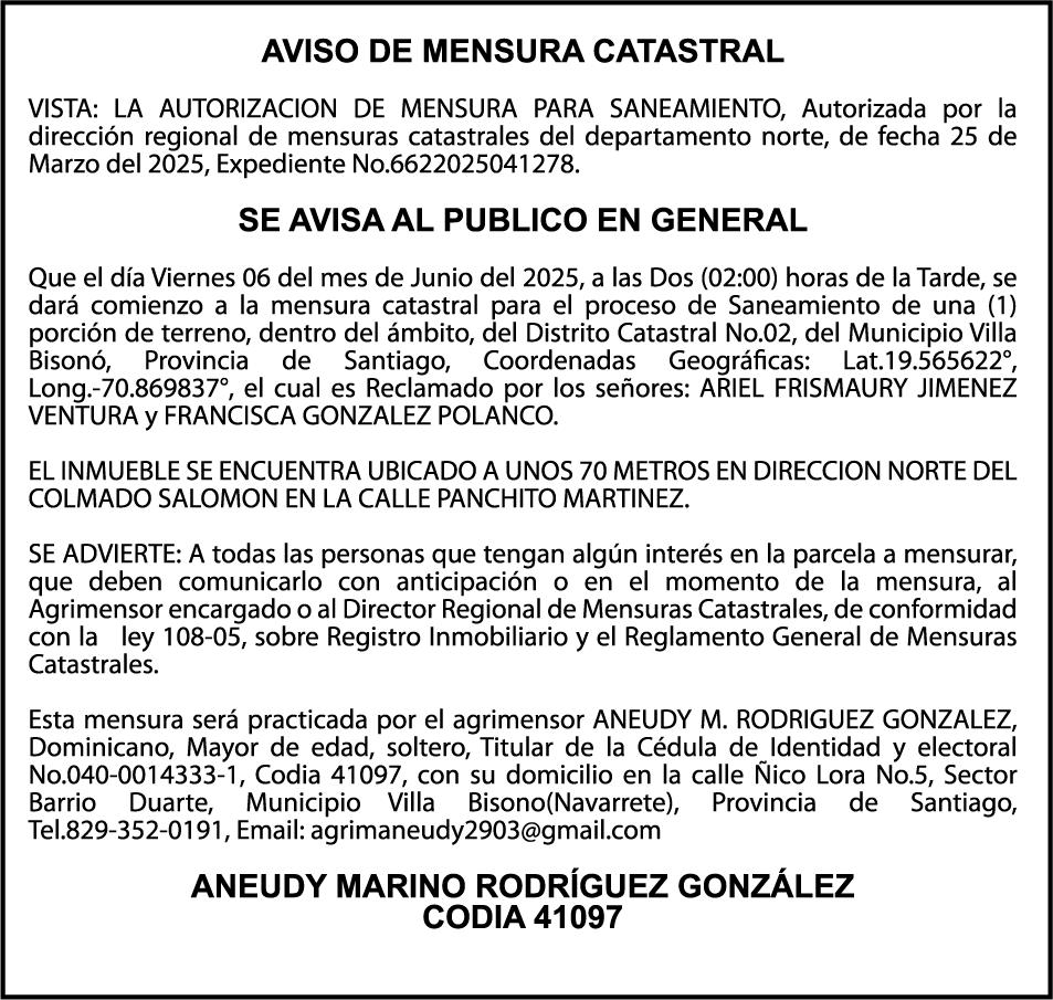 AVISO TRASPASO DE EMBARCACION El Sr. WILSON JOSE REYES COLLADO, Ced. 001-0730561-7, traspasa al Sr. ROLANDO RAFAEL CABRERA MONTILLA, Ced. 402-2053656-5, la embarcación de nombre (CAROLINA-3), amparada por el Matrícula No. BP-C60-644BCH, numero de Casco AM-PE160201506-24, de 19 pies de eslora, 5´´0´ de manga y 2´´ 0´´ de puntal, color blanco.