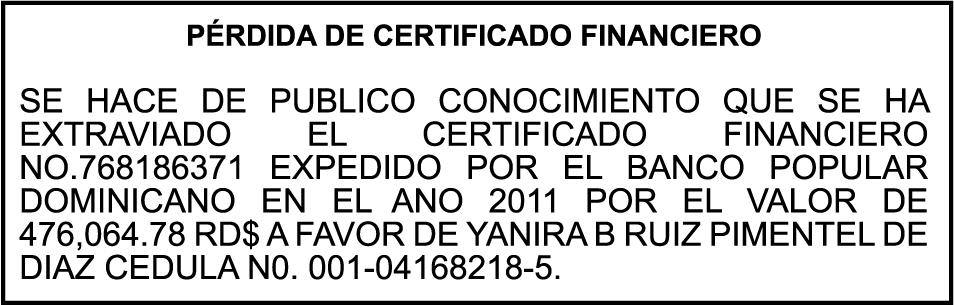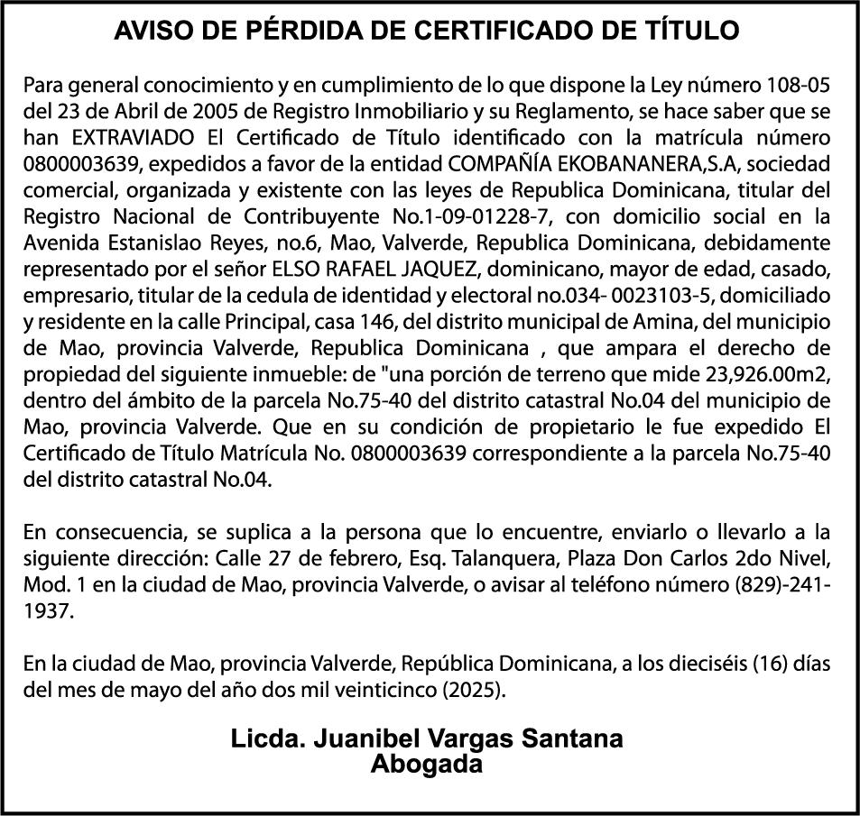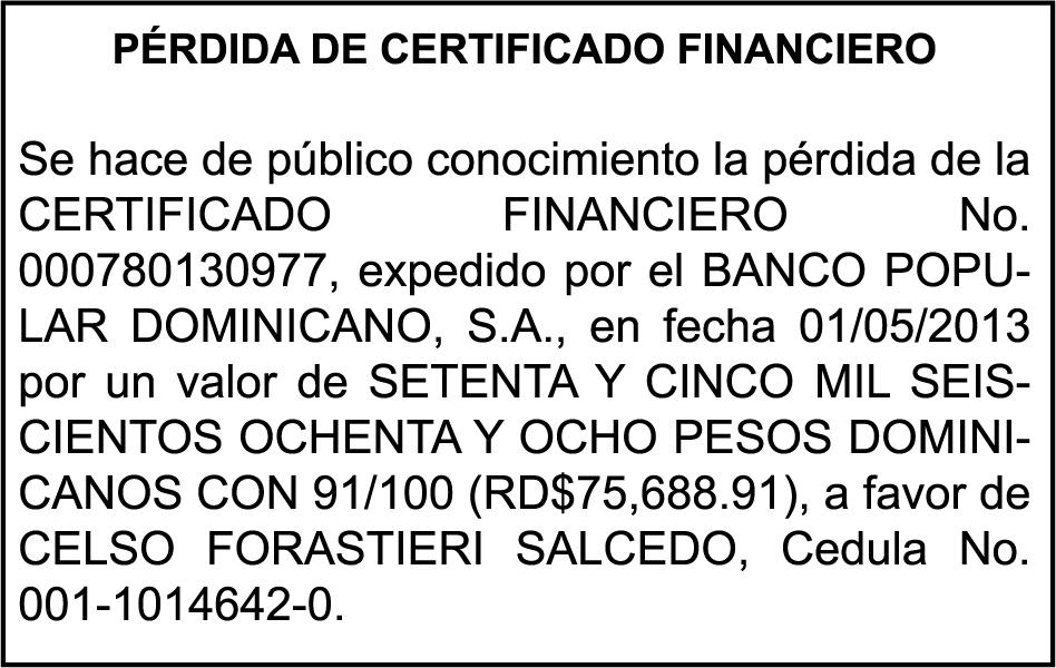 PERDIDA DE MATRICULA: Del JEEP, Placa G436780, Chasis 1FMCU9H93DUC90866, Marca FORD, Modelo ESCAPE SEI 4WD, Color GRIS, AñO 2013, a nombre de ANA SILVIA ALTAGRACIA SANTOS LUCIANO,Ced. 03102984006
