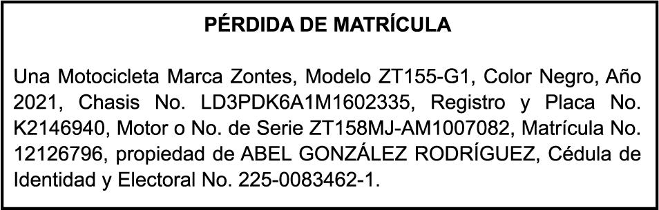 PERDIDA DE PLACA No. N128577M, Motocicleta SUZUKI, Modelo AX100, Color NEGRO, Año 2006, Chasis LC6PAGA1360814935, a nombre de MARCOS ANTONIO INOA PARRA.