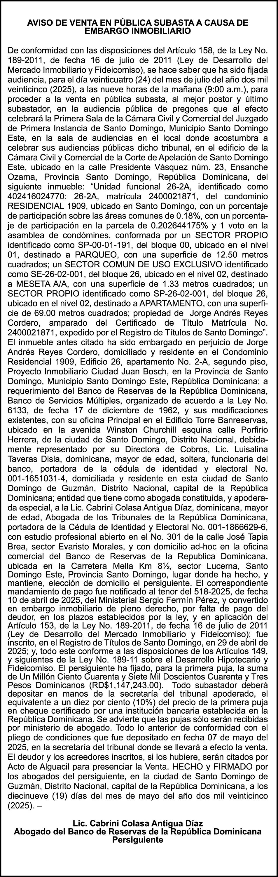 PERDIDA DE CONTRATO DE ARRENDAMIENTO DE SOLAR, No. 20 manzana 25, ubicado en la calle Dr. TEOFILO FERRY, No. 27, en la ciudad de La Romana, República Dominicana, propiedad de la Sra. MARIA I. MAYER DE ARRENDEL