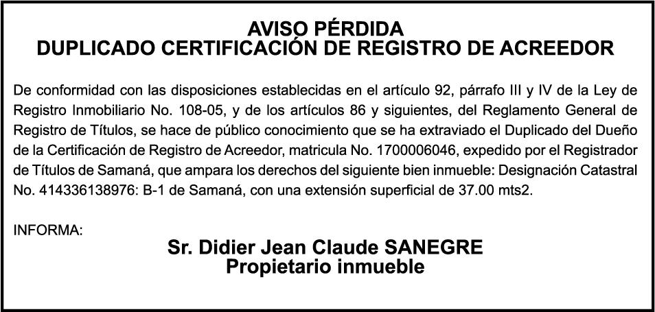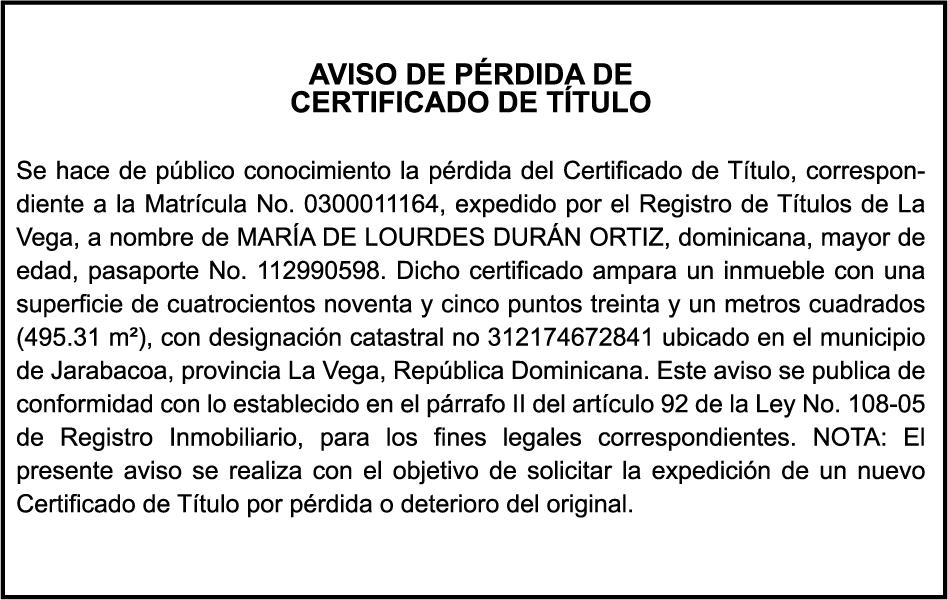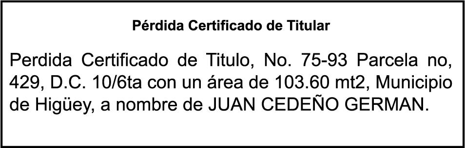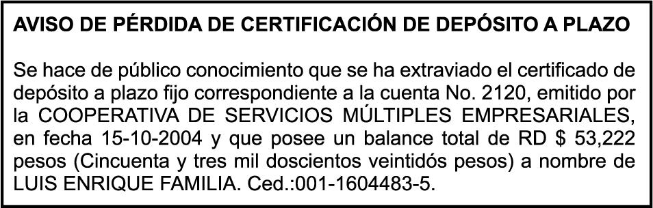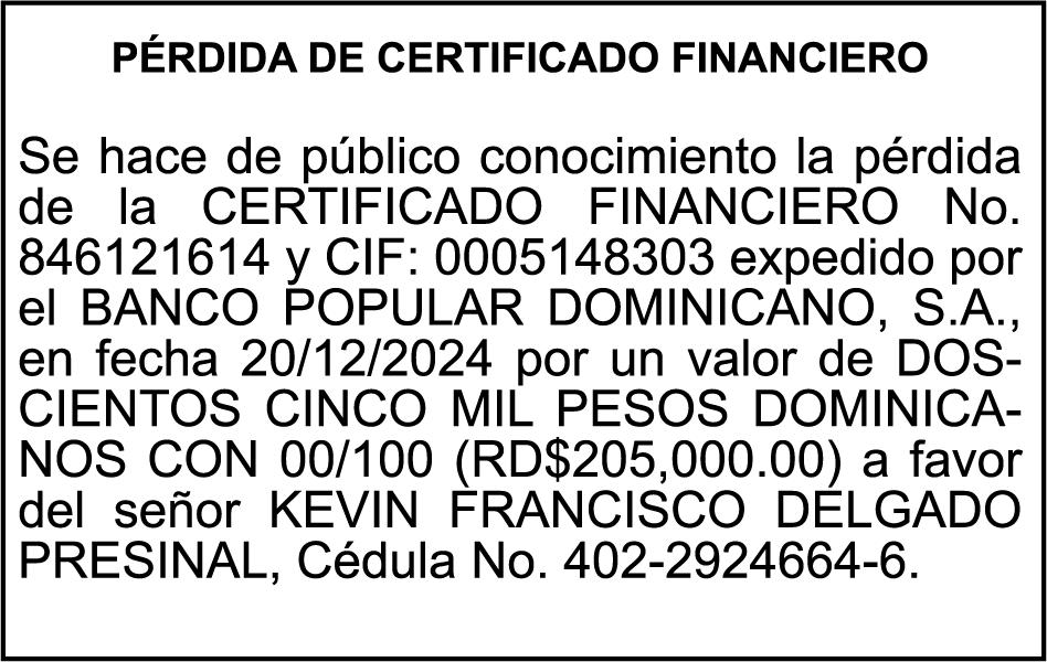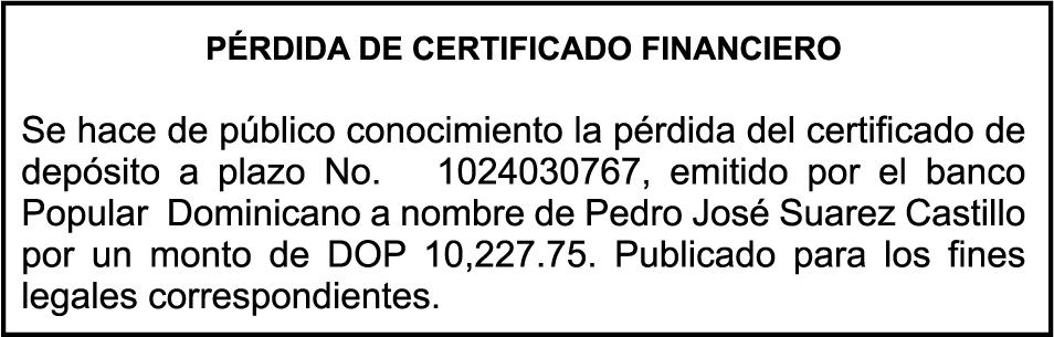 SE hace de público conocimiento la pérdida del Certificado Financiero número 795134261 emitido por Banco Popular Dominicano, S. A. Banco Múltiple, a nombre de ELIANA BALTAZAR DE GUERRERO, portadora de la Cédula de Identidad y Electoral número 026-0030613-4 y FELIX GUERRERO, portador de la Cédula de Identidad y Electoral número 025-0026578-6, certificado número 795134261 expedido en fecha 1 de febrero de 2016 por el monto de (RD$34,893.43) más intereses generados a la fecha.