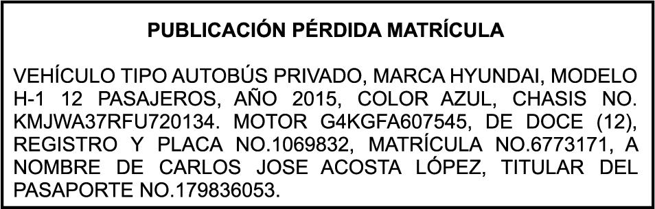 PERDIDA DE MATRICULA, del vehículo marca TOYOTA, Modelo VITZ, año 2014, color BLANCO, Placa No. A852596, Chasis No. KSP1302112524, a nombre de FLORINDA CRUZ GUERRERO