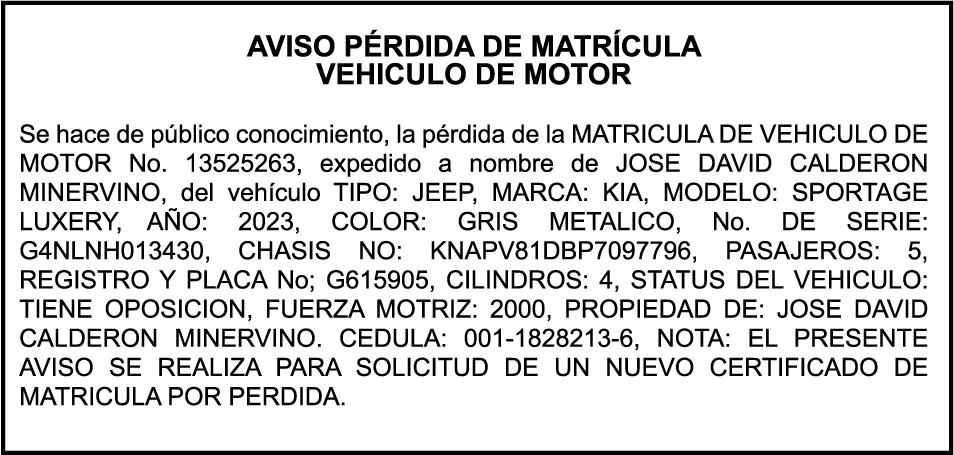 PERDIDA DE MATRICULA del automóvil privado marca KIA, Modelo SOUL +, año 2013, color NEGRO, Placa No. A860243, Chasis No. KNDJT2A60D7535739, a nombre de SOVEIDA ALTAGRACIA MARTINEZ