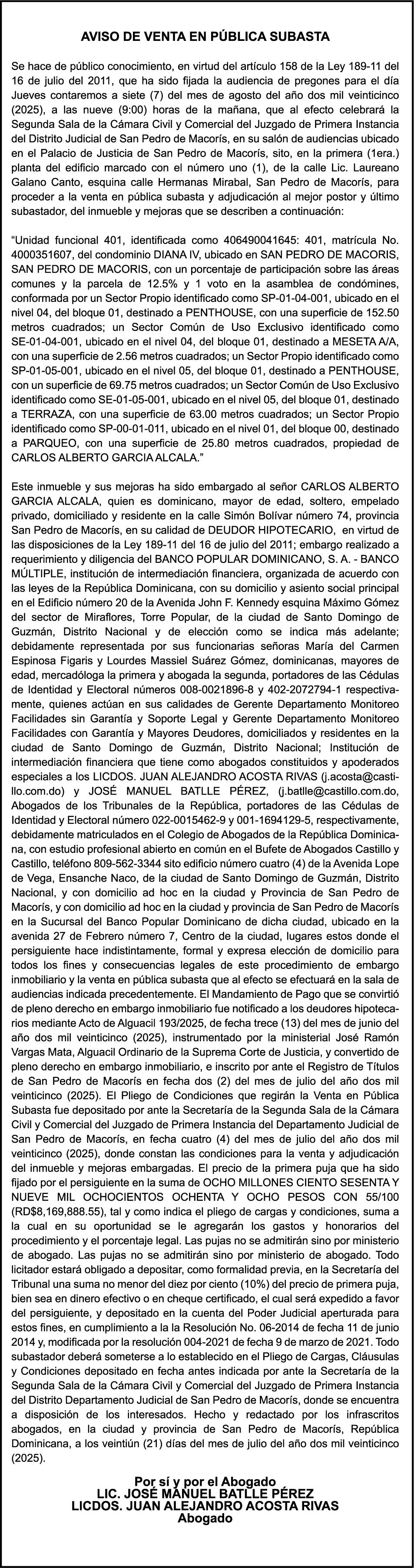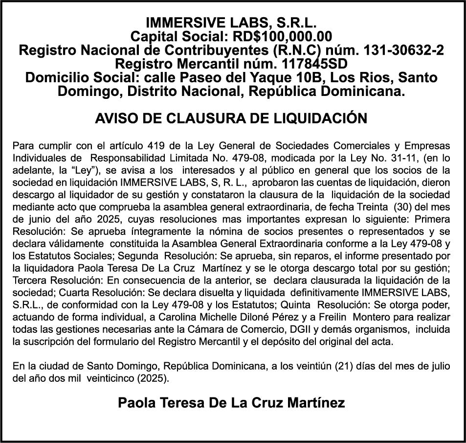 SE hace de público conocimiento la pérdida del Certificado Financiero número 839423290 emitido por Banco Popular Dominicano, S. A. Banco Múltiple, a nombre de ALIANZA DE MISERICORDIA RNC número 4-30-31625-3, debidamente representada Por KARINA MERCEDES ESPINO UREÑA, portadora de la Cédula de Identidad y Electoral número 001-1831550-6 y HELOISA DE SOUSA LEITE, portadora de la Cédula Pasaporte No. FX707095, certificado número 839423290 expedido en fecha 20 de febrero de 2024 por el monto de (RD$813,787.00) más intereses generados a la fecha.