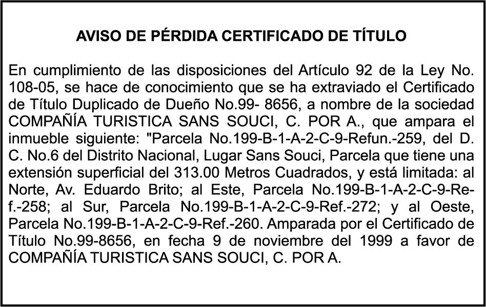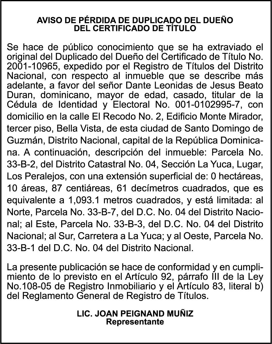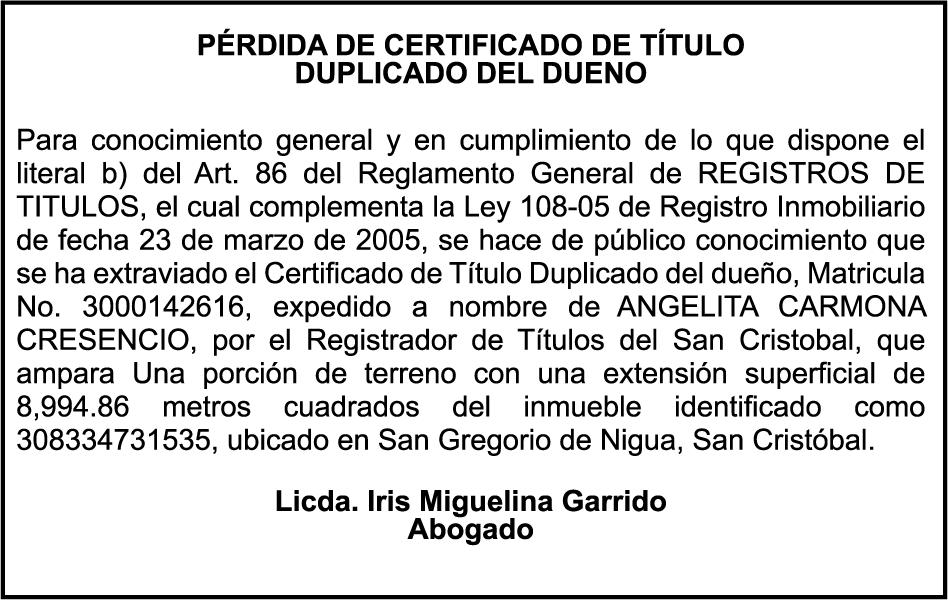 SE hace de público conocimiento la pérdida del Certificado Financiero número 760656462 emitido por Banco Popular Dominicano, S. A. Banco Múltiple, a nombre de DOMINGA PEÑA PEÑA, portadora de la Cédula de Identidad y Electoral número 001-1317543-4 certificado número 760656462 expedido en fecha 23 de junio de 2010 por el monto de (RD$122,000.00) más intereses generados a la fecha.