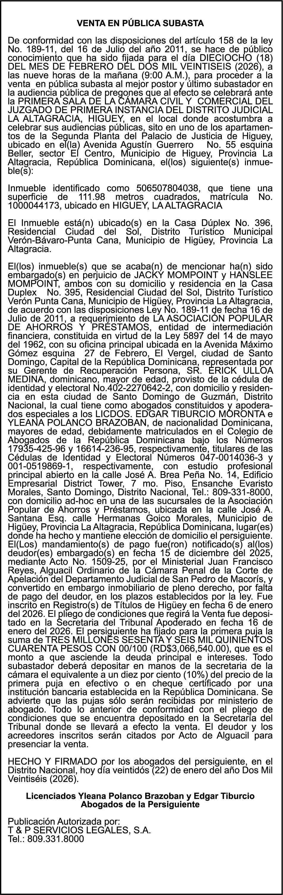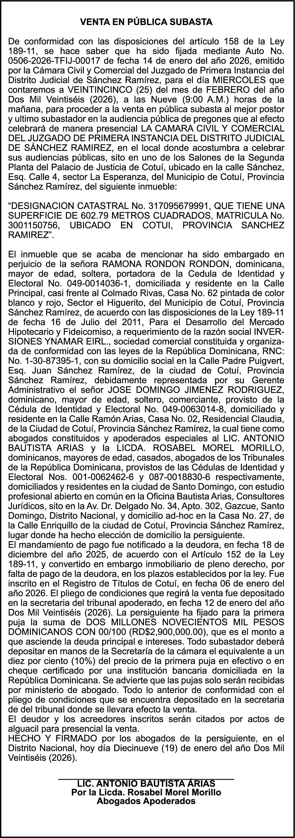 ACEVEDO, portadora de la Cédula de Identidad y Electoral número 028-0081516-5 certificado número 838783736 expedido en fecha 22 de enero de 2024 por el monto de (USD$97,455.91) más intereses generados a la fecha.