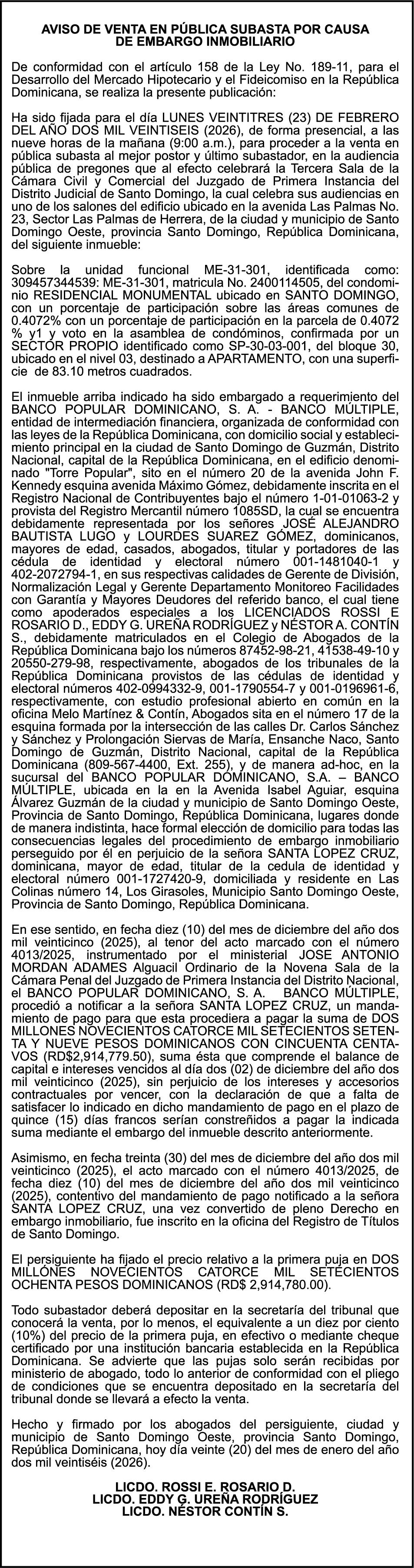 SE hace de público conocimiento la pérdida del Certificado Financiero número 838783736 emitido por Banco Popular Dominicano, S. A. Banco Múltiple, a nombre de YAKAN ENERIA MARTINEZ