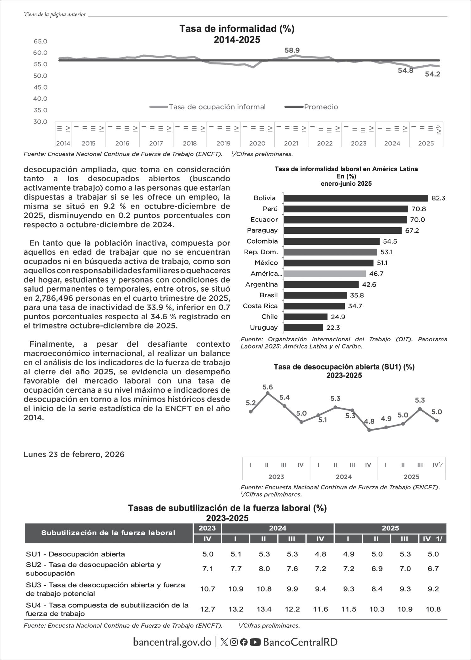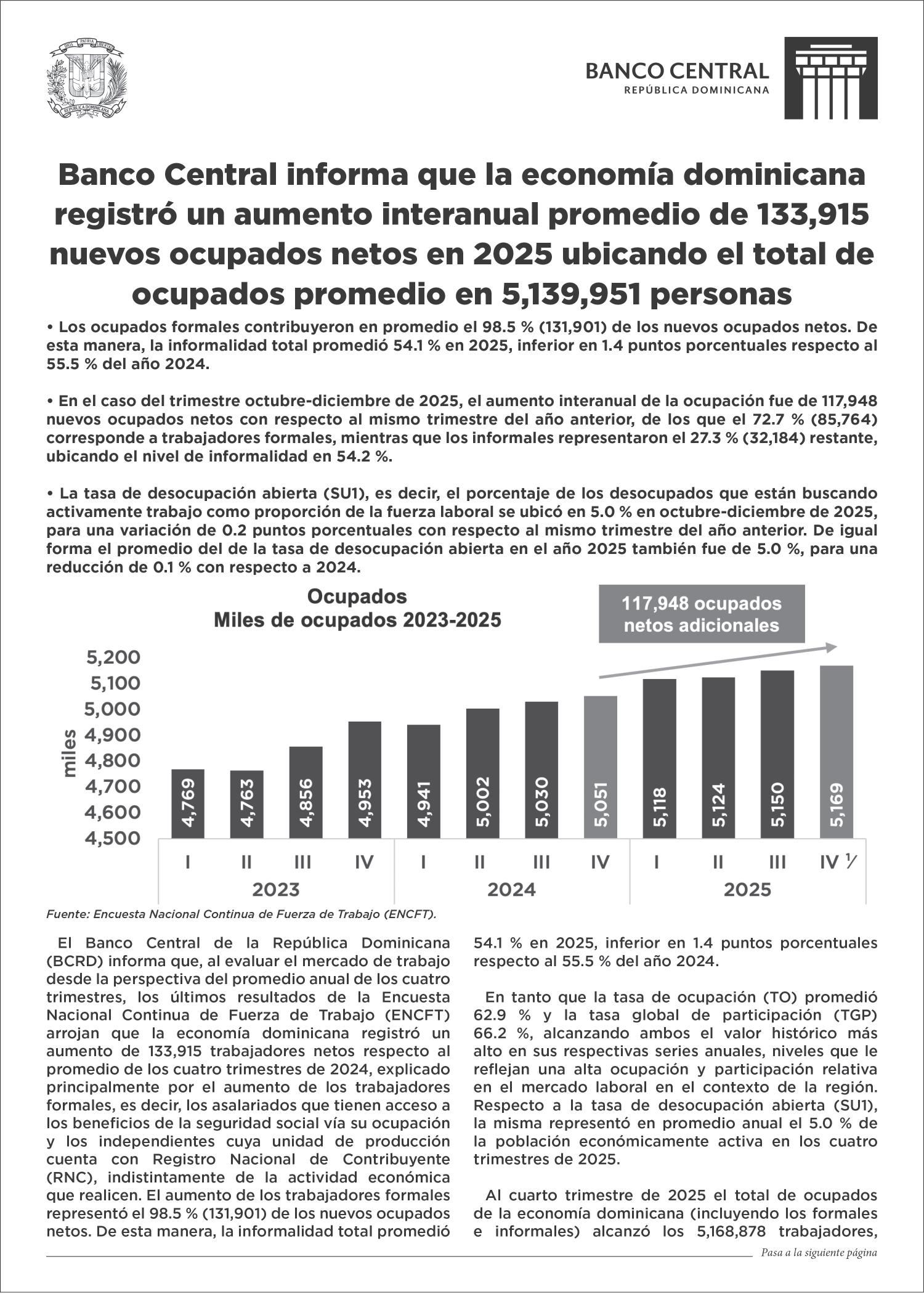 TRABAJO. El total de ocupados promedio es de 5,139,951 personas. El aumento de los trabajadores formales representó el 98.5 %. La informalidad promedió 54.1 %. P.21