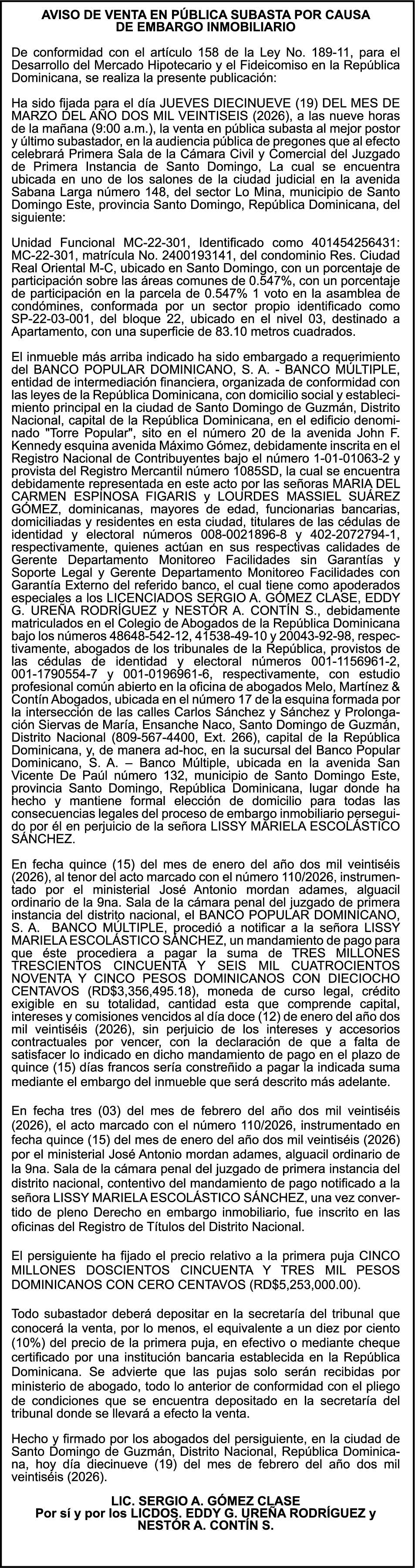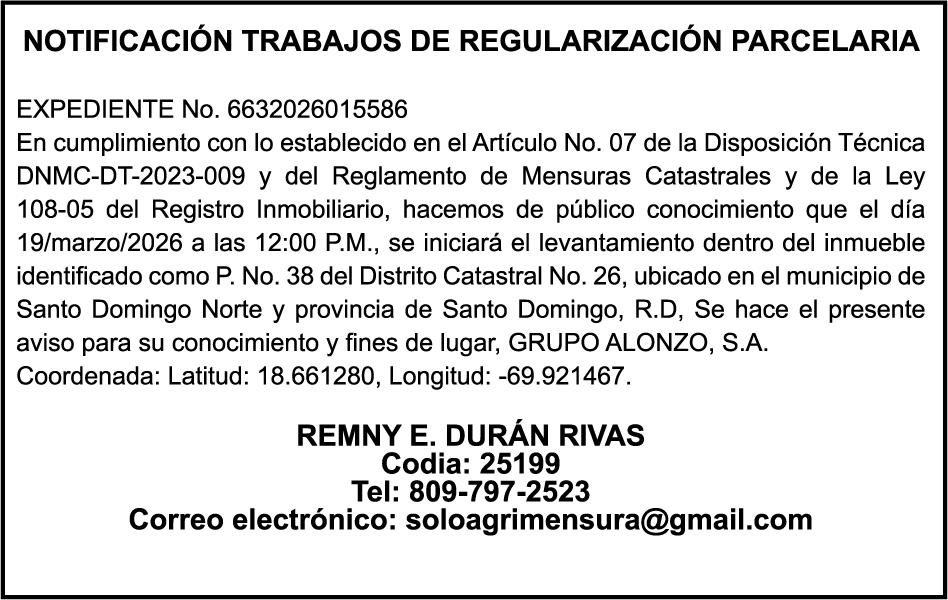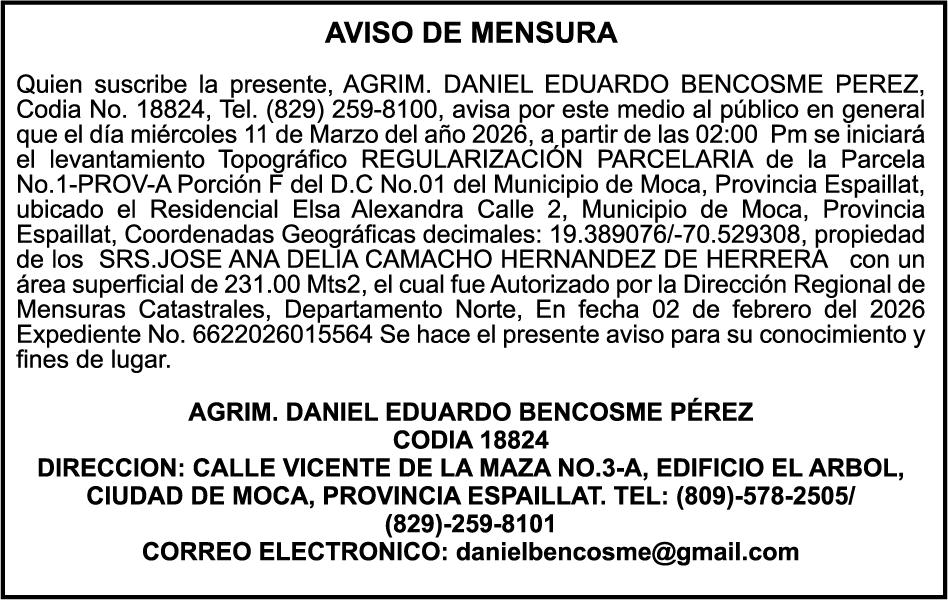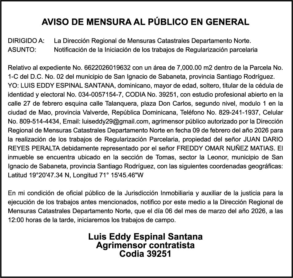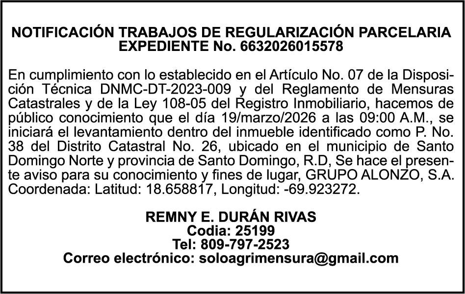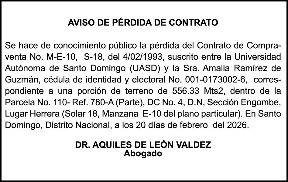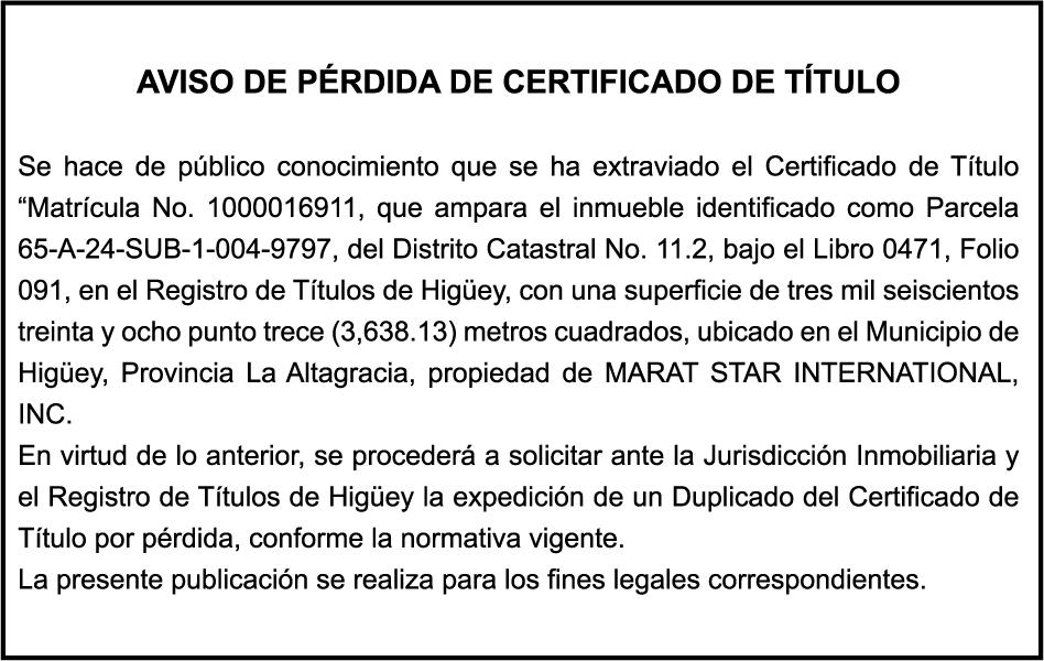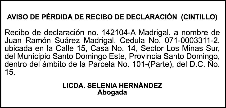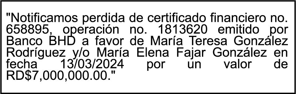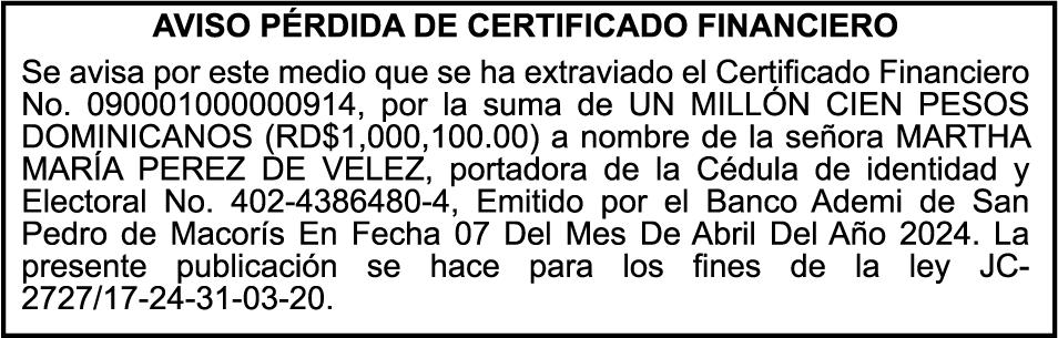 SE hace de público conocimiento la pérdida del Certificado Financiero número 842480444 emitido por Banco Popular Dominicano, S. A. Banco Múltiple, a nombre de QUINTINO VIZCAINO, portador de la Cédula de Identidad y Electoral número 023-0014117-9, certificado número 842480444 expedido el 2 de julio de 2024 por el monto de (RD$20,000,000.00) más intereses generados a la fecha.