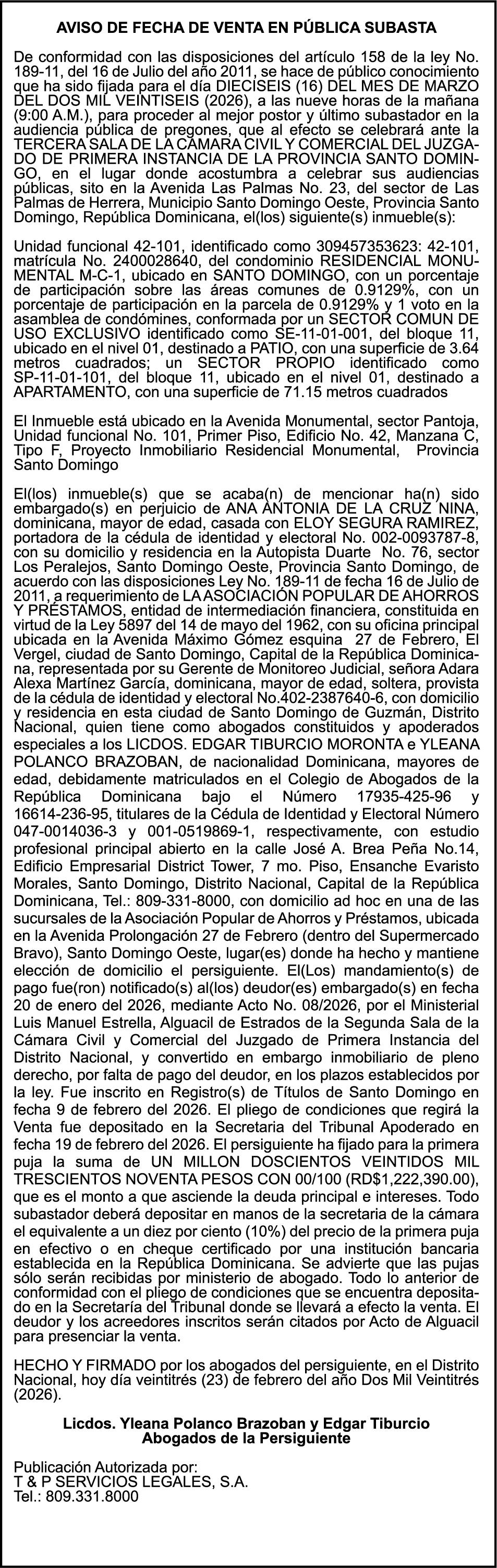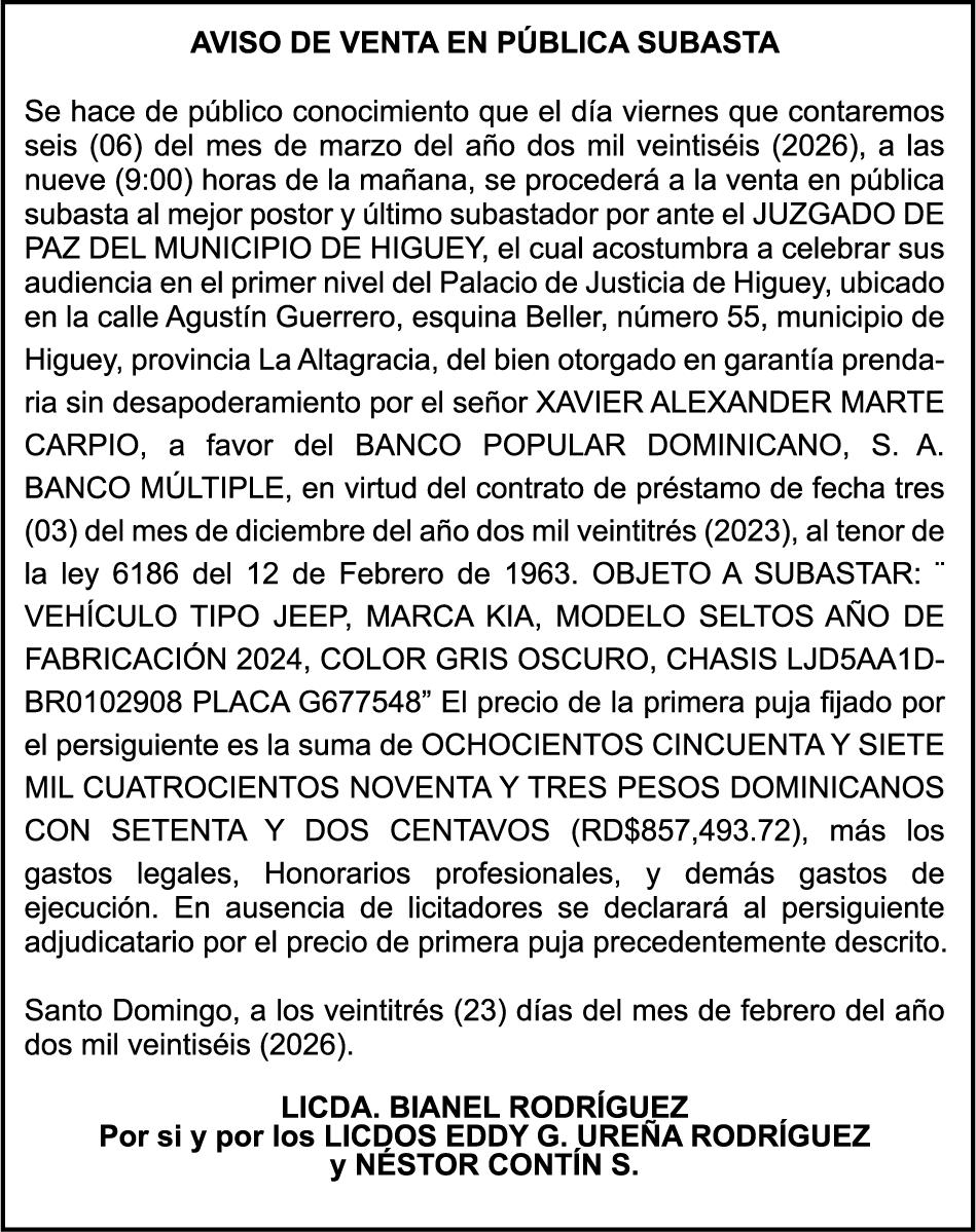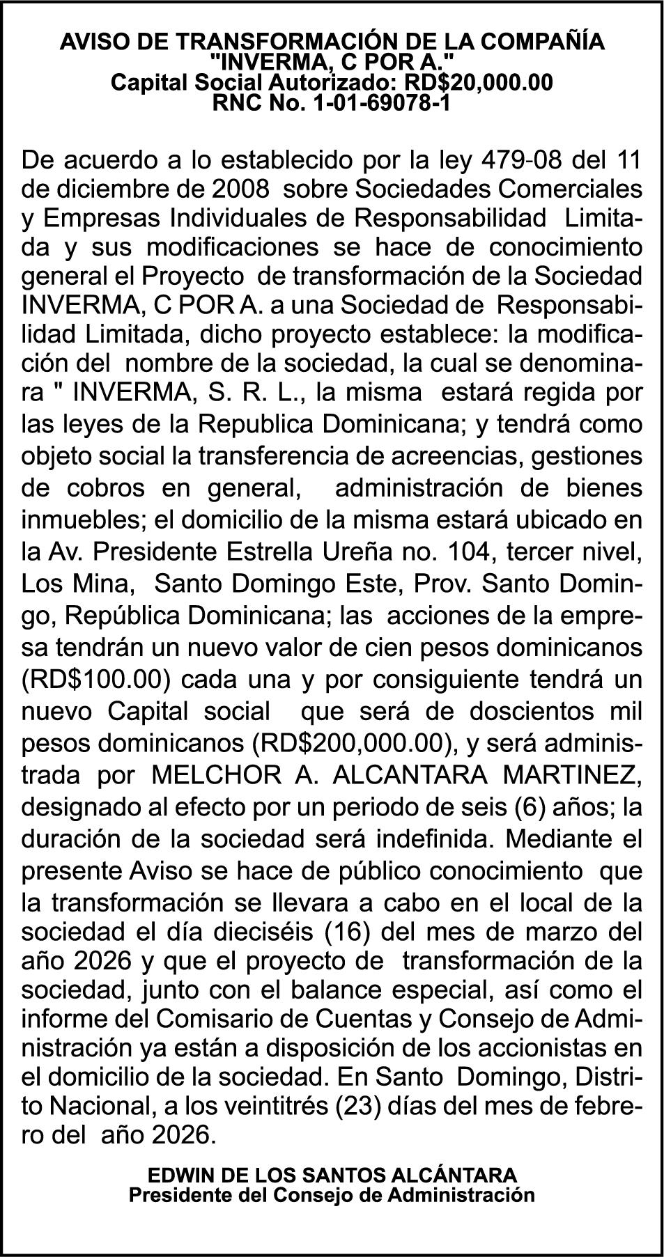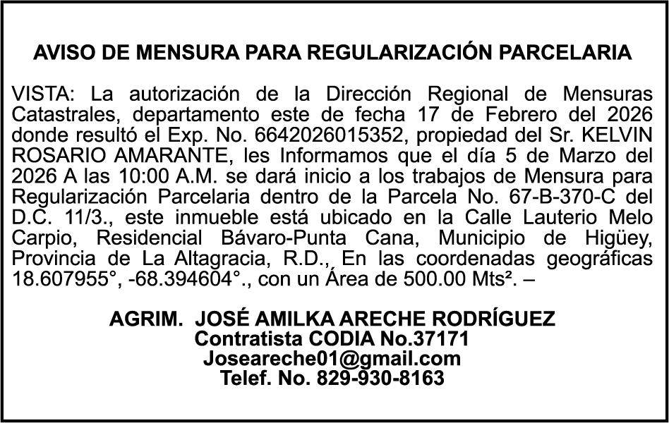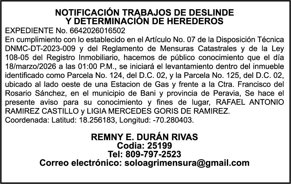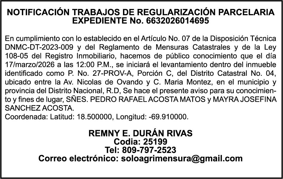 SE hace de público conocimiento la pérdida del Certificado Financiero número 842480444 emitido por Banco Popular Dominicano, S. A. Banco Múltiple, a nombre de QUINTINO VIZCAINO, portador de la Cédula de Identidad y Electoral número 023-0014117-9, certificado número 842480444 expedido el 2 de julio de 2024 por el monto de (RD$20,000,000.00) más intereses generados a la fecha.