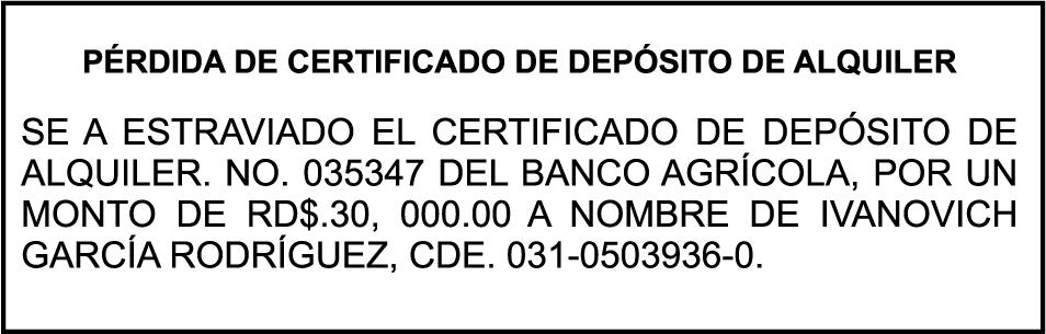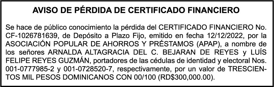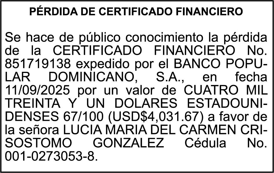 SE hace de público conocimiento la pérdida del Certificado Financiero número 813332822 emitido por Banco Popular Dominicano, S. A. Banco Múltiple, a nombre de ANA MARIA DE FATIMA PIANTINI MUNNIGH, portadora de la Cédula de Identidad y Electoral número 001-0776879-8, certificado número 813332822 expedido en fecha 14 de mayo de 2019 por el monto de (USD$10,498.79) más intereses generados a la fecha.