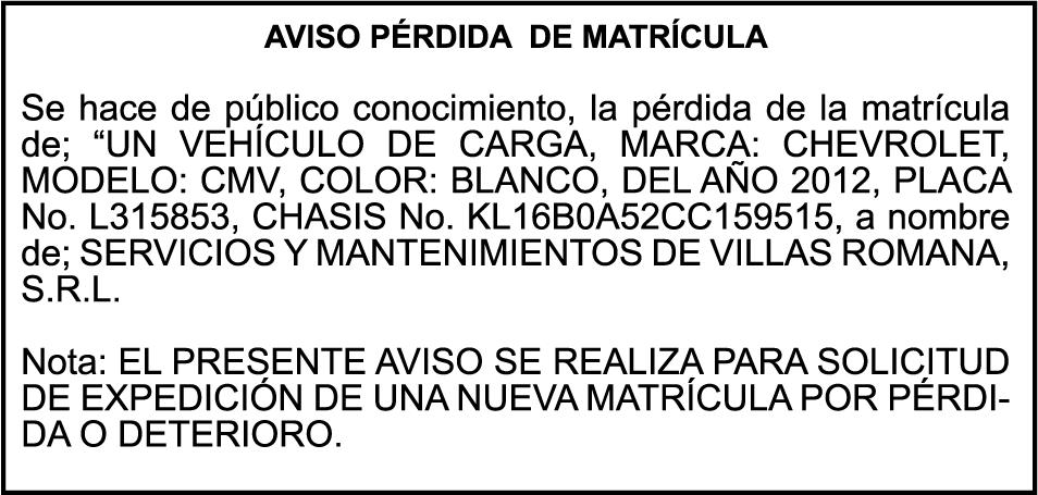 PERDIDA DE PLACA No. AA20458, Automóvil Privado NISSAN, modelo VERSA SV, color negro, año 2018, chasis 3N1CN7AP9JL876382, a nombre de BANCO ORTIMA DE AHORRO Y CREDITO S.A. RNC 1-30-46340-7. PERDIDA DE PLACA DEL VEH. DE CARGA MITSUBISHI ,FE535B6L, 2002, BLANCO, PLACA L086359, CHASIS FE535BA40512, A NOMBRE DE FELIX CANELA DE JESUS. PERDIDA DE PLACA MOTOCICLETA PUBLICA HONDA, Color ROJO, Año 1984, Placa K0070477, Chasis MD902415732, a nombre de NELSON AMAURY LUGO TEJEDA