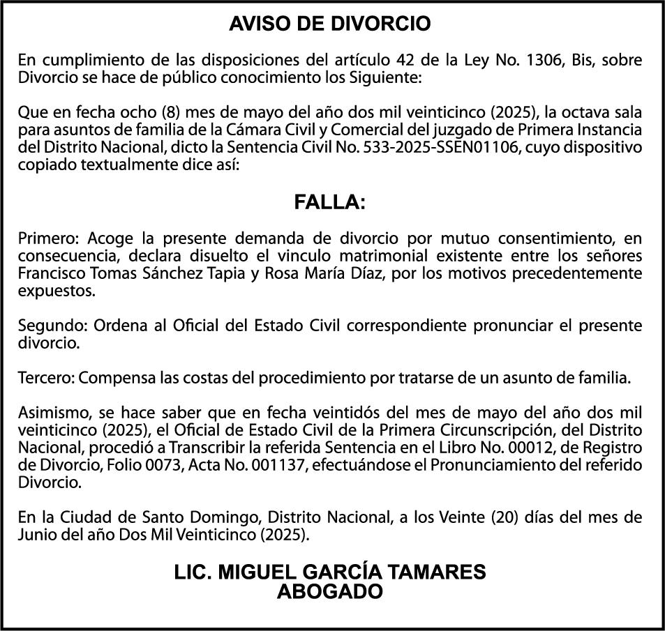 PERDIDA DE MATRICULA Camioneta TOYOTA, color azul, Año 1984, Placa L259299, chasis JT4RM5658F0093728, a nombre de MARTIN DE LA CRUZ OZUNA. PERDIDA DE MATRICULA Motocicleta GATO, color negro, año 2019, placa K0093101, chasis LRPRPLB0XKA001812, a nombre de CARLOS MANUEL GUZMAN, Ced. 40236033870. PERDIDA DE PLACA No. AA78594, Automovil Privado NISSAN, Color NEGRO, Año 2020, Chasis 3N1AB8CV8LY215272, a nombre de YISELIS MARILENNIS MATOS NOVAS DE CABAN.