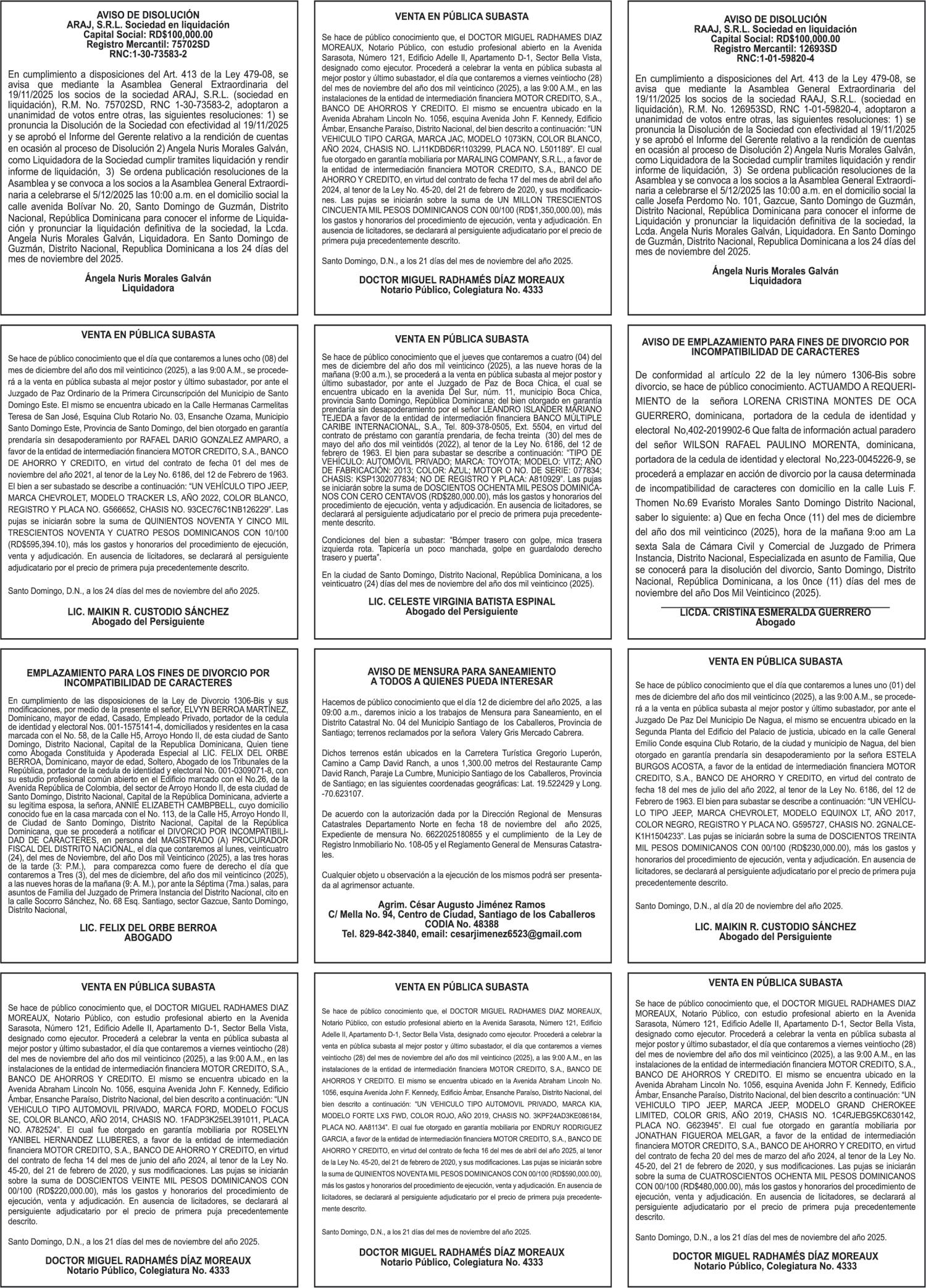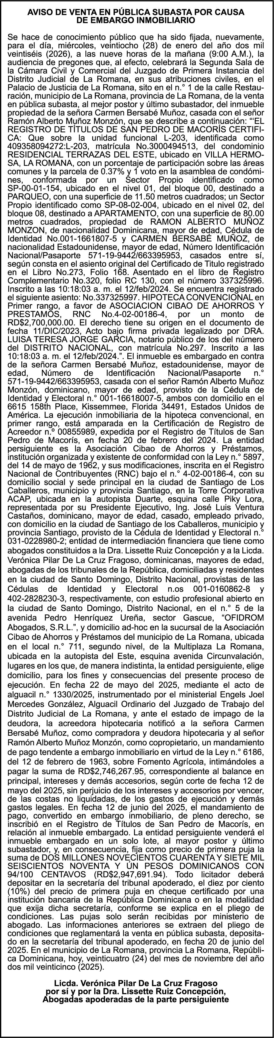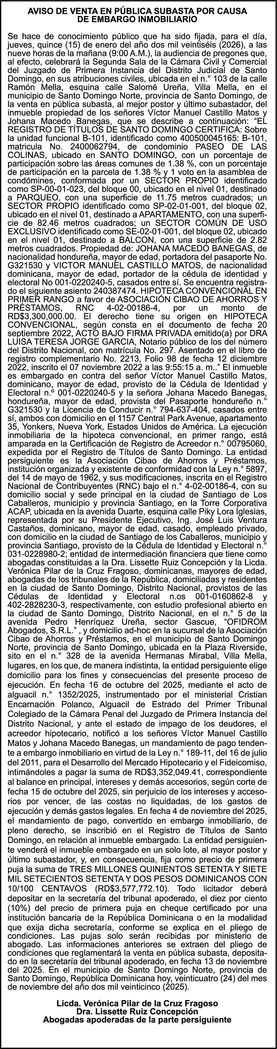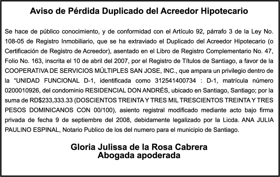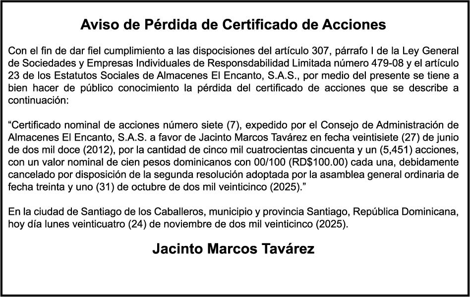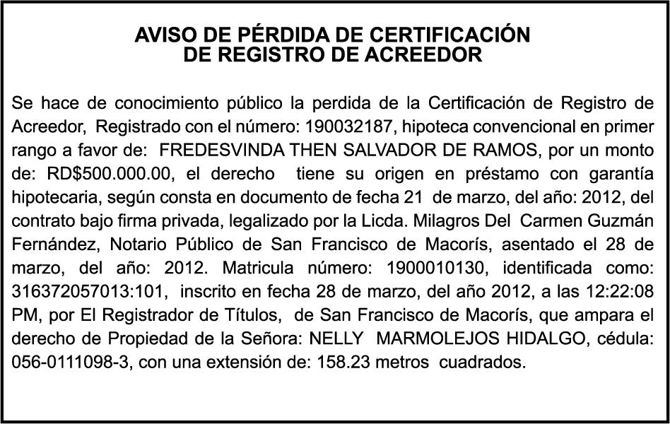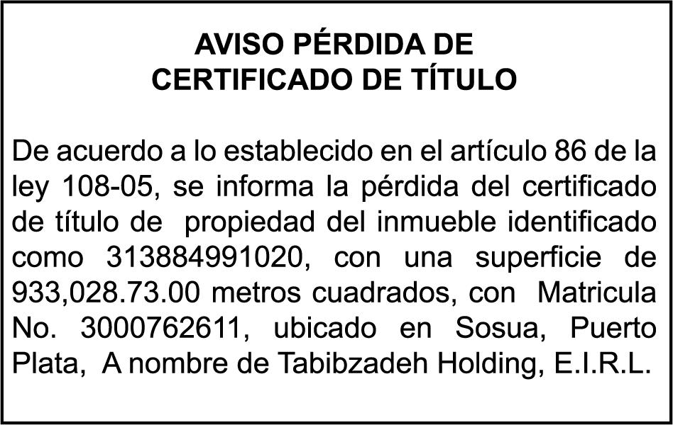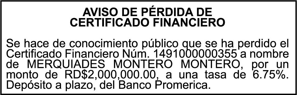 PERDIDA DE MATRICULA Jeep CHEVROLET, modelo TRAVERSE, placa G423686, color negro, año 2018, chasis 1GNER8KW3JJ200417, a nombre de ALEJANDRO ANTONIO HENRIQUEZ ANTUNA. SE hace de público conocimiento la pérdida del Certificado Financiero número 785395500 emitido por Banco Popular Dominicano, S. A. Banco Múltiple, a nombre de LUIS ALBERTO SOTO SERRET, portador de la Cédula de Identidad y Electoral número 001-1417212-5, certificado número 785395500 expedido en fecha 28 de abril del 2014, por el monto de (RD$250,000.00) más intereses generados a la fecha.