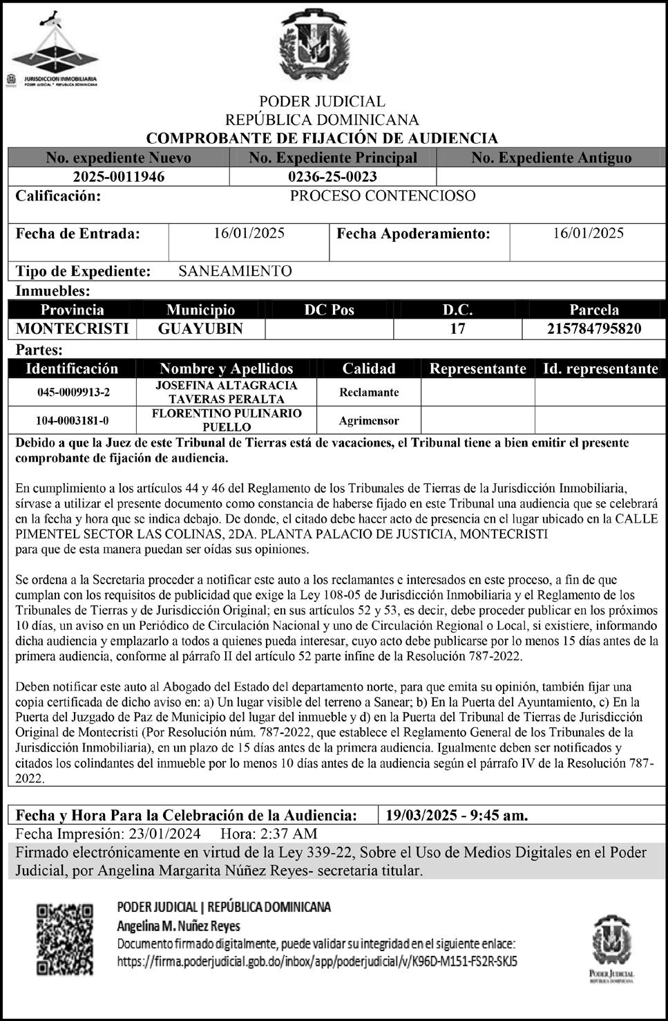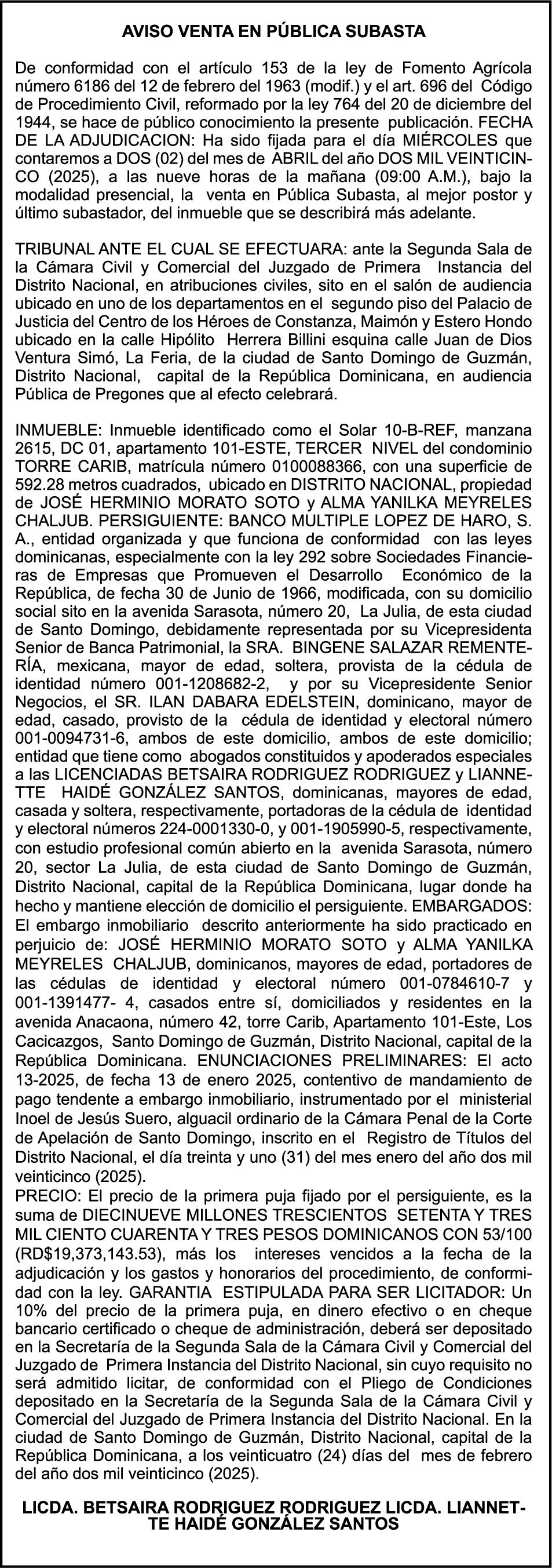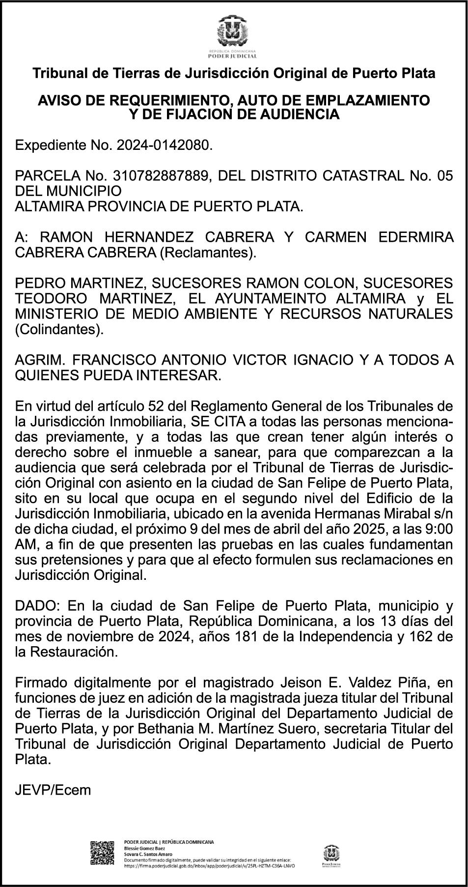 Automovil Privado NISSAN, Color ROJO, Año 2003, Placa A167773, Chasis 3N1CB51S9ZK027730, a nombre de WILLIAM ANTONIO SANTANA MONTERO. AVISO TRASPASO EL SEÑOR. JUAN MARTE DE CASTRO, TRASPASA LA EMBARCACION DE PESCA DE NOMBRE "YOLANDA", MATRICULA. NO. BR-Y9-334, DE 18.0 PIES DE ESLORA, COLOR AZUL Y ROJO, AL SEÑOR. ALEJANDRO FIGARO DISHMEY, COMO NUEVO PROPIETARIO.