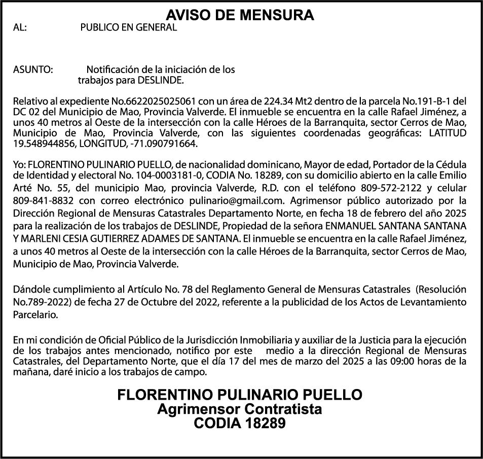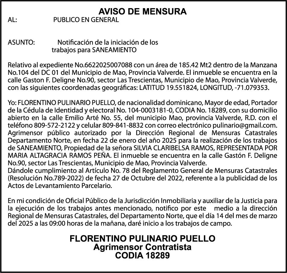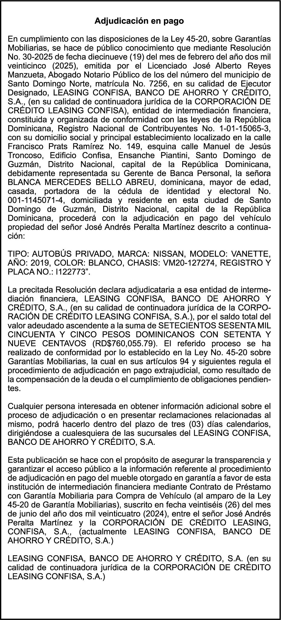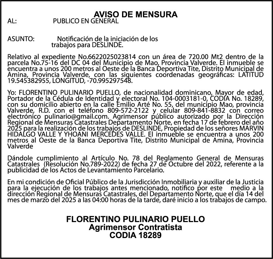 PERDIDA DE PLACA No. L019048, Veh. CARGA MACK, Modelo CH613, Color ROJO, Año 1994, Chasis 1M1AA13Y8RW028471, a nombre de MANOLO ANTONIO MENDEZ MARIÑEZ. PERDIDA DE MATRICULA: De La Motocicleta, Placa NDGHPG439487M, Chasis HA04-5040597, Marca HONDA, Modelo H100, AñO 1988, a nombre de JOSE ALEJANDRO CABRAL SALCEDO, Ced. 03600464360