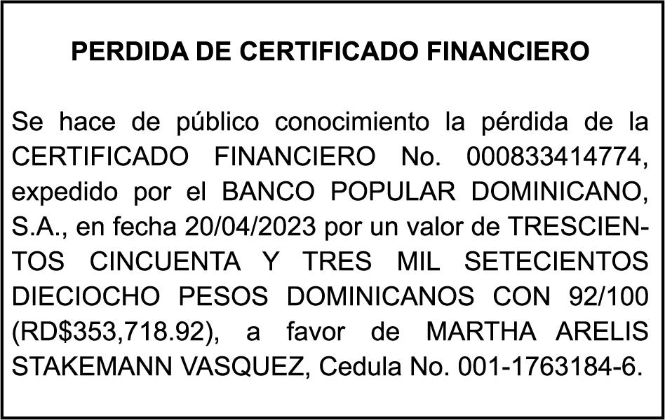 SE hace de público conocimiento la pérdida del Certificado Financiero número 778196659 emitido por Banco Popular Dominicano, S. A., a nombre de DORIS ALTAGRACIA MARTINEZ, portadora de la Cédula de Identidad y Electoral número 001-1133934-7, certificado número 778196659 expedido en fecha 3 de enero del 2013 por el monto de (RD$94,183.54), más intereses generados a la fecha.