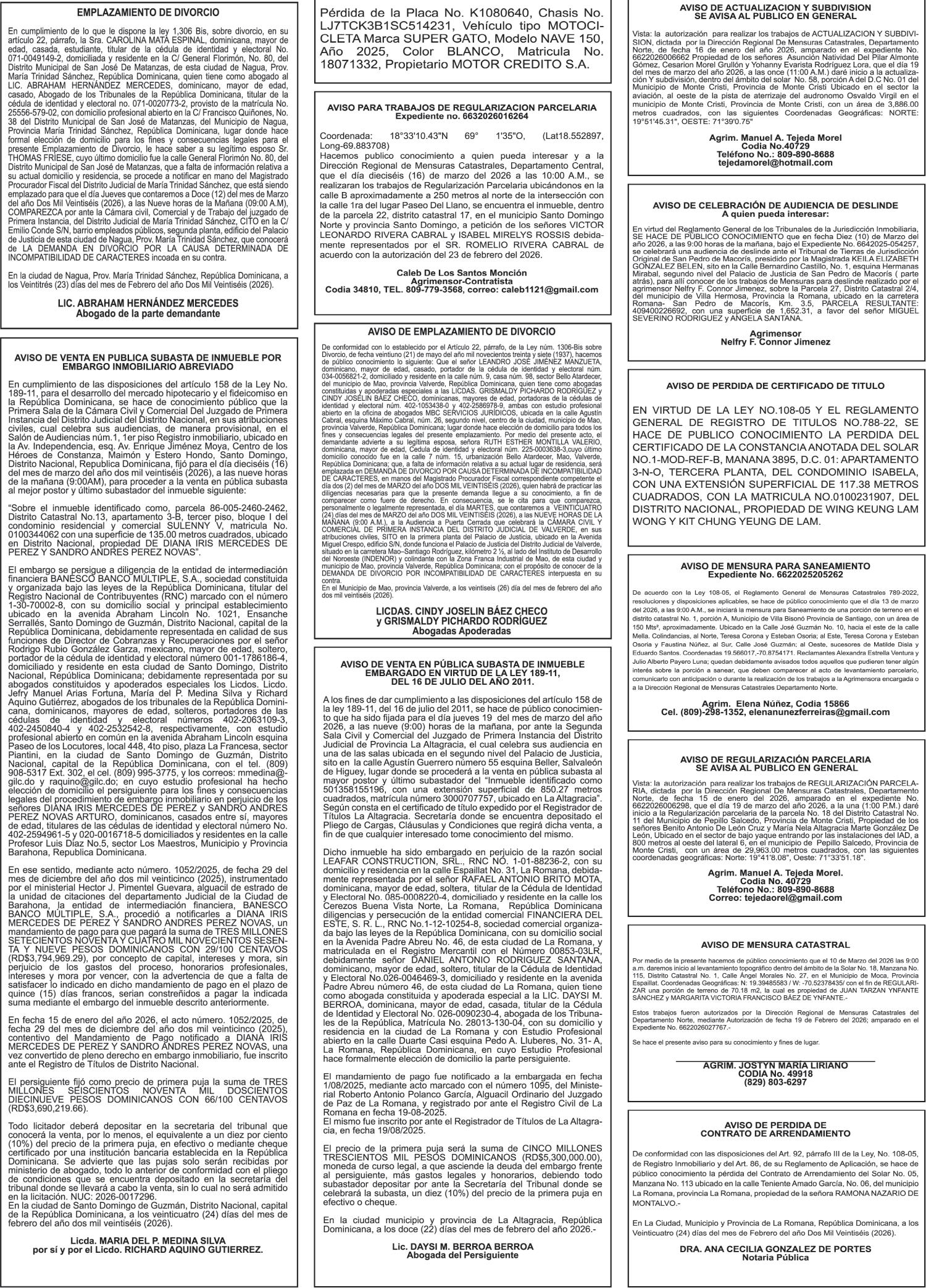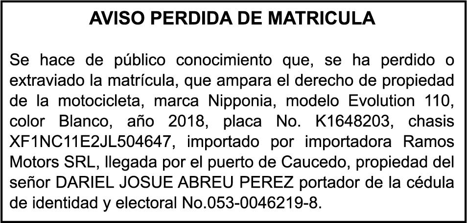PERDIDA DE PLACA No. N245326, Motocicleta YAMAHA, modelo RX-S, color negro, año 2006, chasis MH33HB0086K274028, a nombre de ABDALA RAMIREZ ROMERO, Ced. 031-0009811-4.