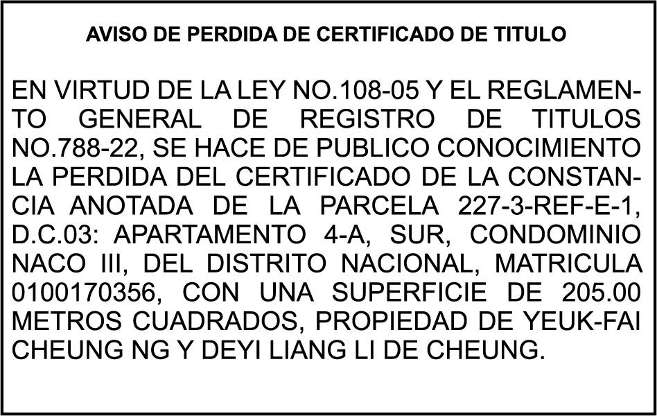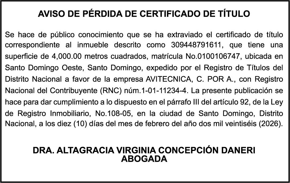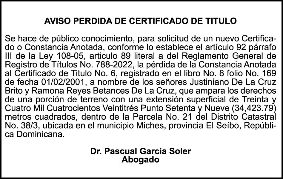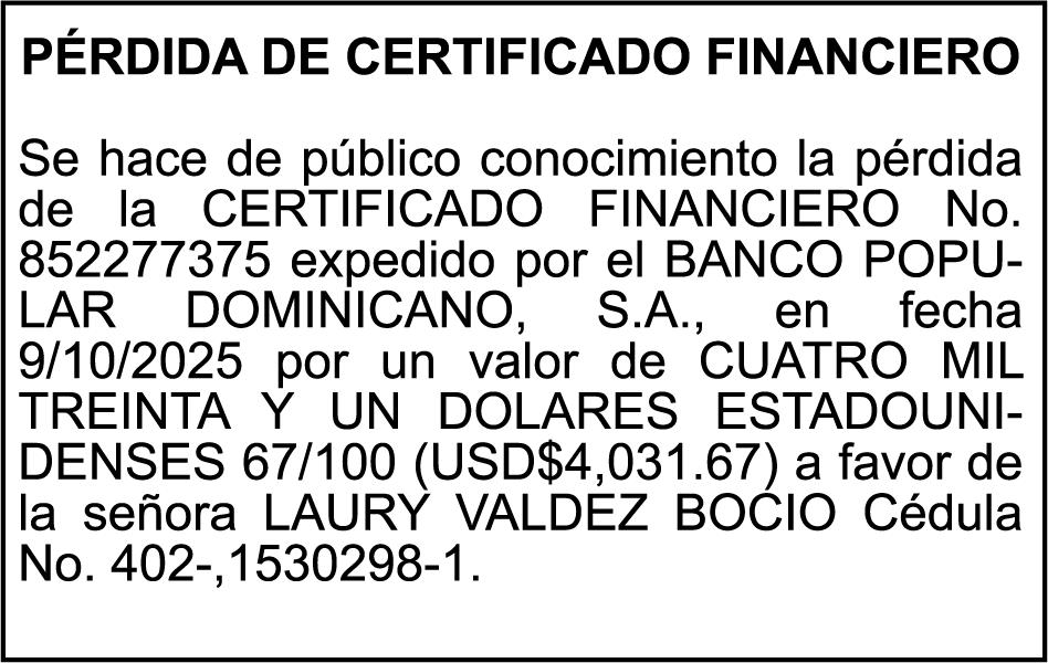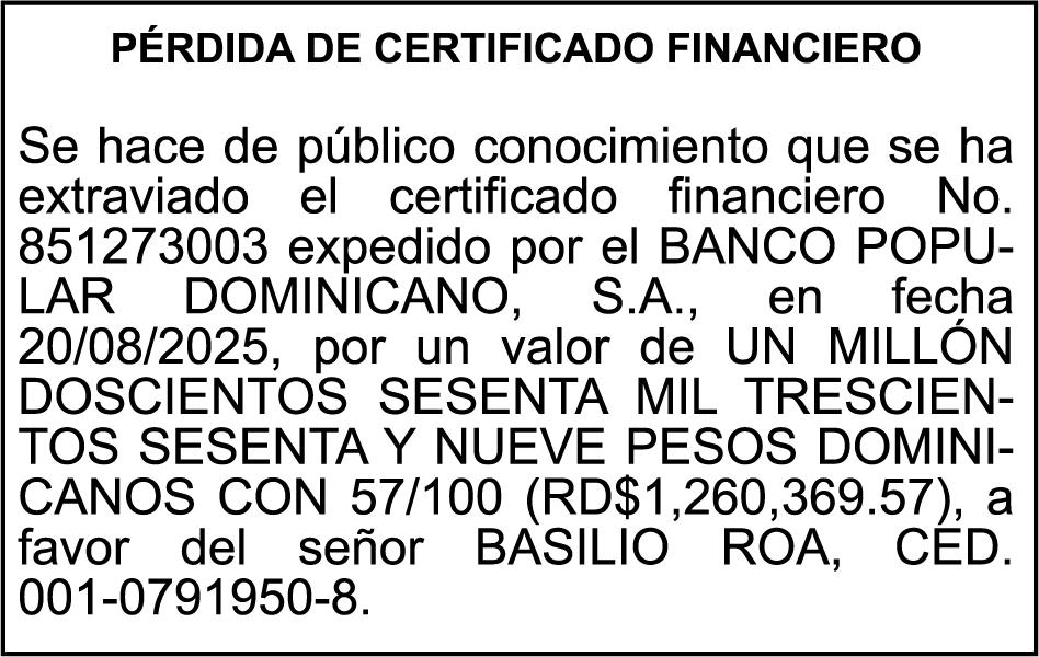 SE hace de público conocimiento la pérdida de Certificados de Acciones Comunes emitidas por Banco Popular Dominicano, S. A. Banco Múltiple, a nombre de ARACELIS ABAD VIDAL, portadora de la Cédula de Identidad y Electoral número 023-0003912-6, código de accionista número 7777, certificado número 107165 expedido en fecha 11/5/2006 total de acciones 215, certificado número 117876 expedido en fecha 4/6/2007 total de acciones 329, certificado número 137043 expedido en fecha 17/6/2010 total de acciones 467, certificado número 145823 expedido en fecha 2/6/2011 total de acciones 140.