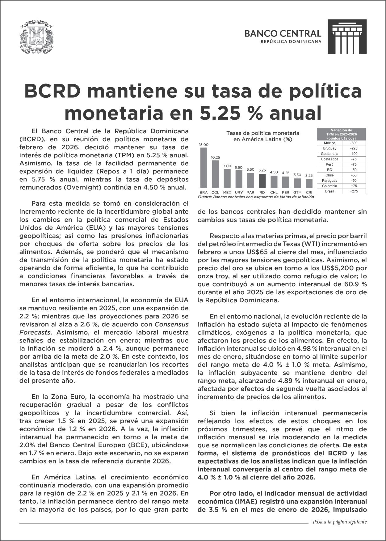 El Banco Central mantiene tasa de política monetaria en 5.25 % anual