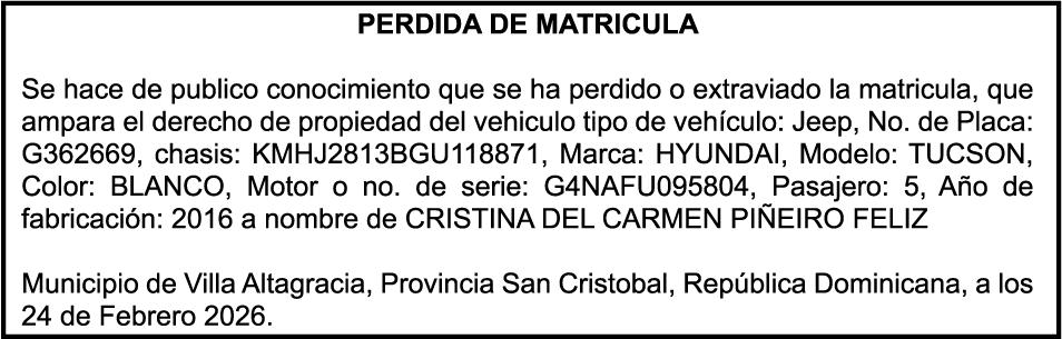 PERDIDA DE MATRICULA JEEP SUZUKI color BLANCO, placa G184019, año 2008, chasis JS3TD54V184106631, a nombre de MAXIMA DEL PERDIDA DE MATRICULAVeh. Carga DAIHATSU, modelo V11 8L HY, color blanco, año 2002, placa L144092, chasis V11613519, a nombre de SINDICATO DE TRANSPORTADORES DE CARGAS DE LOS PUERTOS DE STO.