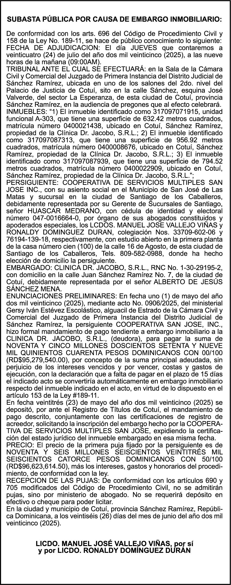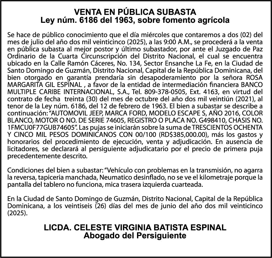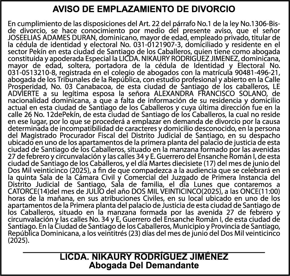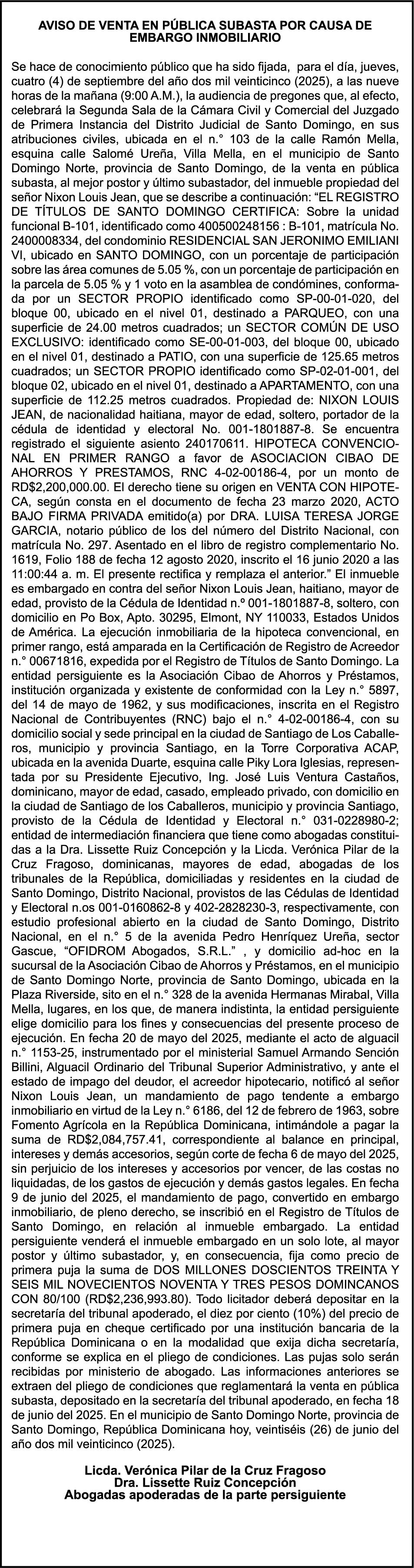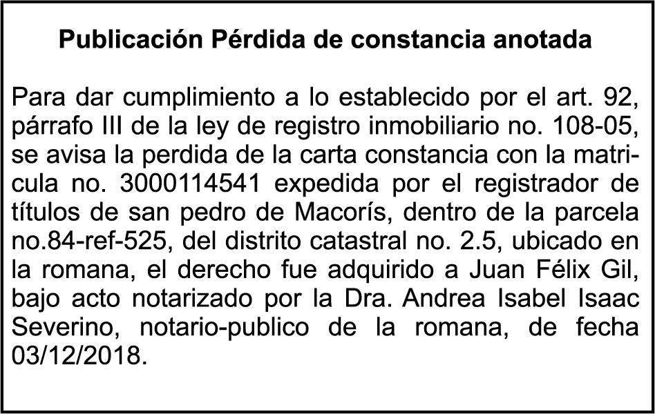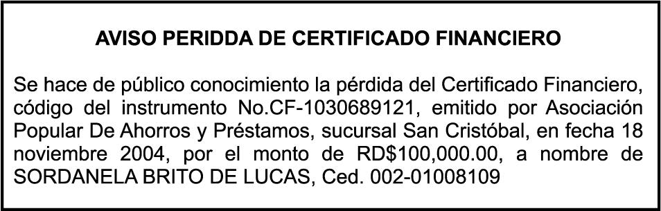 SE hace de público conocimiento la pérdida del Certificado Financiero número 844099580 emitido por Banco Popular Dominicano, S. A., a nombre de CAROLINA MERCEDES ARIAS SANTANA, portadora de la Cédula de Identidad y Electoral número 001-1859343-3 y de ALTAGRACIA SANTANA BAUTISTA, portadora de la Cédula de Identidad y Electoral número 001-0088546-6. certificado número 844099580 expedido en fecha 13 de septiembre de 2024 por el monto de (RD$1,100,000.00), más intereses generados a la fecha.