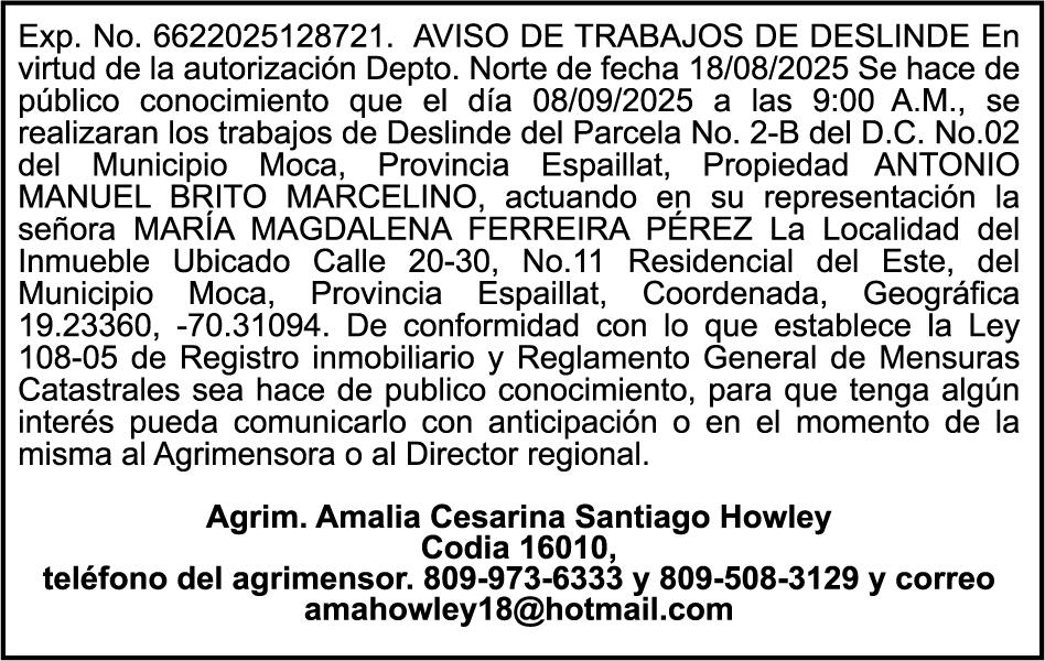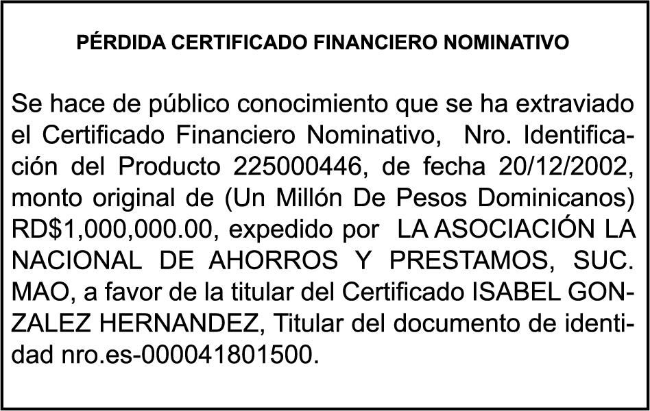 SE hace de público conocimiento la pérdida del Certificado Financiero número 842339996 emitido por Banco Popular Dominicano, S. A. Banco Múltiple, a nombre de EMILIA MICHEL FELIZ, portadora de la Cédula de Identidad y Electoral número 001-0261560-6, certificado número 842339996 expedido en fecha 26 de junio de 2024 por el monto de (RD$402,460.00) más intereses generados a la fecha.