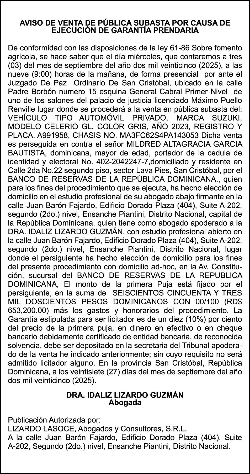 PERDIDA DE PLACA MTOCICLETA MARCA SUZUKI, MODELO AX100, PLACA K2329843,CHASIS LC6PAGA1XN0023719,NUMER O DE MOTOR E50FMGG2G79037, COLOR AZUL, AÑO 2022 A NOMBRE DE JUNIOR AQUINO. PERDIDA DE MATRICULA MOTOCICLETA LONCIN, Placa K1963814, Color PLATEADO, Año 2020, Chasis LLCLT1S00LCK01335, a Nombre de CLARA ROSA BATISTA FORTUNATO.
