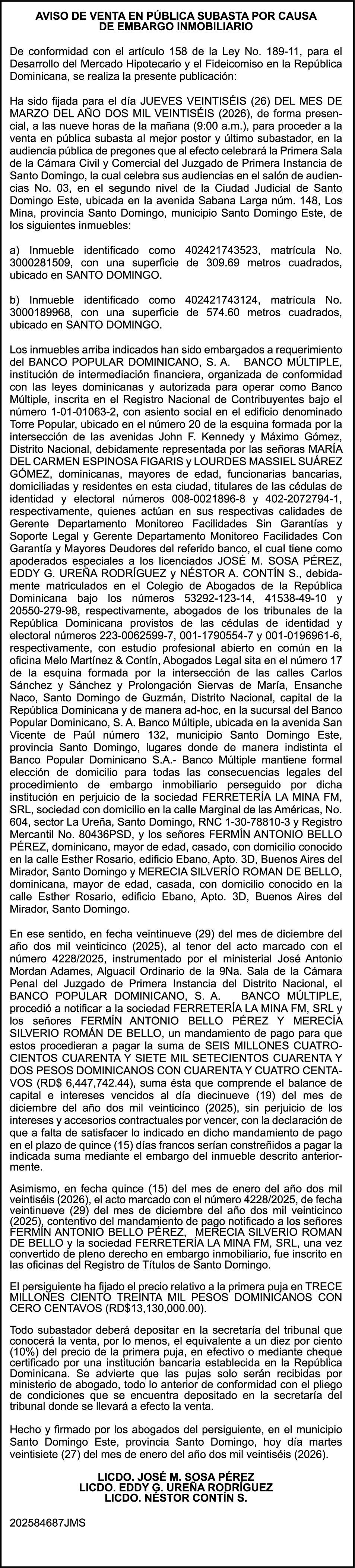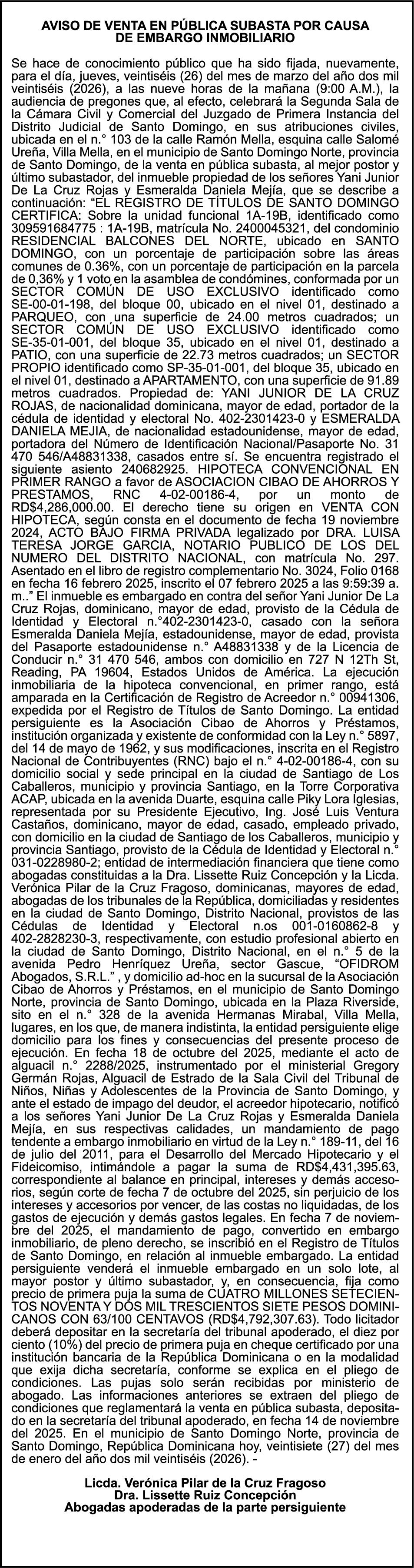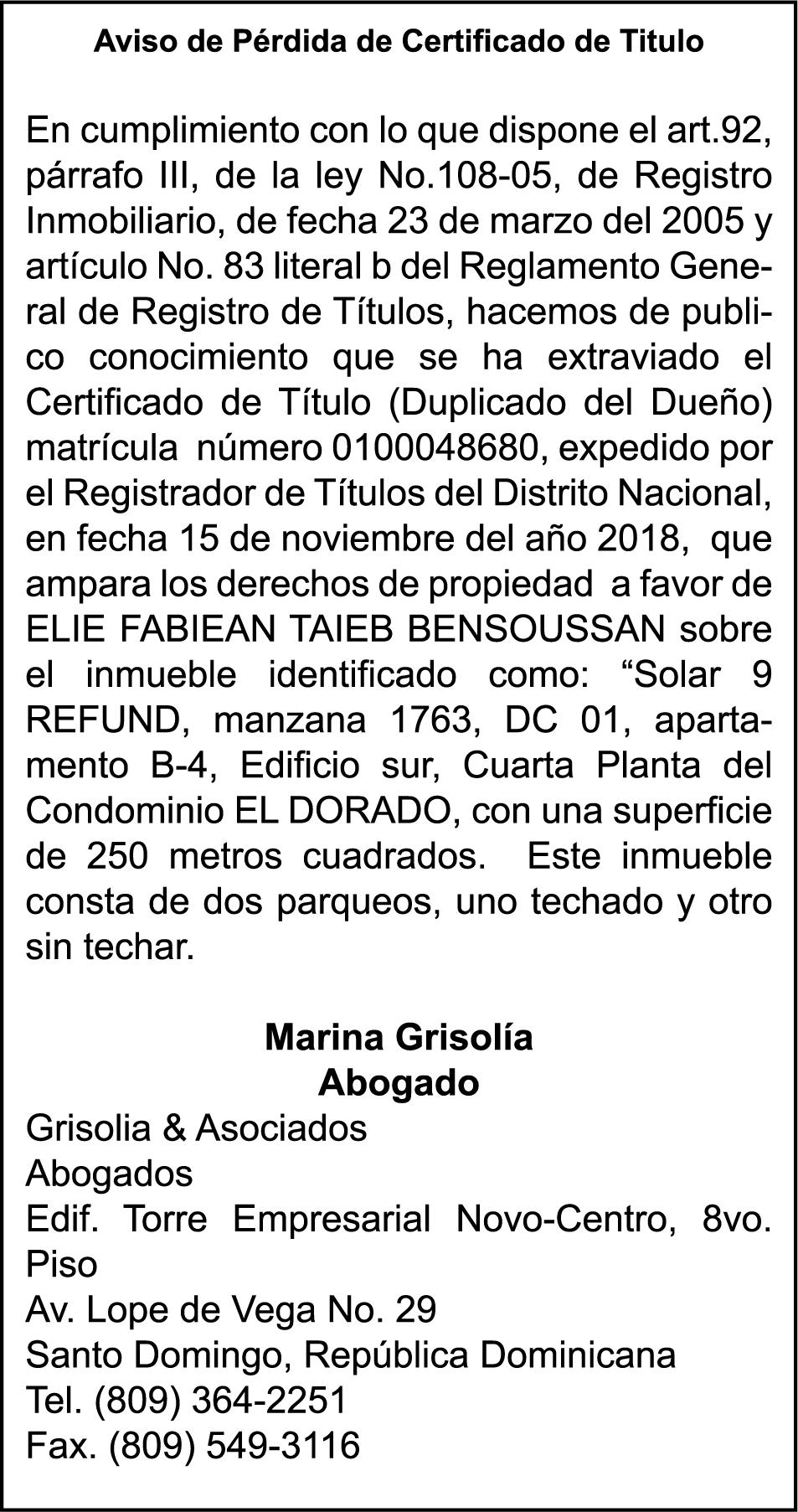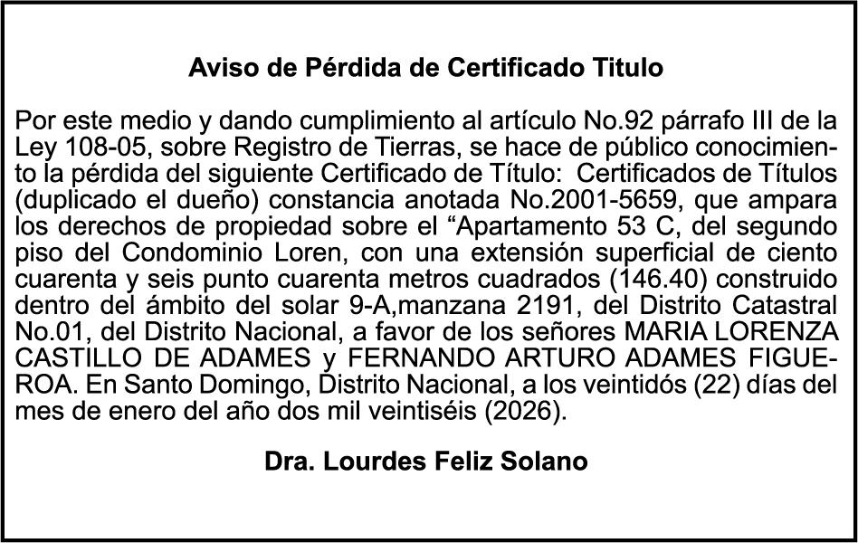 SE hace de público conocimiento la pérdida del Certificado Financiero número 845889815 emitido por Banco Popular Dominicano, S. A. Banco Múltiple, a nombre de NURYS MERCEDES TORRES ROJAS, portadora de la Cédula de Identidad y Electoral número 028-0090028-0, certificado número 845889815 expedido en fecha 9 de diciembre de 2024 por el monto de (RD$500,000.00) más intereses generados a la fecha.