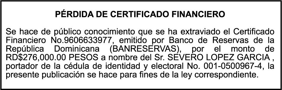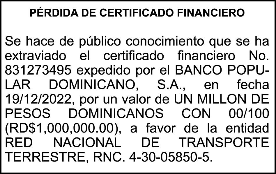 SE hace de público conocimiento la pérdida del Certificado Financiero número 842431983 emitido por Banco Popular Dominicano, S. A. Banco Múltiple, a nombre de HILDE FRANCISCO PAULINO THEN, portador de la Cédula de Identidad y Electoral número 001-0518081-4, certificado número 842431983 expedido en fecha 1 de julio de 2024, por el monto de (RD$1,000,000.00) más intereses generados a la fecha.