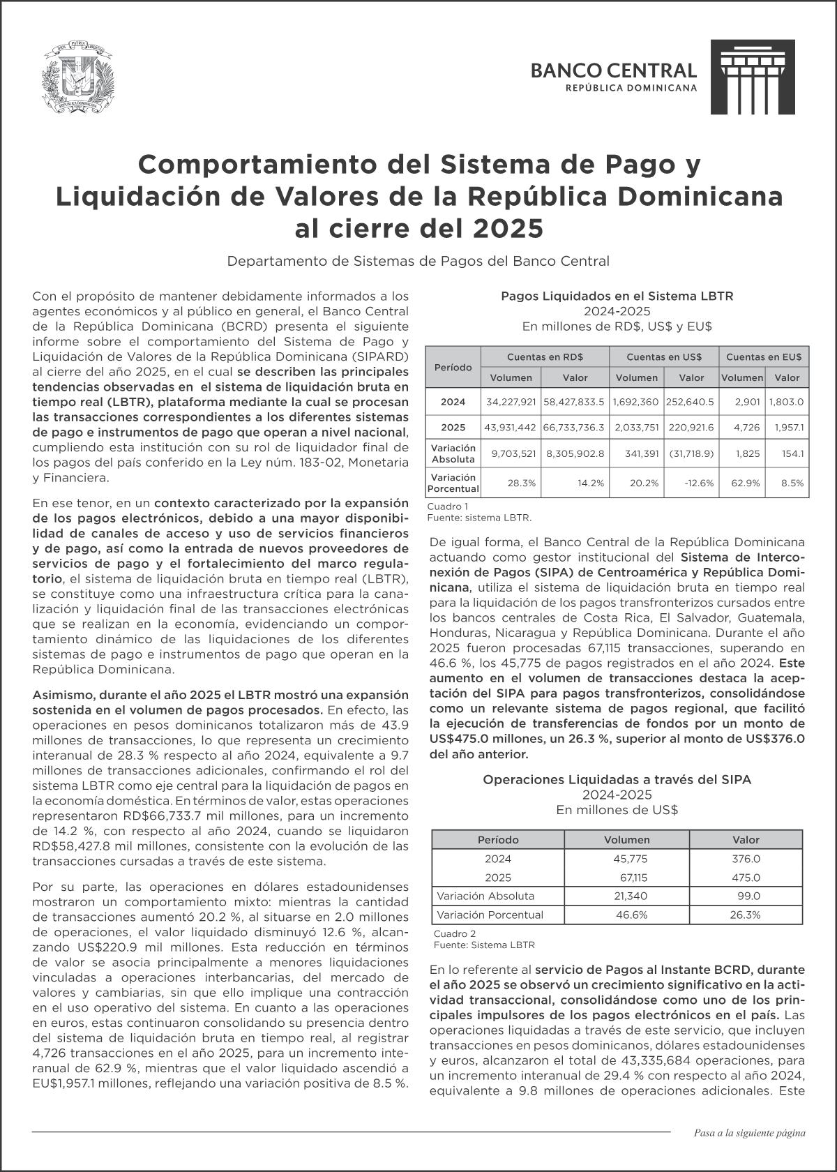 SISTEMA. Durante 2025 el LBTR mostró expansión sostenida en volumen de pagos procesados. Las operaciones en pesos totalizaron más de 43.9 millones de transacciones P. 17