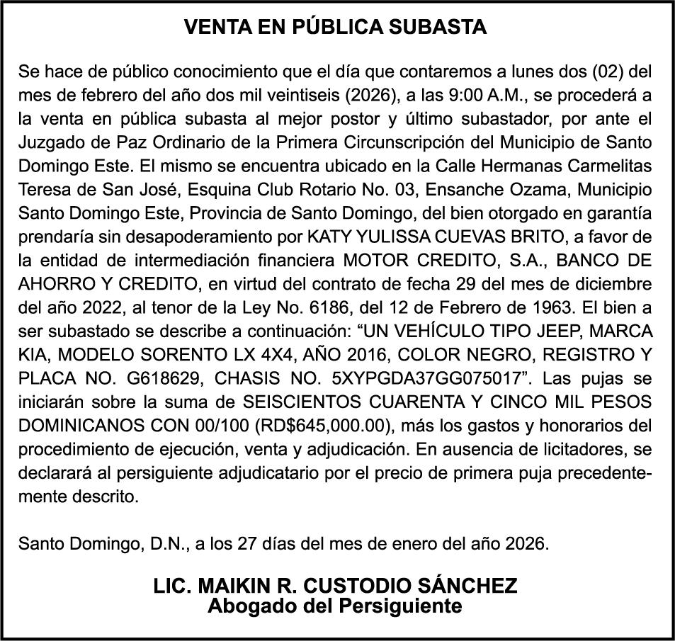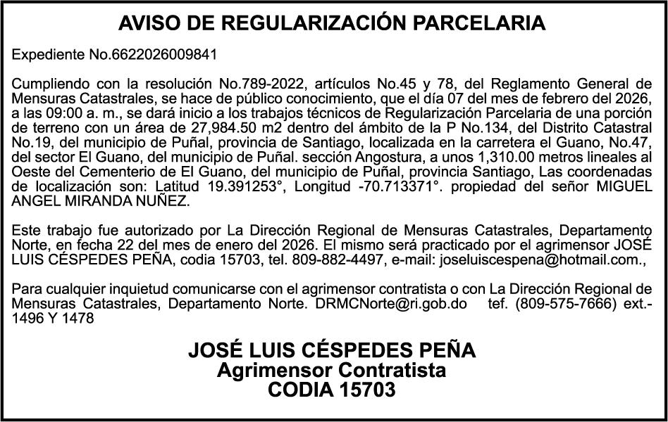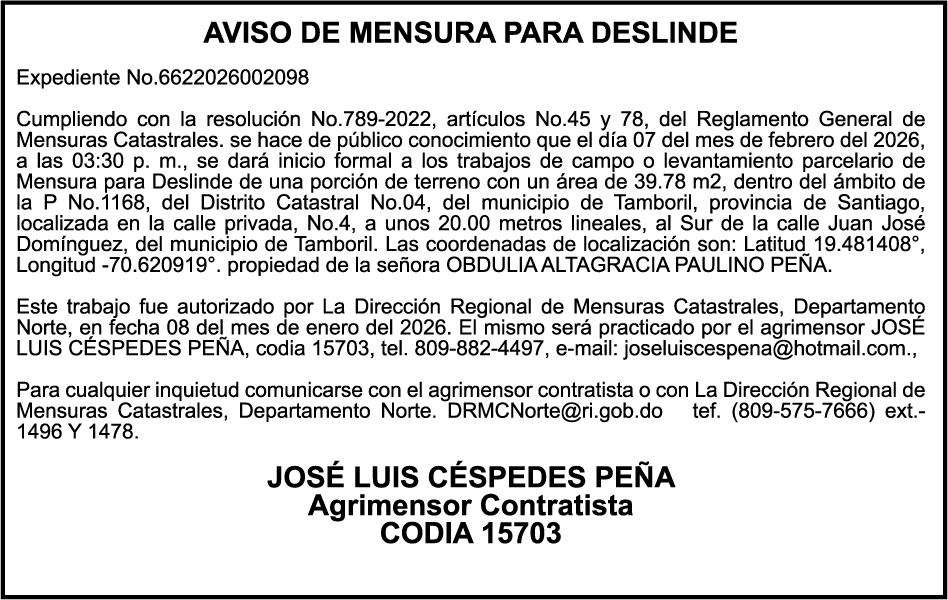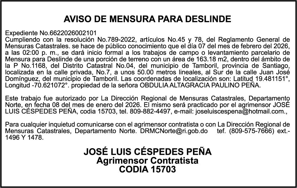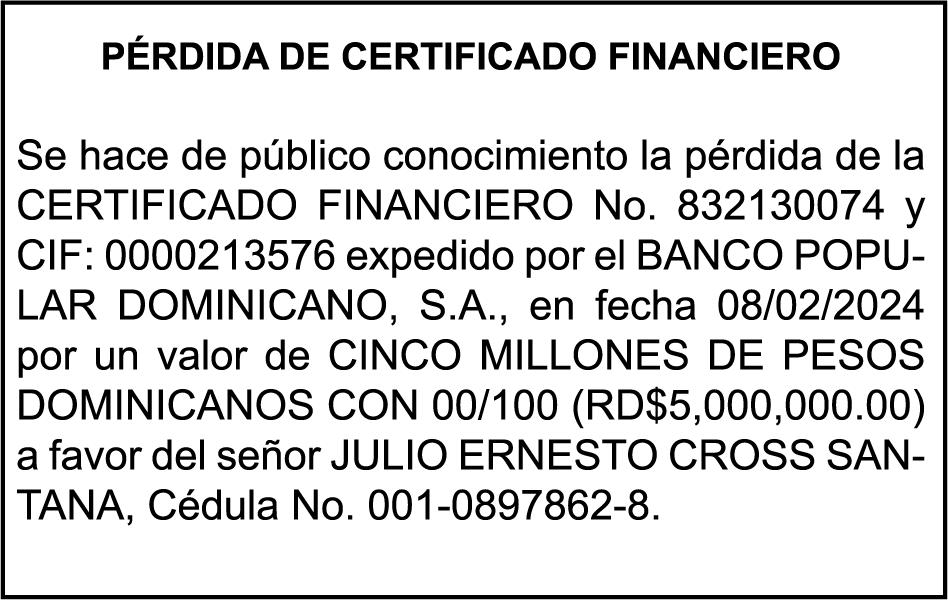 SE hace de público conocimiento la pérdida del Certificado Financiero número 842432163 emitido por Banco Popular Dominicano, S. A. Banco Múltiple, a nombre de HILDE FRANCISCO PAULINO THEN, portador de la Cédula de Identidad y Electoral número 001-0518081-4, certificado número 842432163 expedido en fecha 1 de julio de 2024, por el monto de (RD$300,000.00) más intereses generados a la fecha.