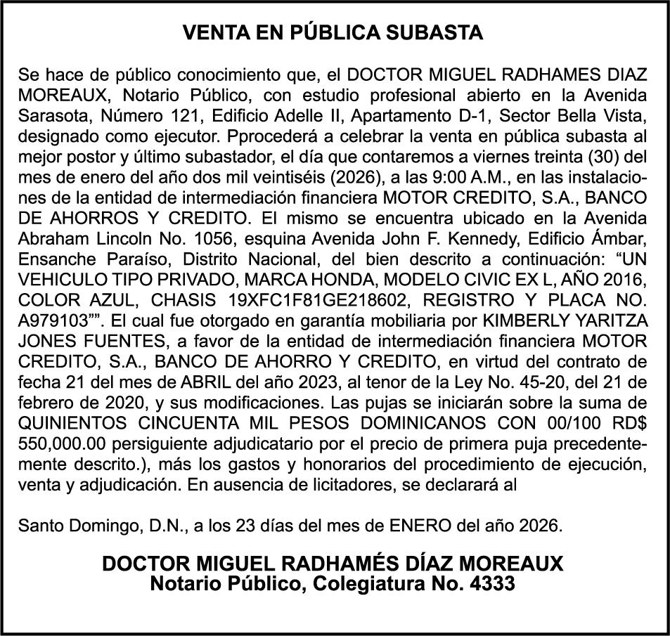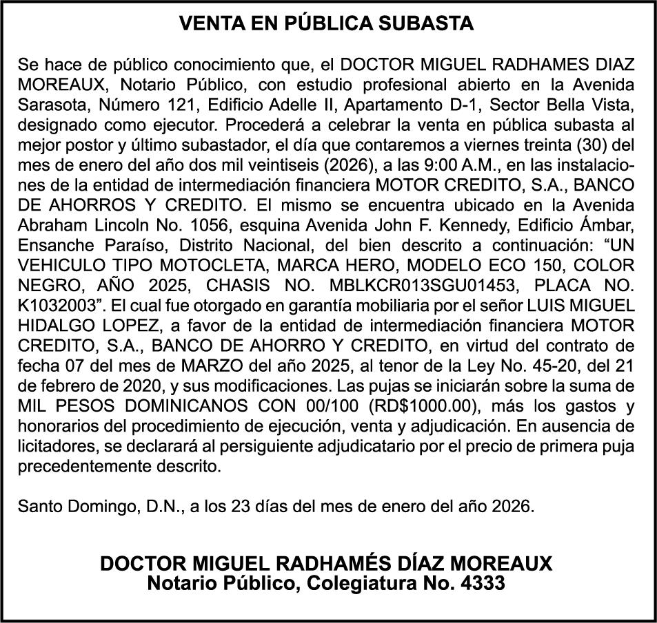 PERDIDA DE PLACA motocicleta HAOJE,MODELO XPRESS,AÑO 2025,PLACA K2691311,COLOR NEGRO,CHASIS LC6PCJBJ8S0010064 A NOMBRE DE INVERSIONES HNOS HERNANDEZ S R L PERDIDA DE PLACA No. K1348904, Motocicleta HONDA, modelo C50, color azul, año 1994, chasis AA011050106, a nombre de EGGY ANYELIAN VARGAS RODRIGUEZ, Ced. 033-0041832-8.