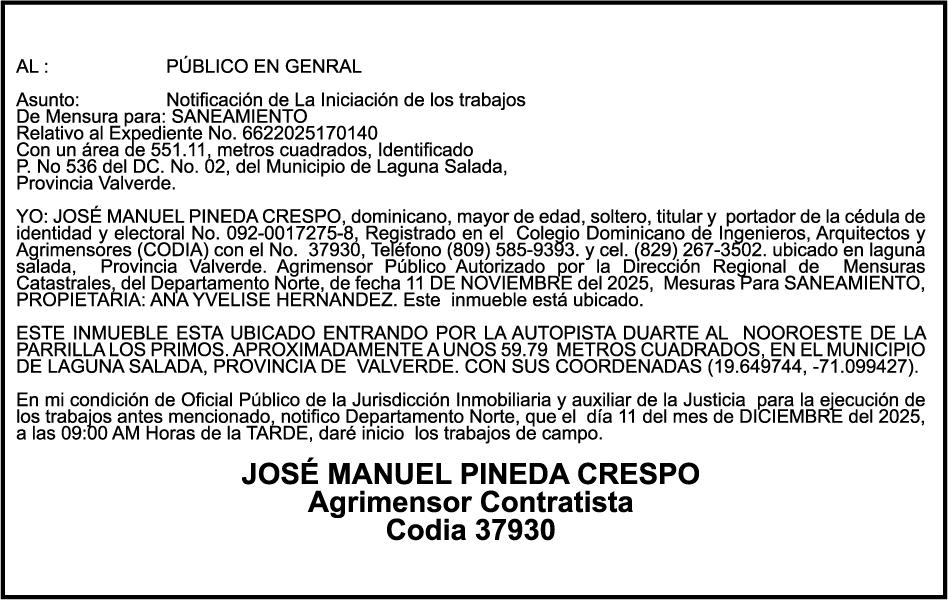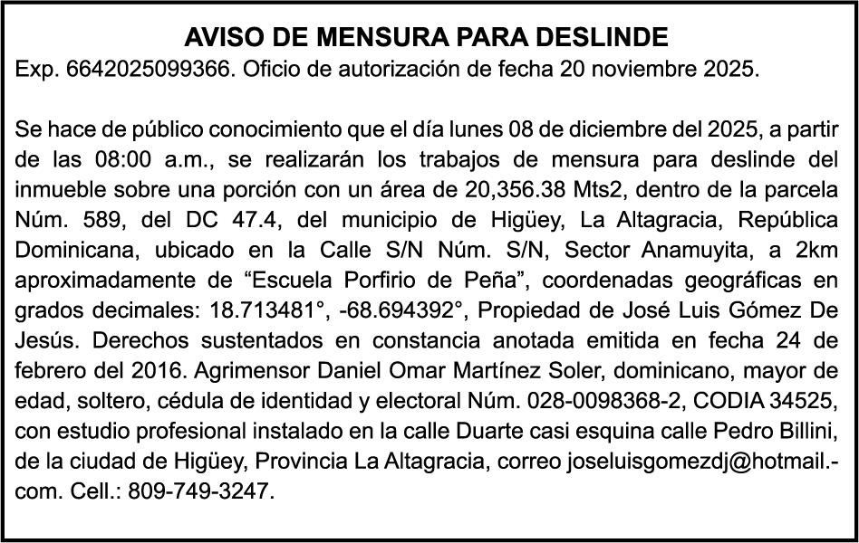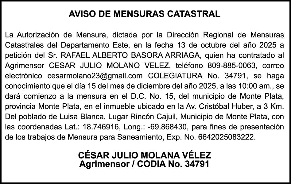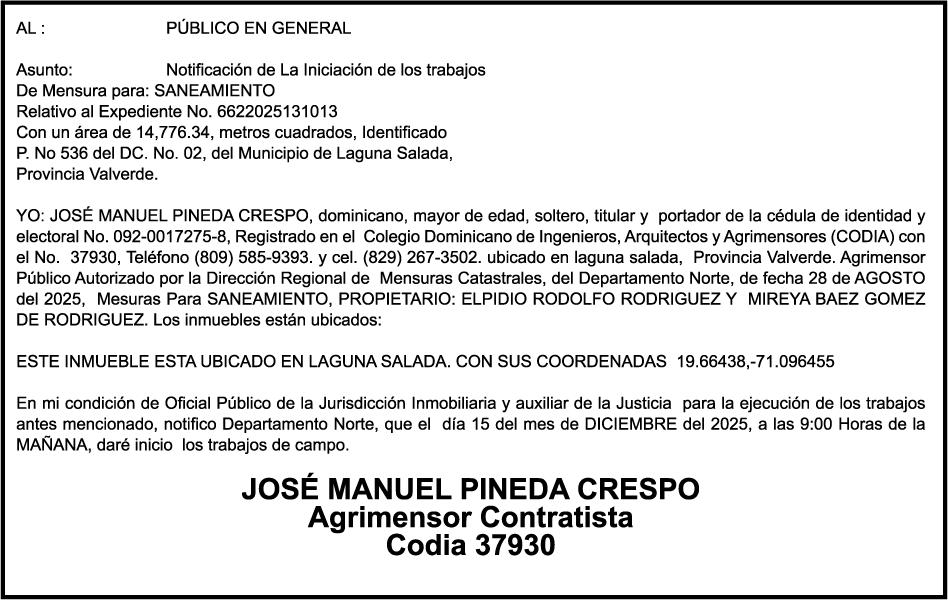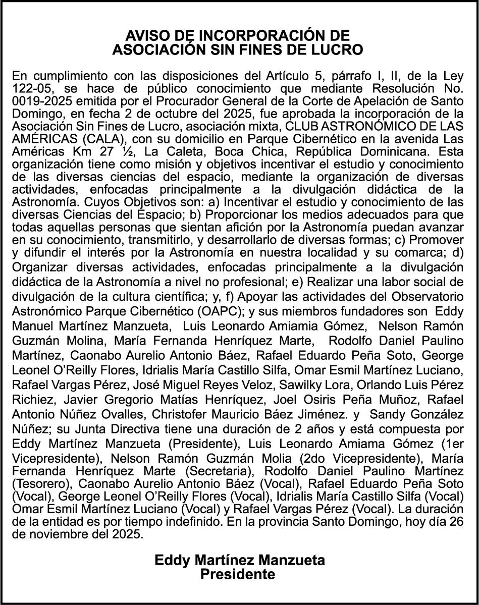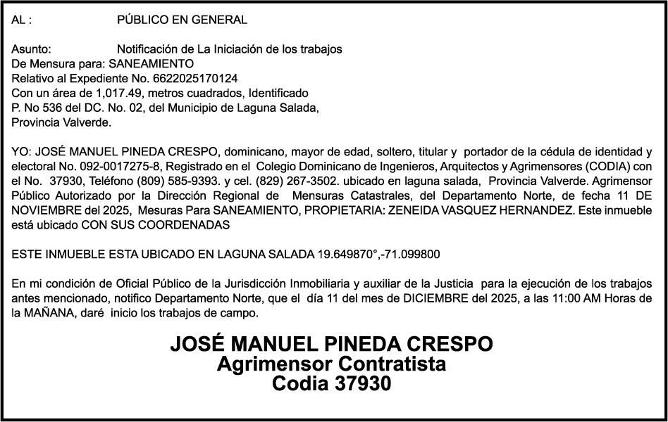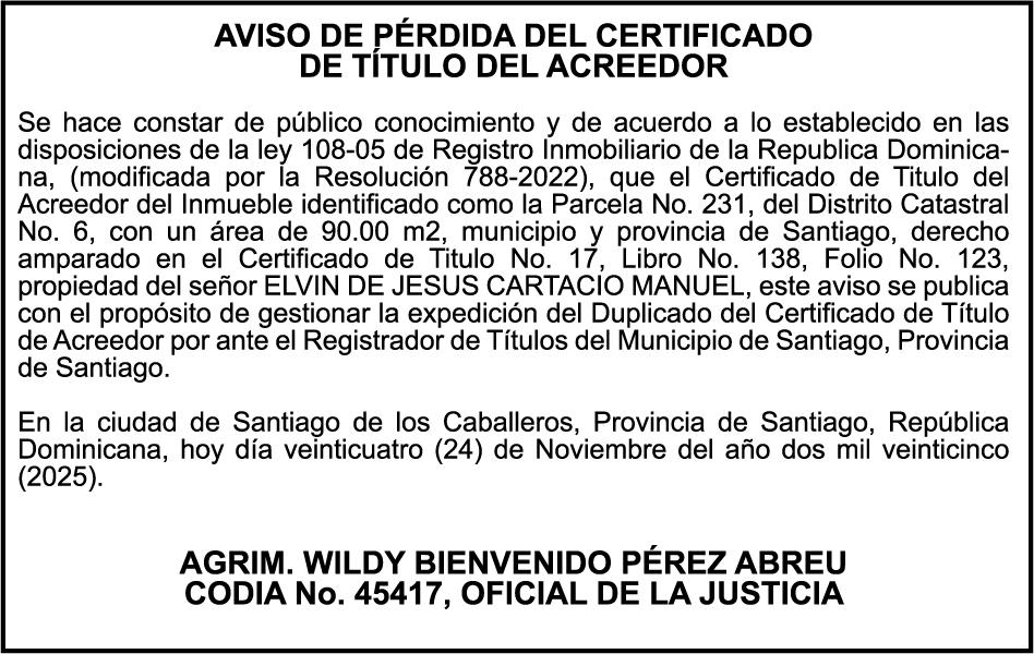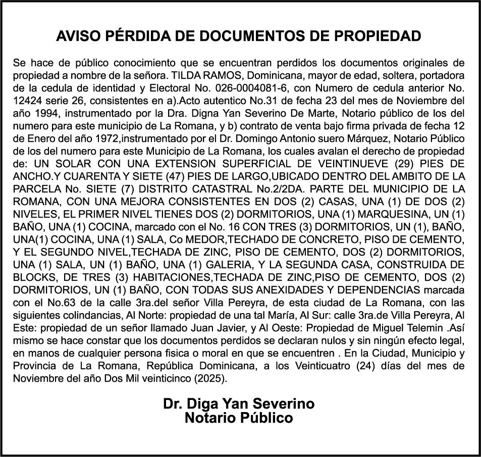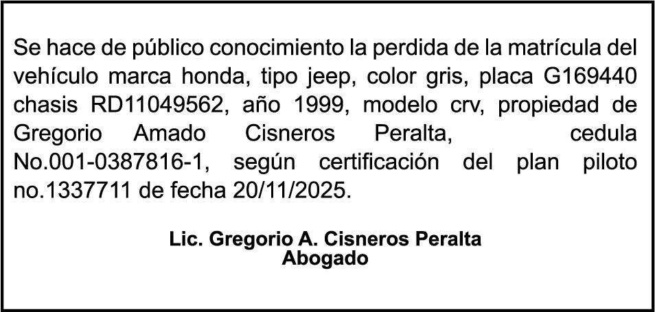 SE hace de público conocimiento la pérdida del Certificado Financiero número 850996554 emitido por Banco Popular Dominicano, S. A. Banco Múltiple, a nombre de ALBERTO CHALAS MARTINEZ, portador de la Cédula de Identidad y Electoral número 001-0595338-4, certificado número 850996554 expedido en fecha en fecha 7 de agosto de 2025 por el monto de (RD$3,000,000.00) más intereses generados a la fecha.