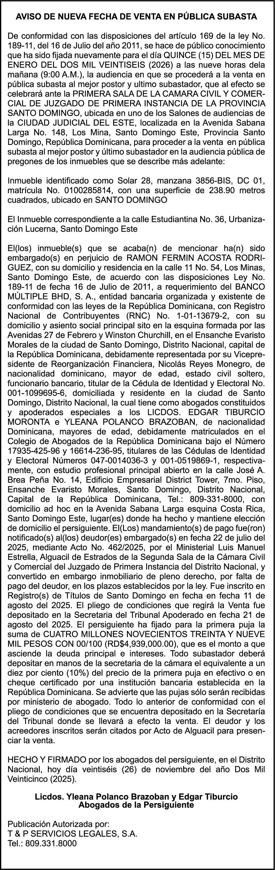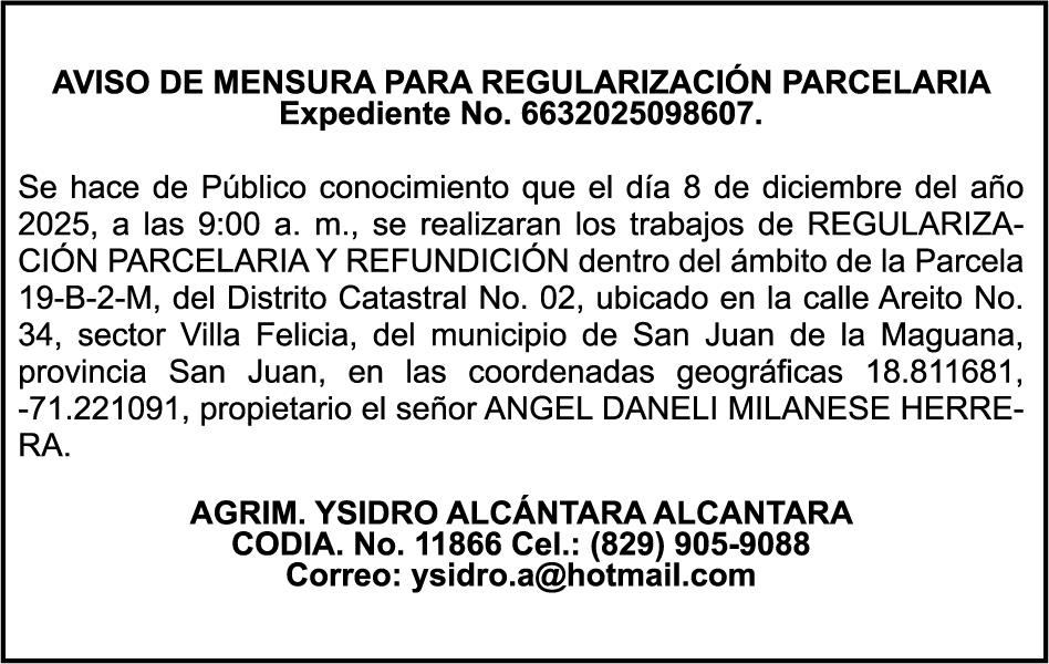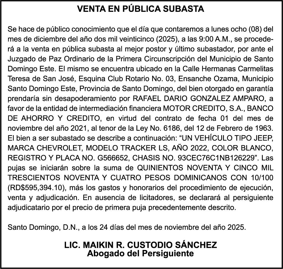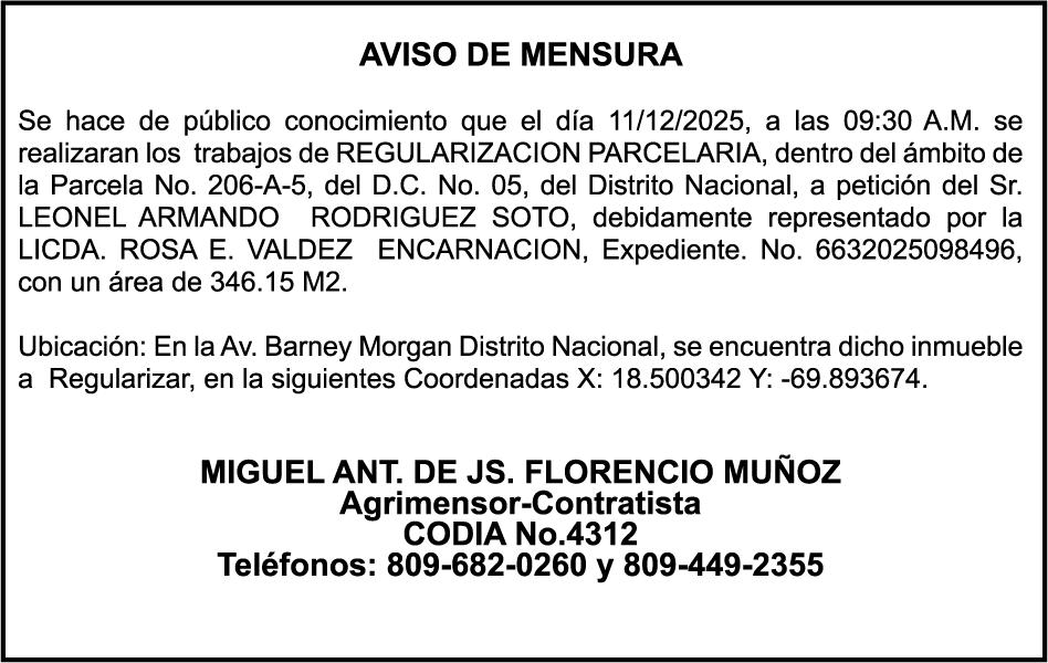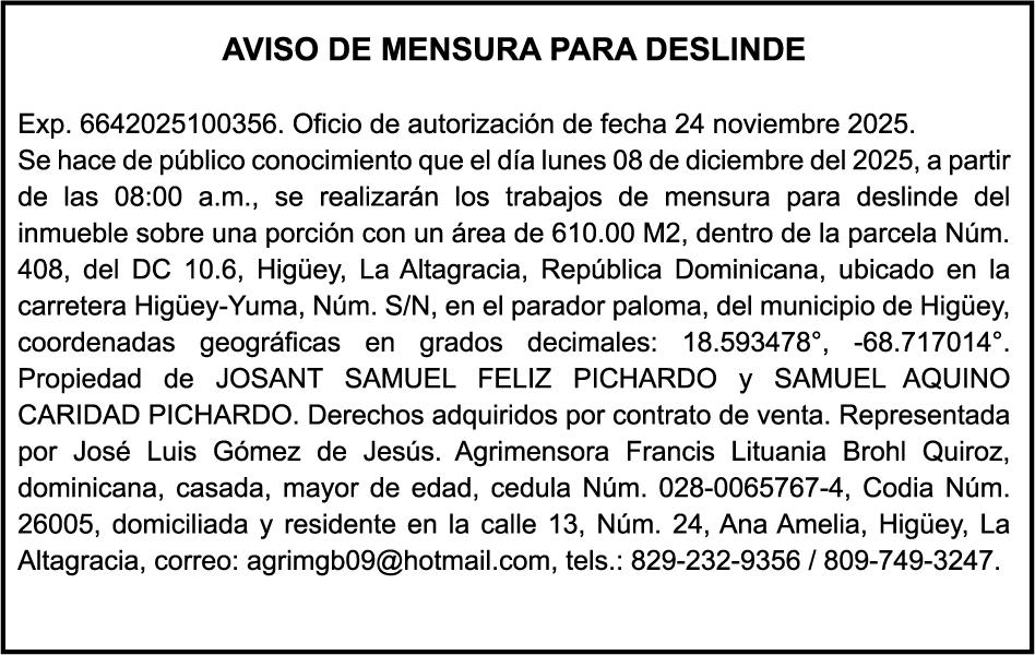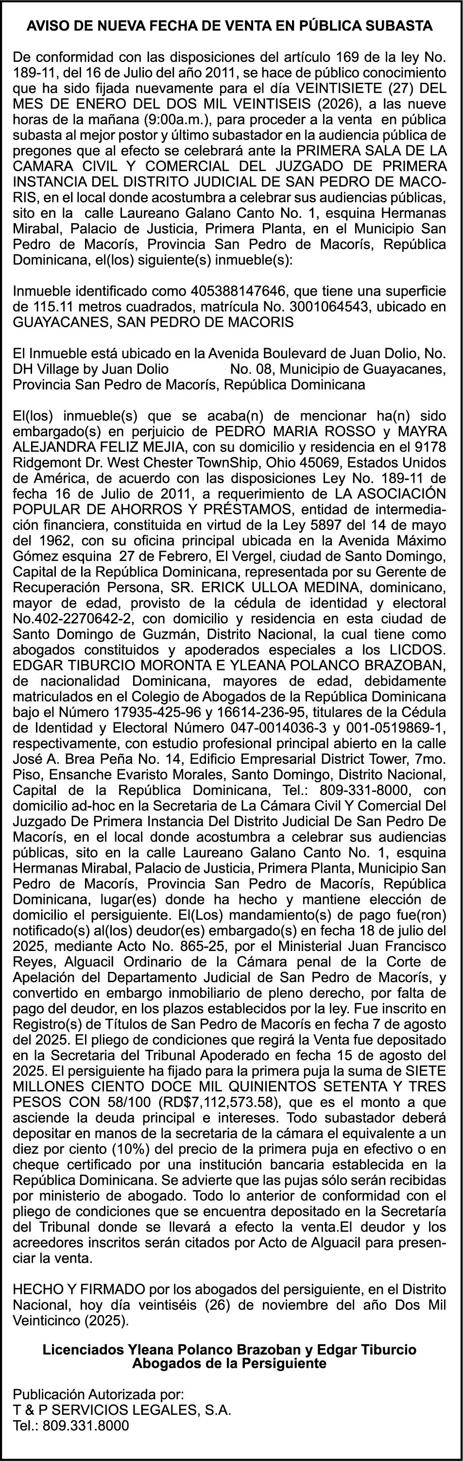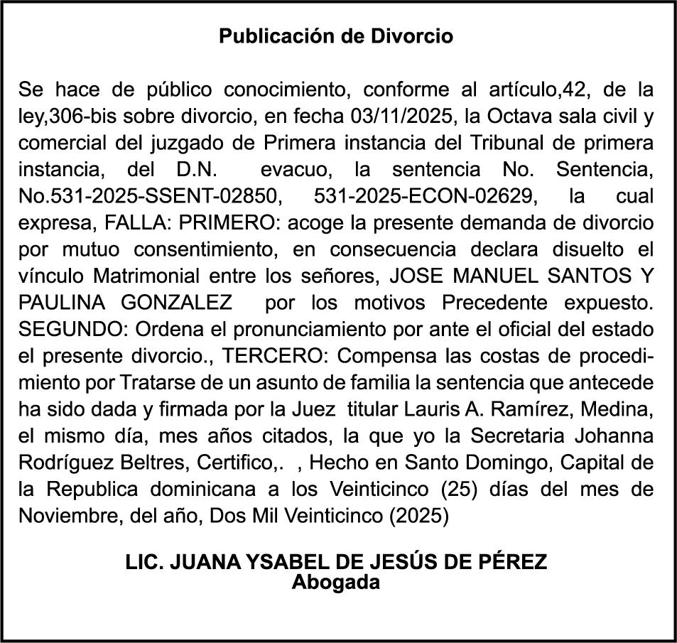 SE hace de público conocimiento la pérdida del Certificado Financiero número 850996554 emitido por Banco Popular Dominicano, S. A. Banco Múltiple, a nombre de ALBERTO CHALAS MARTINEZ, portador de la Cédula de Identidad y Electoral número 001-0595338-4, certificado número 850996554 expedido en fecha en fecha 7 de agosto de 2025 por el monto de (RD$3,000,000.00) más intereses generados a la fecha.