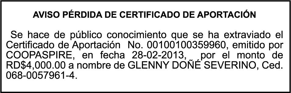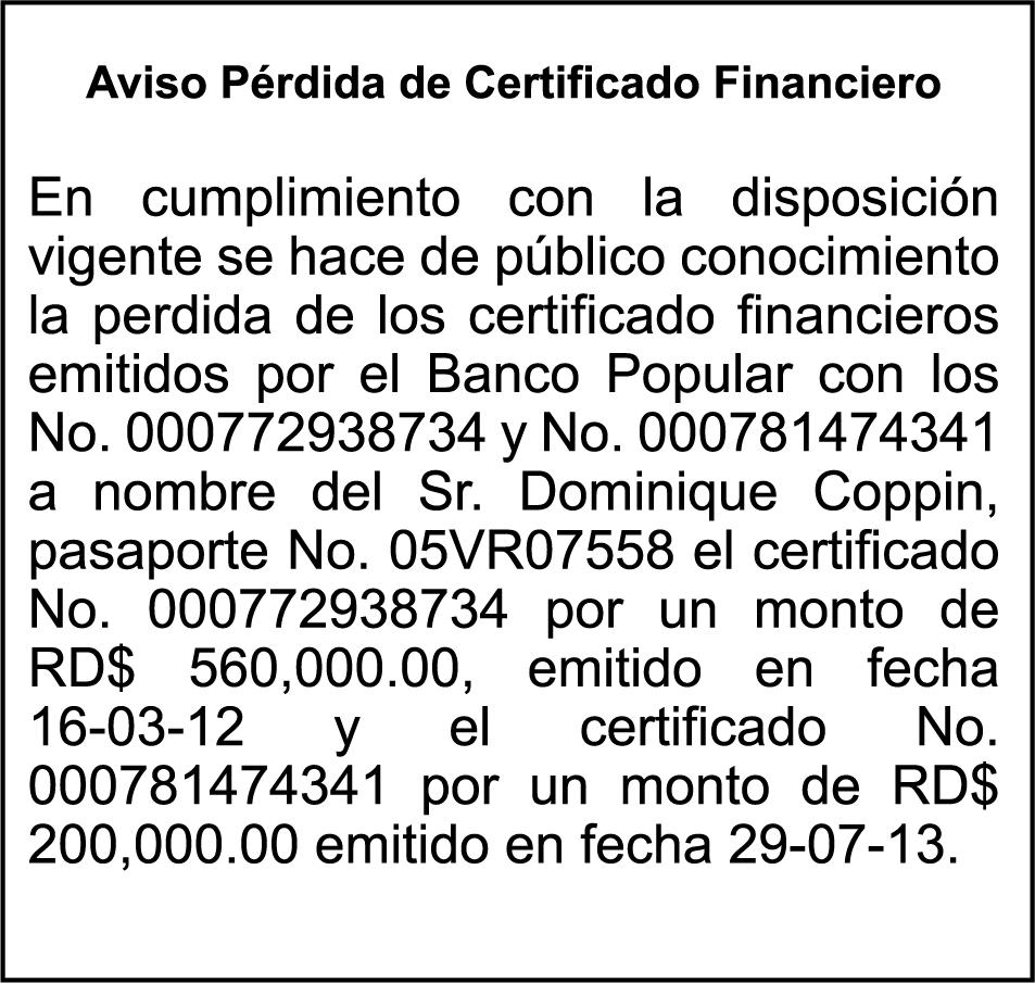 SE hace de público conocimiento la pérdida del Certificado Financiero número 780860839 emitido por Banco Popular Dominicano, S. A., a nombre de ADALGISA RAFAELA DEL M DIAZ CARRASCO, portadora de la Cédula de Identidad y Electoral número 001-0024481-3, certificado número 780860839 expedido en fecha 17 de junio del 2013 por el monto de (RD$2,778,213.61), más intereses generados a la fecha.