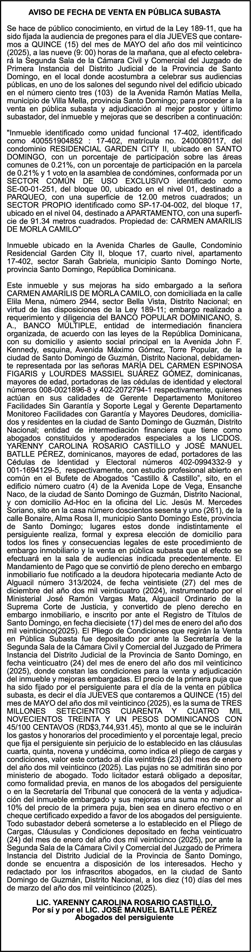 SE hace de público conocimiento la pérdida del Certificado Financiero número 826737579 emitido por Banco Popular Dominicano, S. A. Banco Múltiple, a nombre de GAVINO DE LA ROSA SEVERINO, portador de la Cédula de Identidad y Electoral número 090-0003355-6, certificado número 826737579 expedido en fecha 14 de marzo de 2022por el monto de (RD$89,590.44) más intereses generados a la fecha.