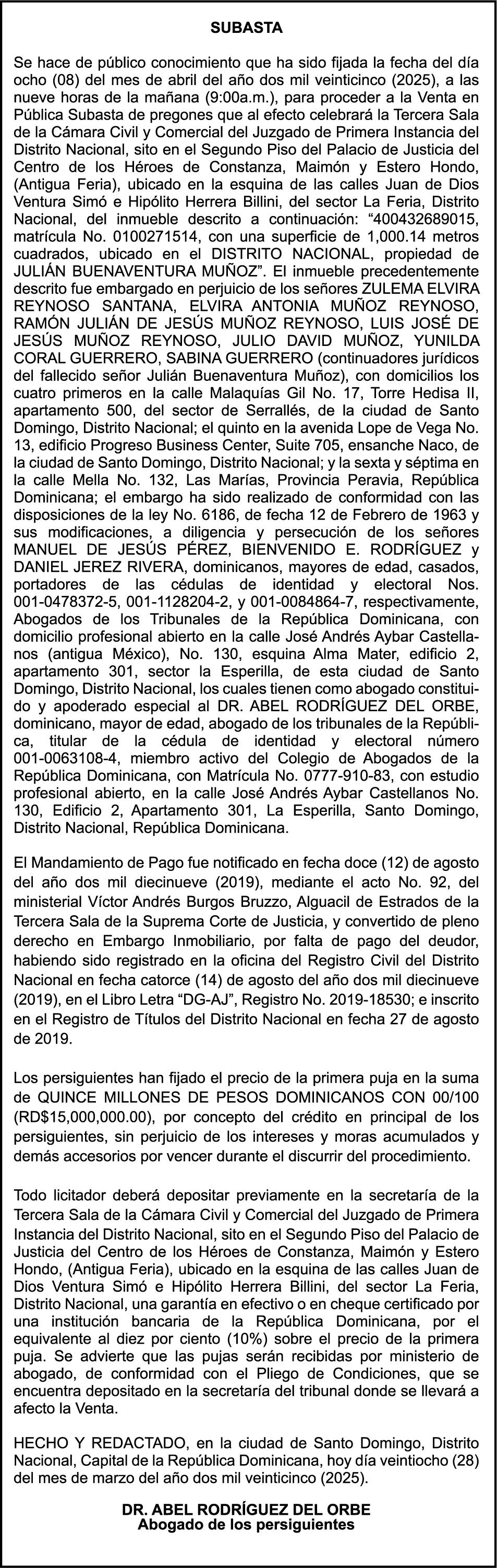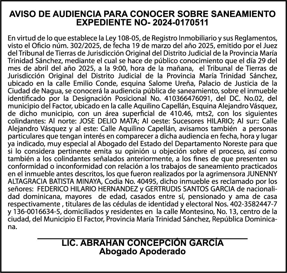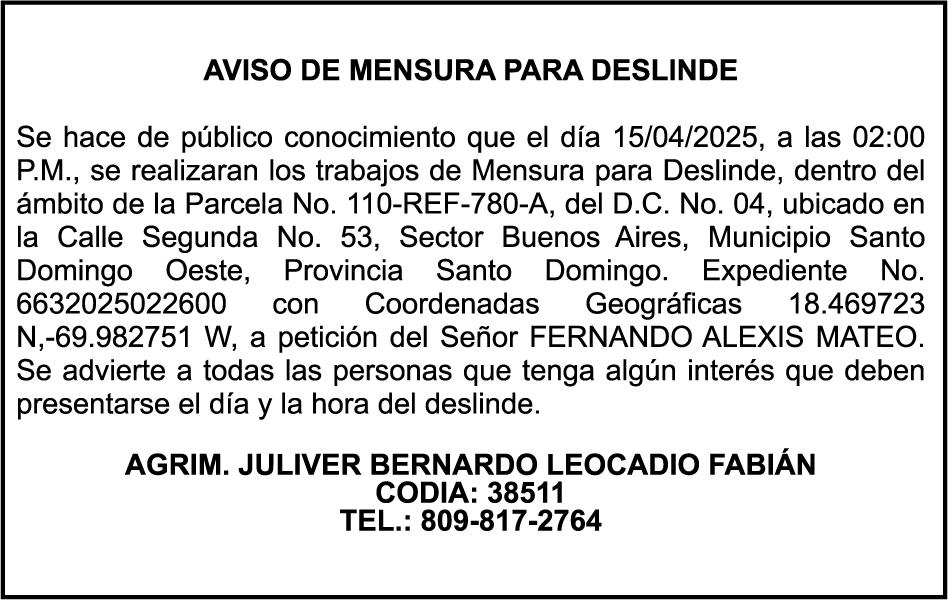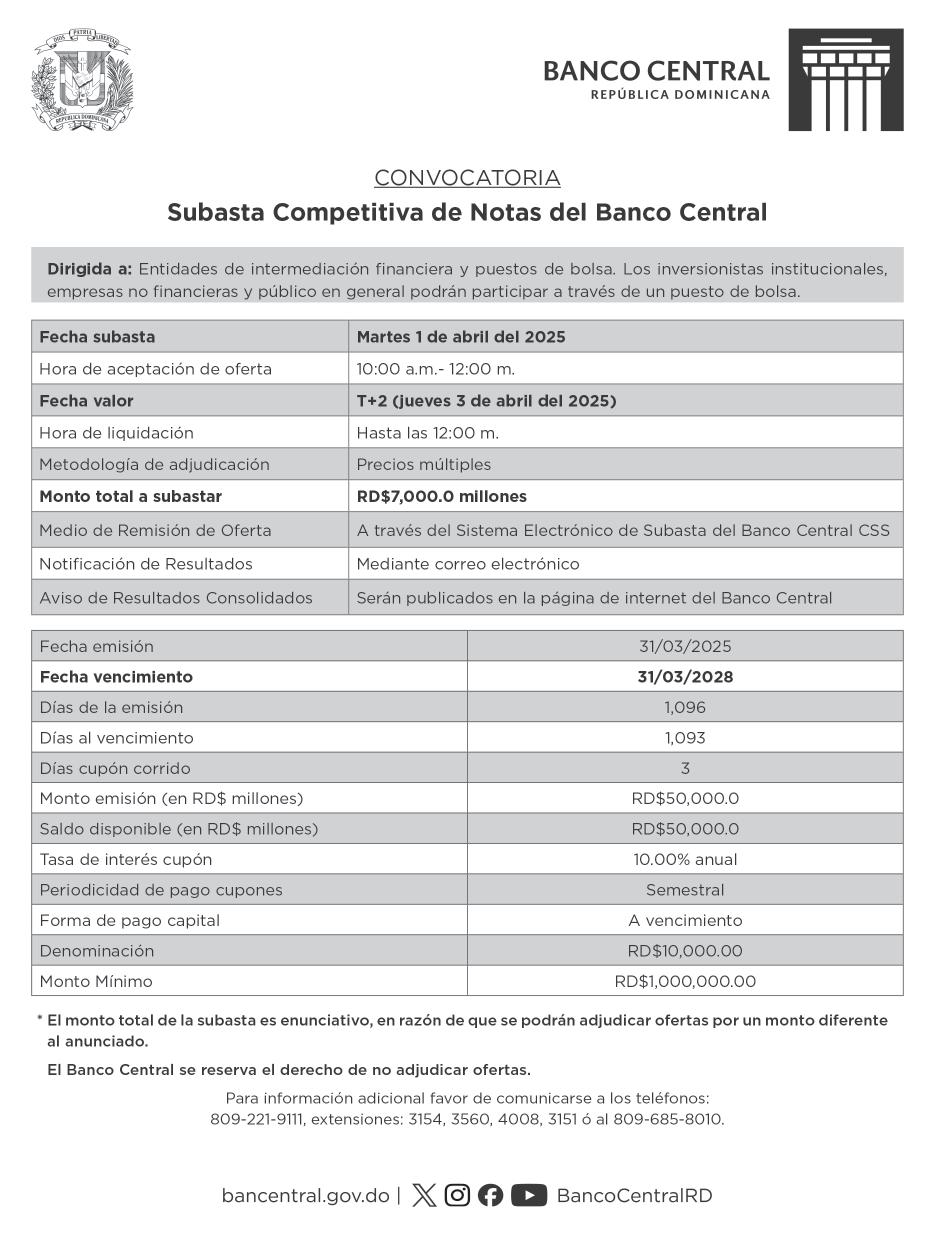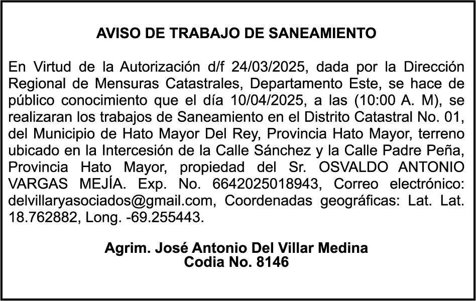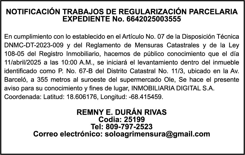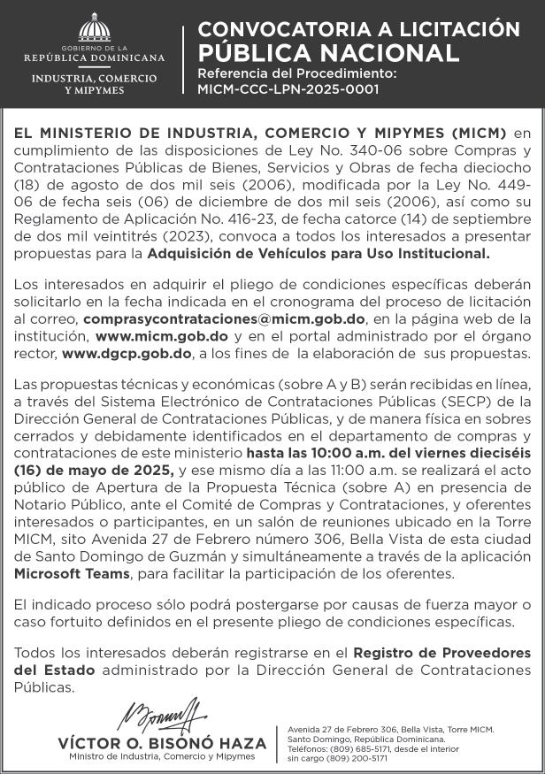9:00 A.M. Bienes Nacionales invita a subasta pública. Biblioteca Nacional Pedro Henríquez Ureña, Salón Aída Cartagena Portalatín.