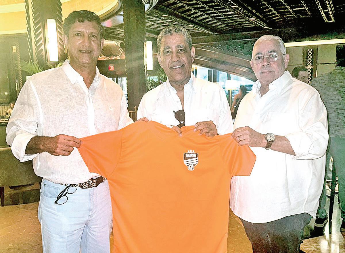 El congresista domínico americano Adriano Espaillat recibió la camiseta color naranja del Cibao FC, durante un encuentro con el ingeniero Manuel Estrella, presidente del onceno de Santiago de los Caballeros, y Rovin Rodríguez, presidente