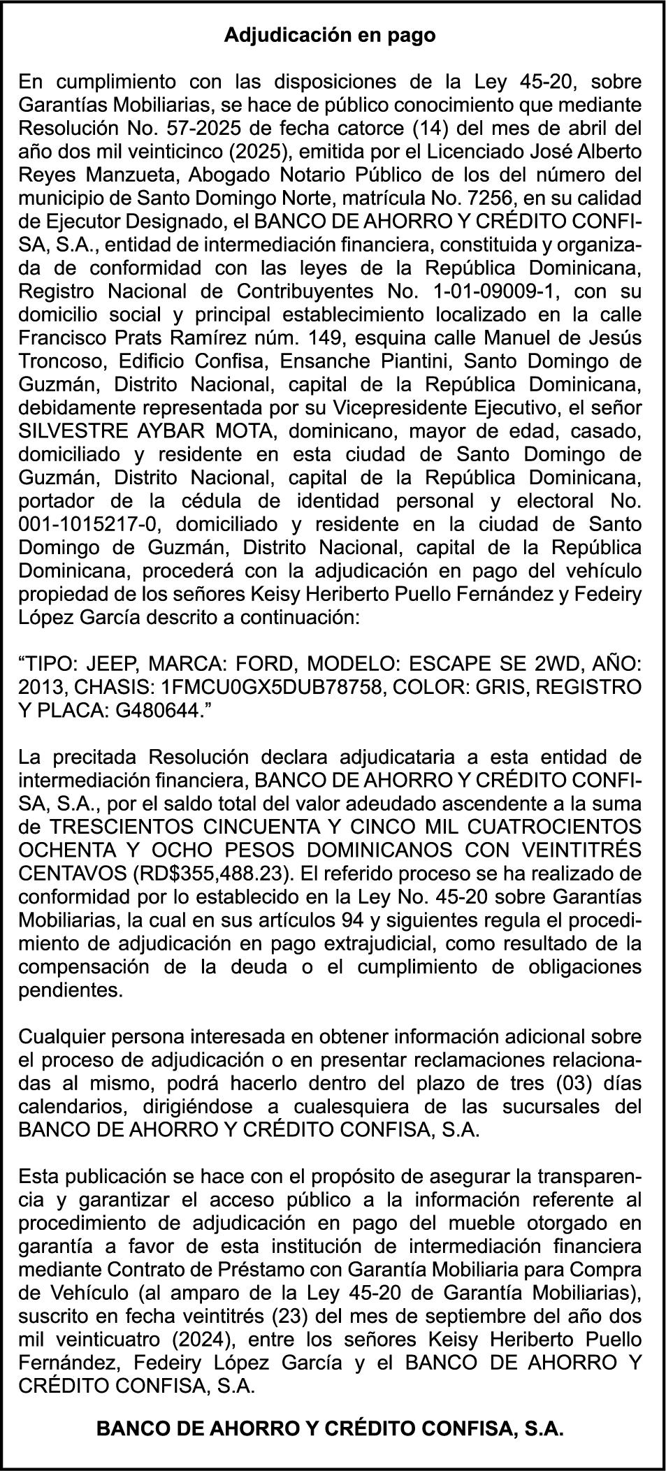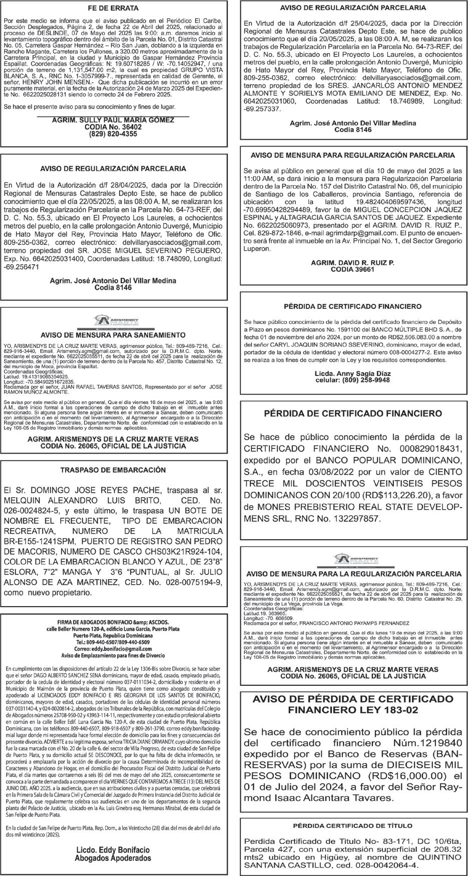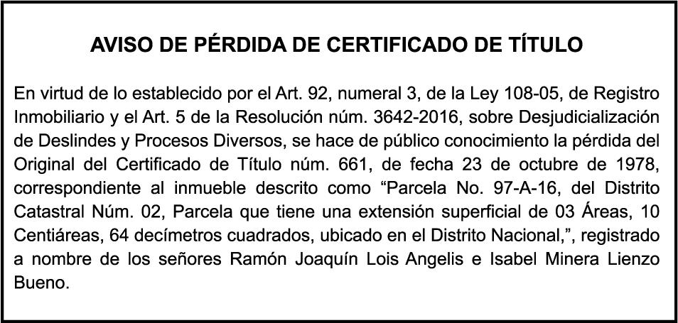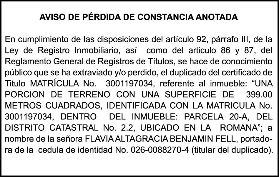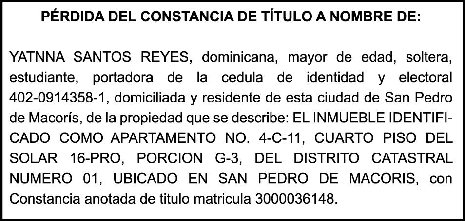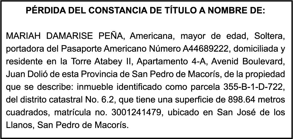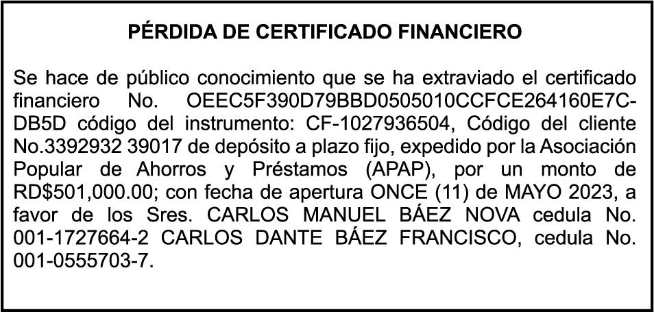 SE hace de público conocimiento la pérdida del Certificado Financiero número 846268639 emitido por Banco Popular Dominicano, S. A. Banco Múltiple, a nombre de CARMEN LALINE ARACHE RODRIGUEZ, portadora de la Cédula de Identidad y Electoral número 402-2715880-1, certificado número 846268639 expedido en fecha 31 de diciembre del 2024 por el monto de (US$101, 039.20) más intereses generados a la fecha.