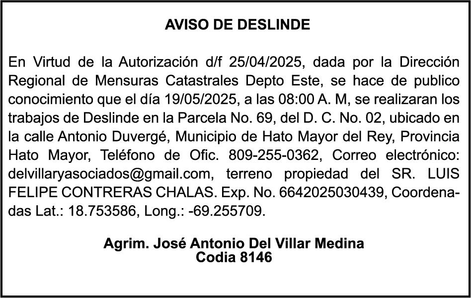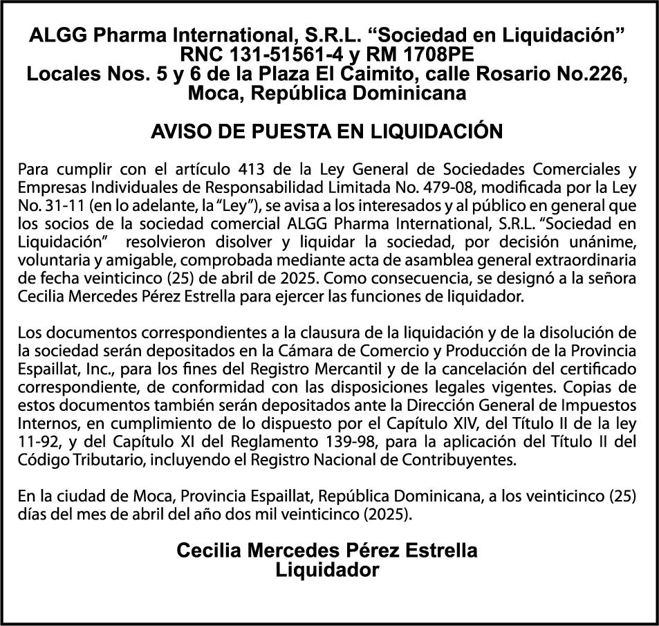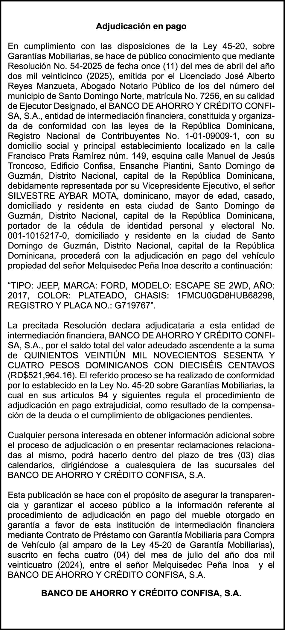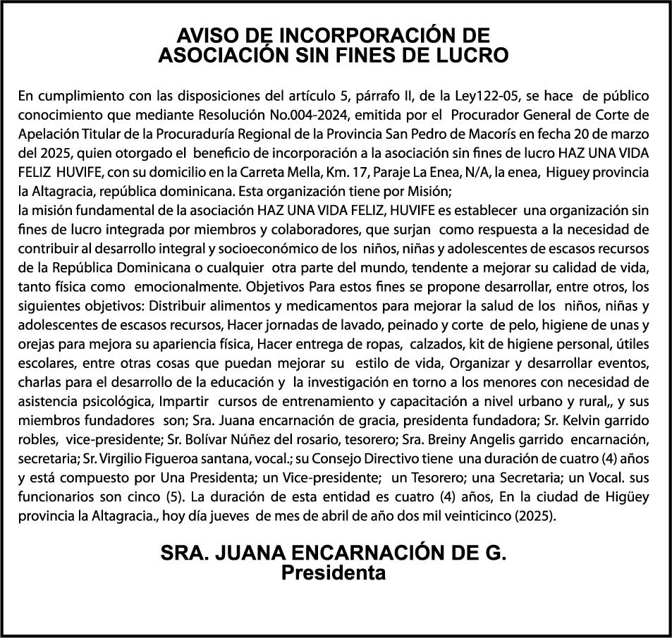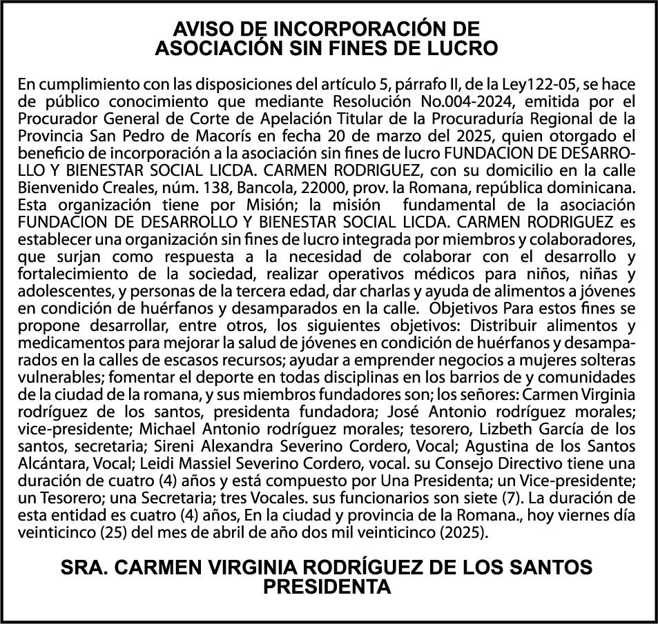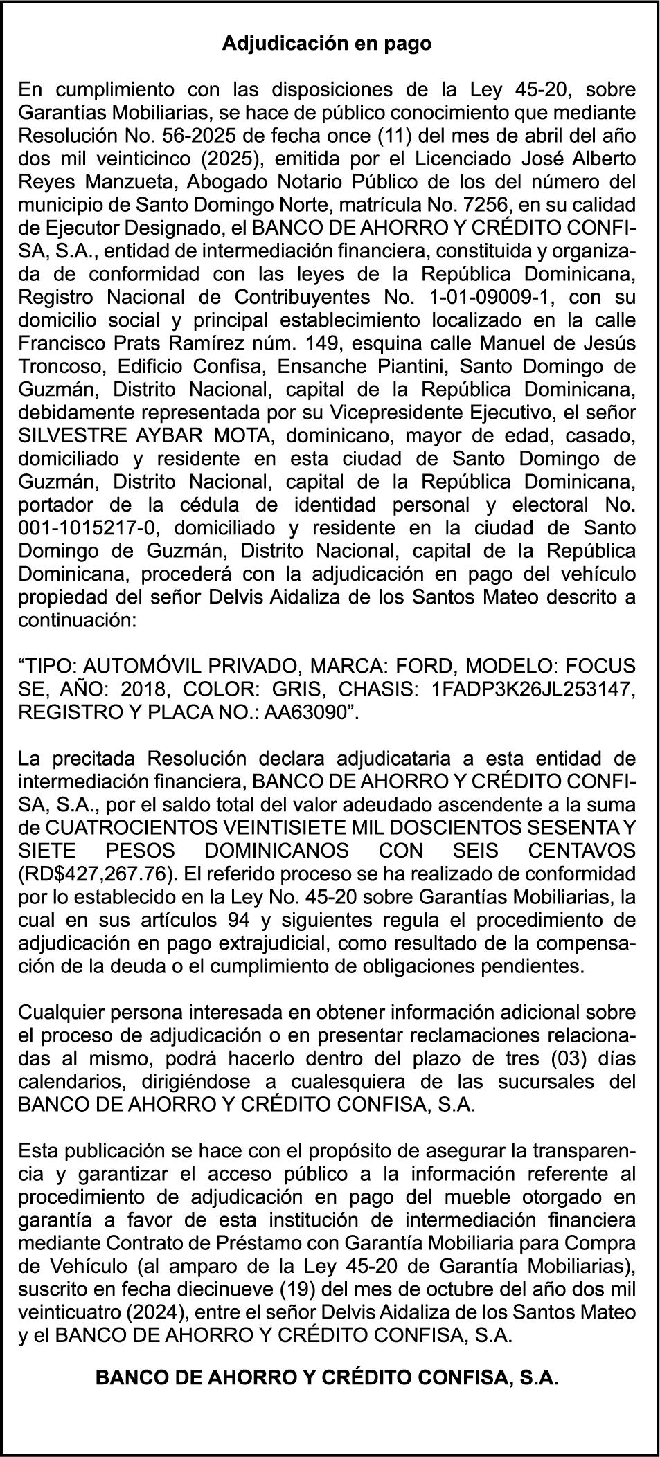 SE hace de público conocimiento la pérdida del Certificado Financiero número 846268639 emitido por Banco Popular Dominicano, S. A. Banco Múltiple, a nombre de CARMEN LALINE ARACHE RODRIGUEZ, portadora de la Cédula de Identidad y Electoral número 402-2715880-1, certificado número 846268639 expedido en fecha 31 de diciembre del 2024 por el monto de (US$101, 039.20) más intereses generados a la fecha.