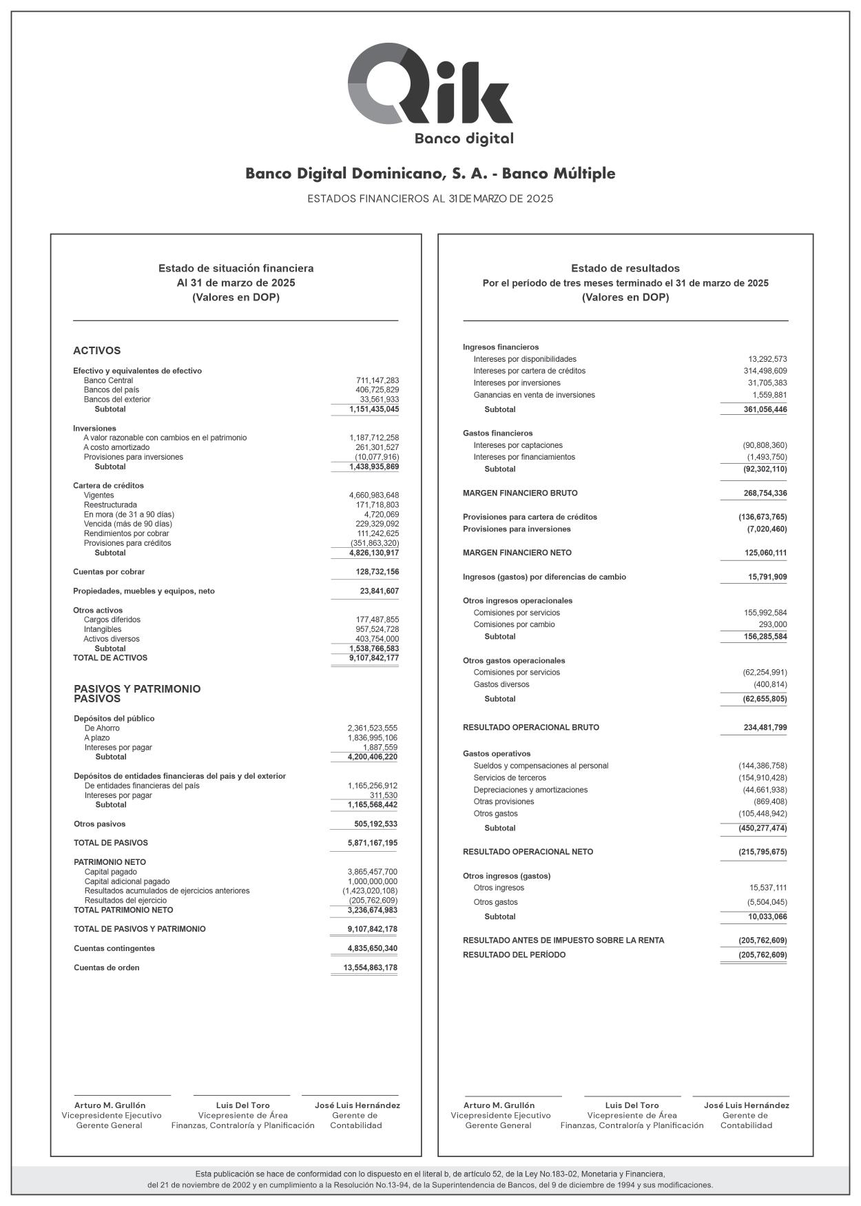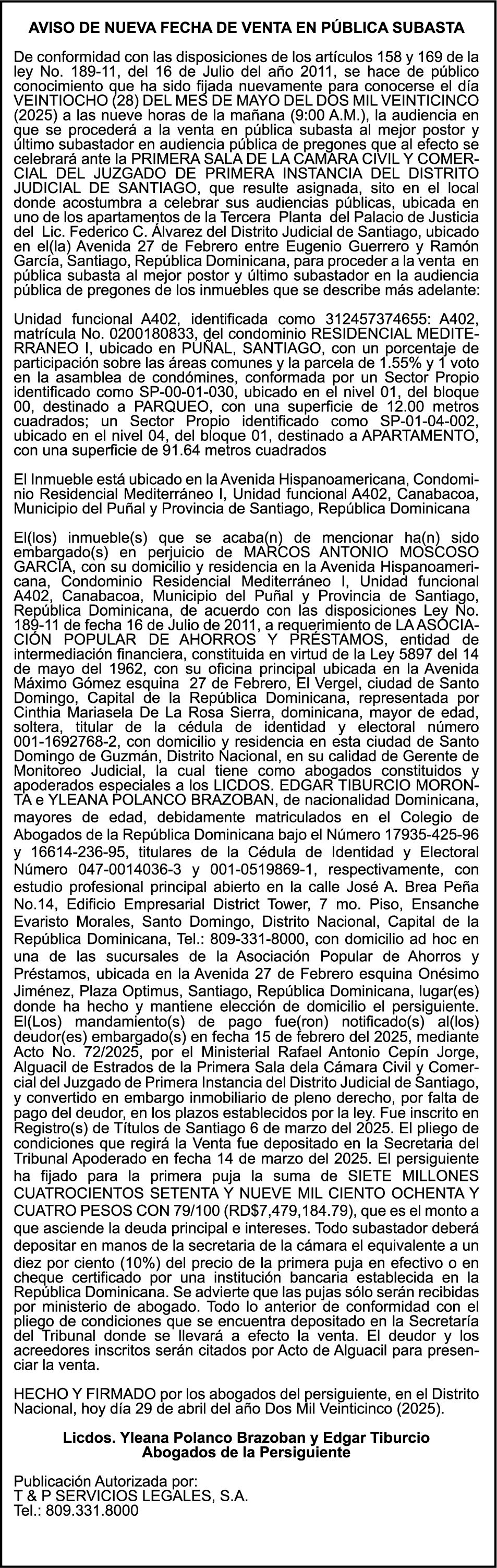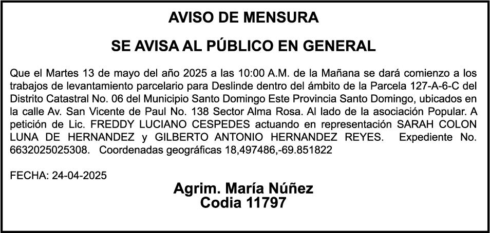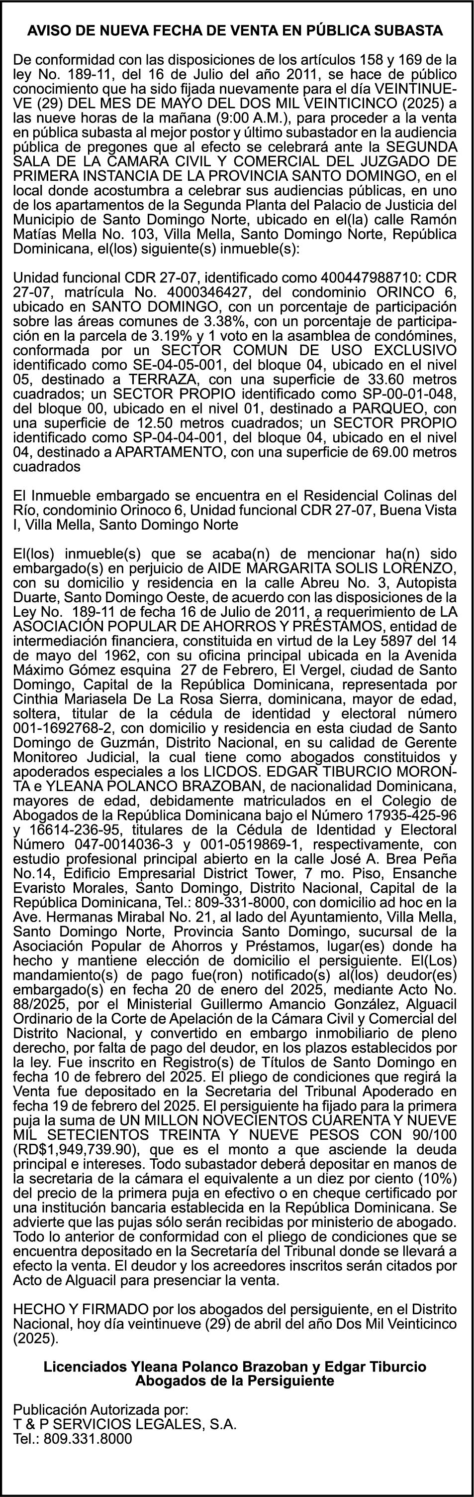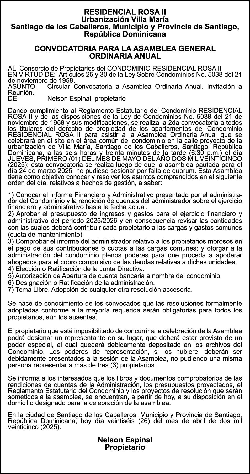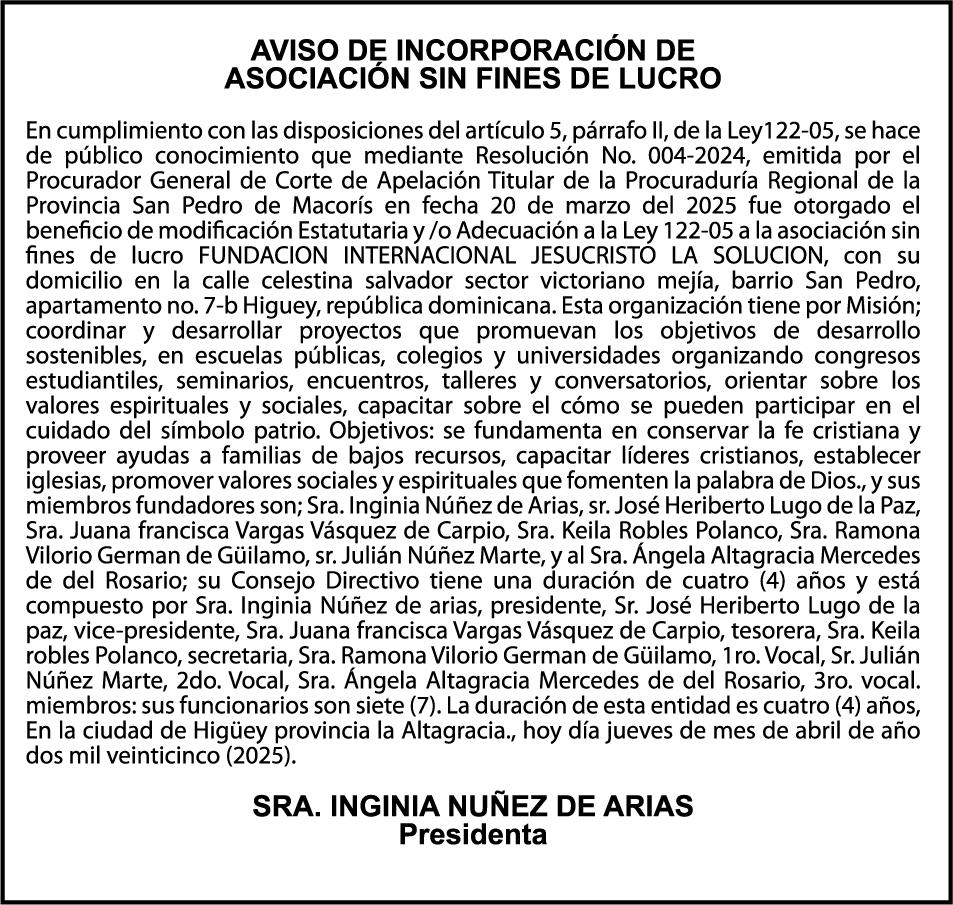 SE hace de público conocimiento la pérdida del Certificado Financiero número 846268639 emitido por Banco Popular Dominicano, S. A. Banco Múltiple, a nombre de CARMEN LALINE ARACHE RODRIGUEZ, portadora de la Cédula de Identidad y Electoral número 402-2715880-1, certificado número 846268639 expedido en fecha 31 de diciembre del 2024 por el monto de (US$101, 039.20) más intereses generados a la fecha.