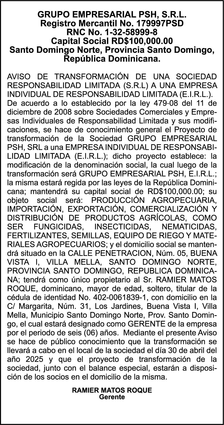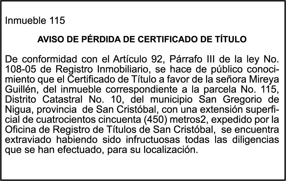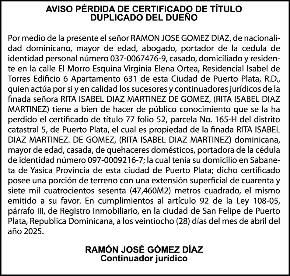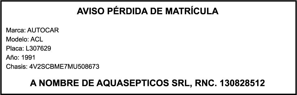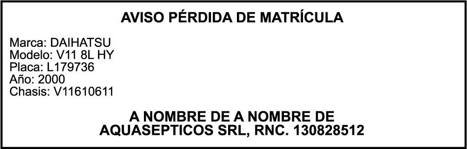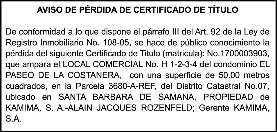 PERDIDA DE PLACA No. K2492252, Motocicleta LONCIN, Modelo LX125-58, Color NEGRO, Año 2023, Chasis LLCLP1T02PA501477, a nombre de LUIS MARIO CAPELLAN GILOT. SE hace de público conocimiento la pérdida del Certificado Financiero número 807678172 emitido por Banco Popular Dominicano, S. A. Banco Múltiple, a nombre de TRES MEDIA, SRL, RNC número 023-0100168-7, certificado número 807678172 expedido en fecha 8 de mayo de 2018 por el monto de (RD$1,500,000.00) más intereses generados a la fecha.