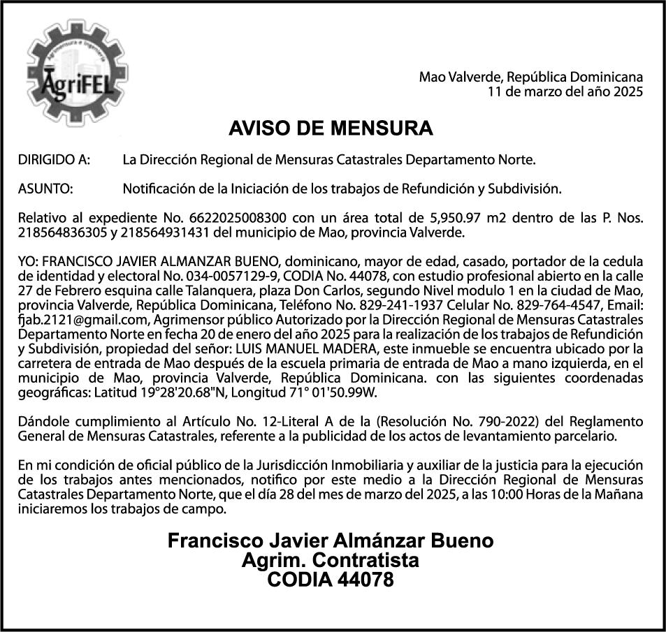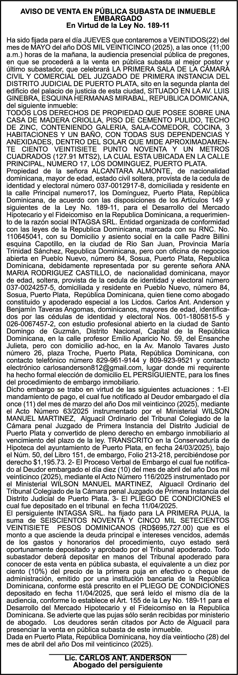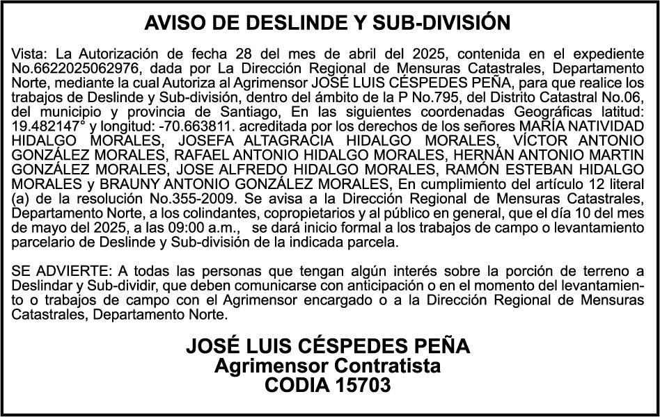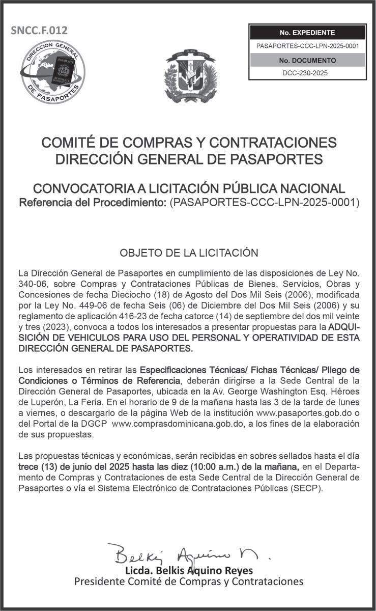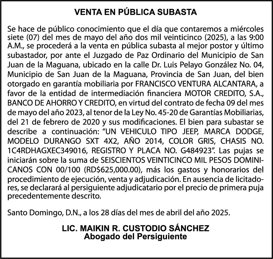 PERDIDA DE PLACA No. K2492252, Motocicleta LONCIN, Modelo LX125-58, Color NEGRO, Año 2023, Chasis LLCLP1T02PA501477, a nombre de LUIS MARIO CAPELLAN GILOT. SE hace de público conocimiento la pérdida del Certificado Financiero número 807678172 emitido por Banco Popular Dominicano, S. A. Banco Múltiple, a nombre de TRES MEDIA, SRL, RNC número 023-0100168-7, certificado número 807678172 expedido en fecha 8 de mayo de 2018 por el monto de (RD$1,500,000.00) más intereses generados a la fecha.