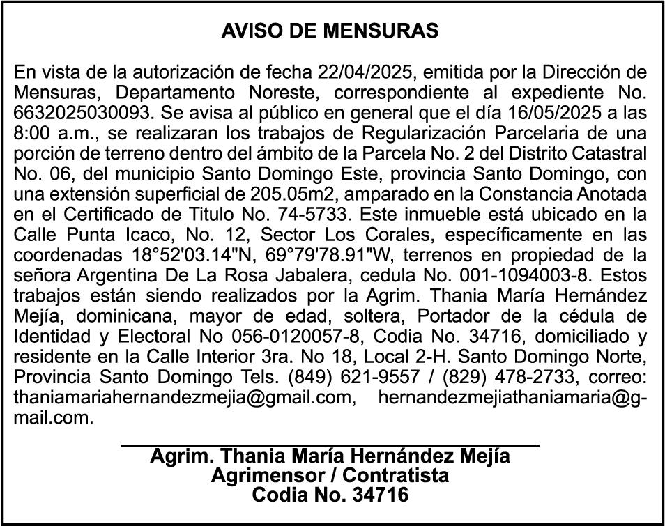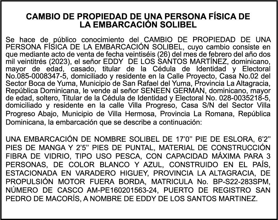 AVISO: cambio de nombre de embarcación. Se hace de público conocimiento, que se le está cambiando el nombre al bote de recreo de nombre “DOÑA POLA”, de 29.0 pies de eslora, matricula No. BR-D31-724SBS, propiedad del señor ENMANUEL DE JESUS RODRIGUEZ , para que en lo adelante se haga figurar con el nombre de “TRT”, en vez del primero.