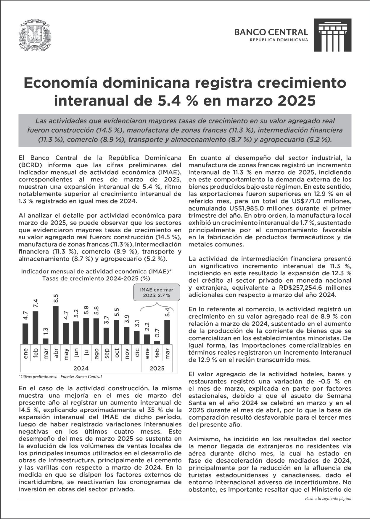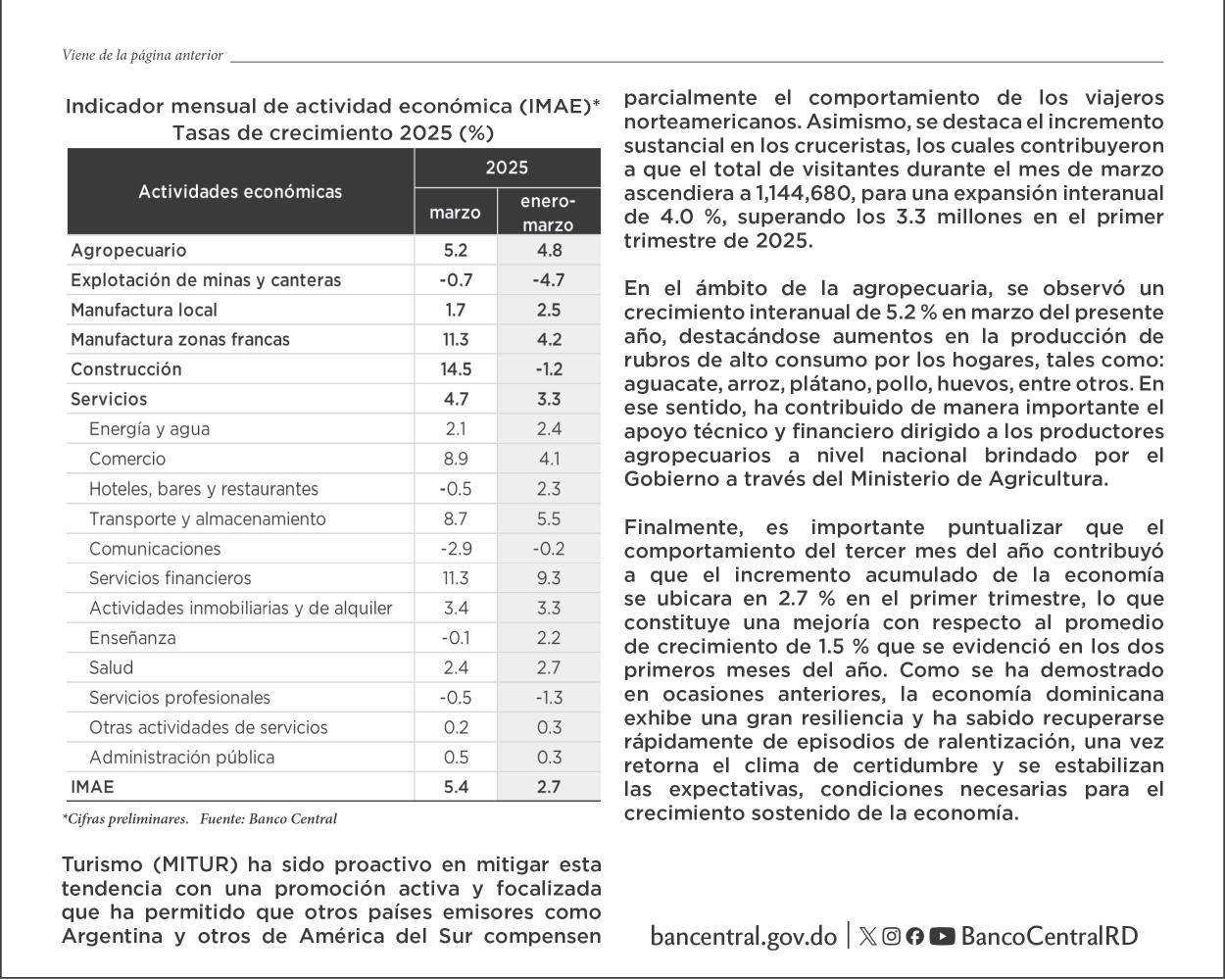 La economía de RD crece un 5.4 % interanual; en el primer trimestre fue 2.7 %