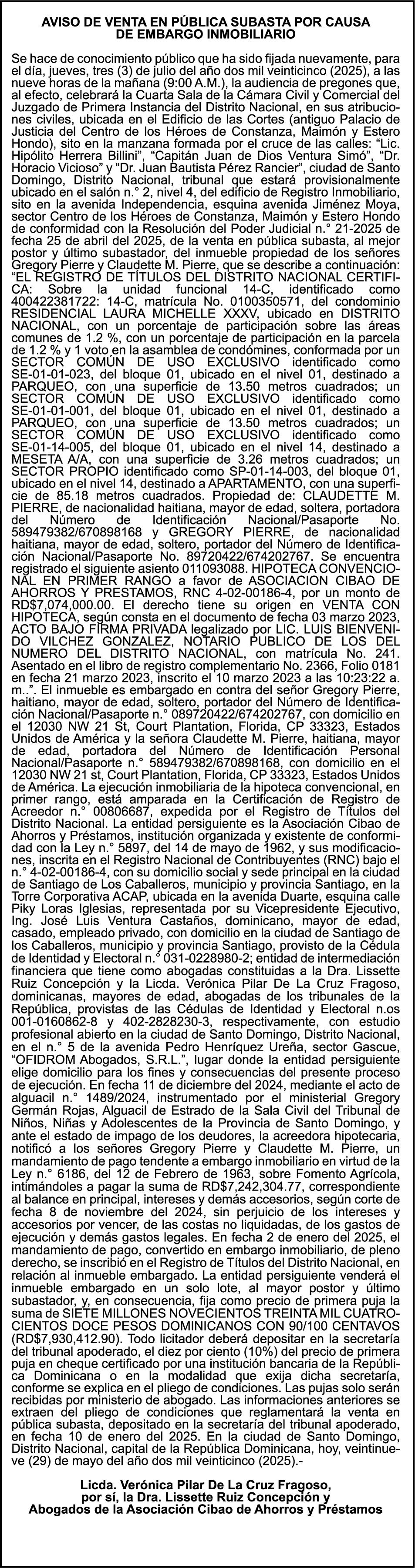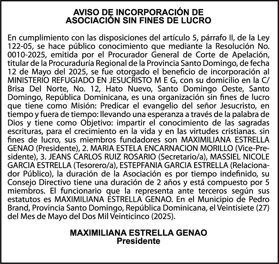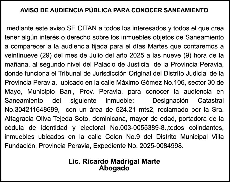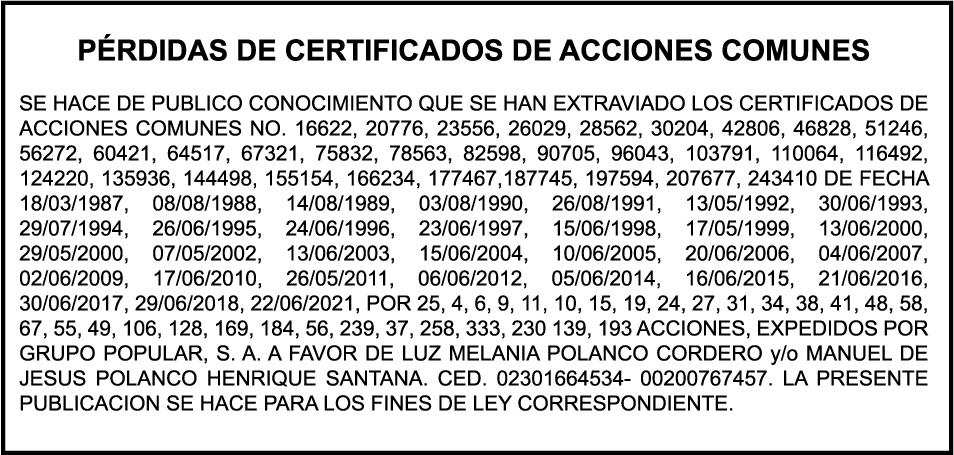 SE hace de público conocimiento la pérdida del Certificado Financiero número 841140668 emitido por Banco Popular Dominicano, S. A. Banco Múltiple, a nombre de DILIA MARGARITA LLUBERES RODRIGUEZ, portadora de la Cédula de Identidad y Electoral número 001-1717940-8, certificado número 841140668 expedido en fecha 6 de mayo de 2024 por el monto de (RD$108,479.57) más intereses generados a la fecha.