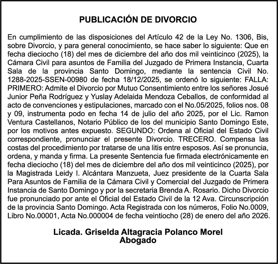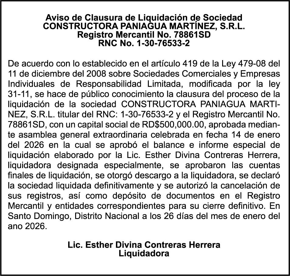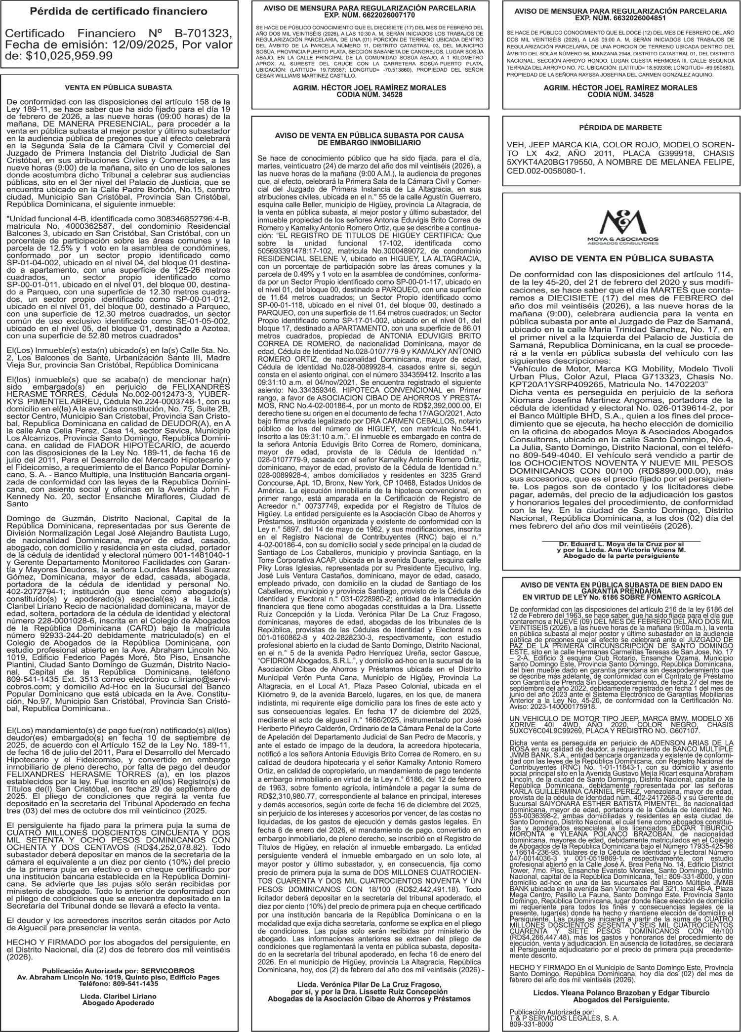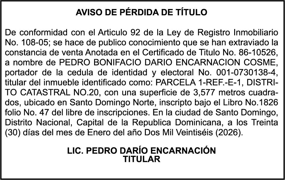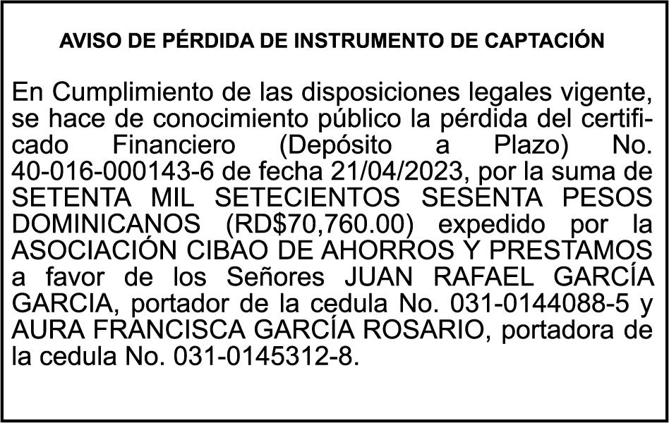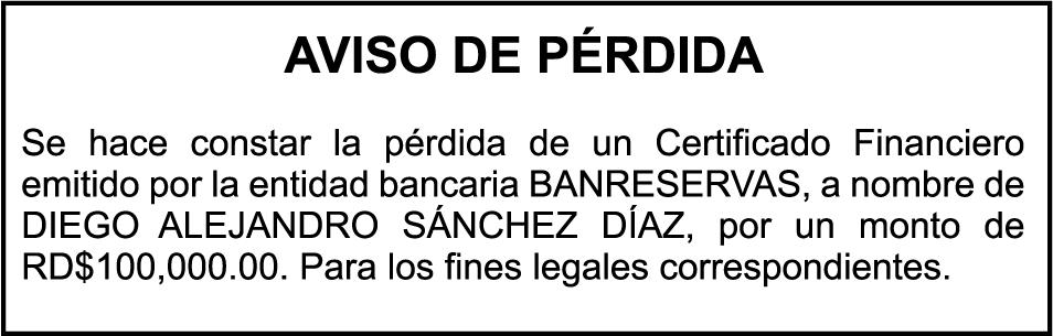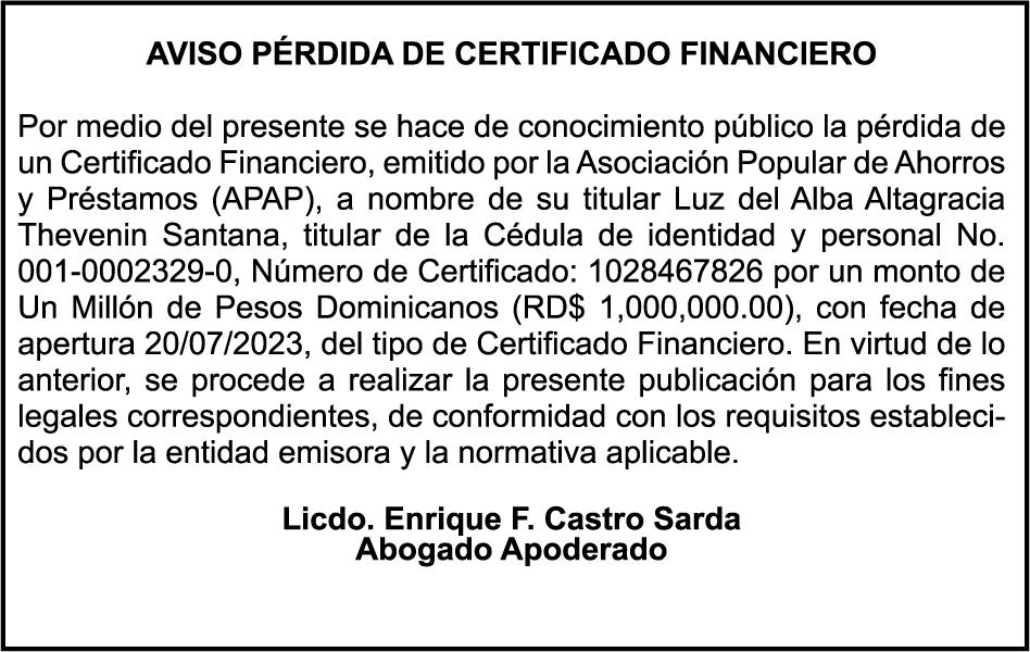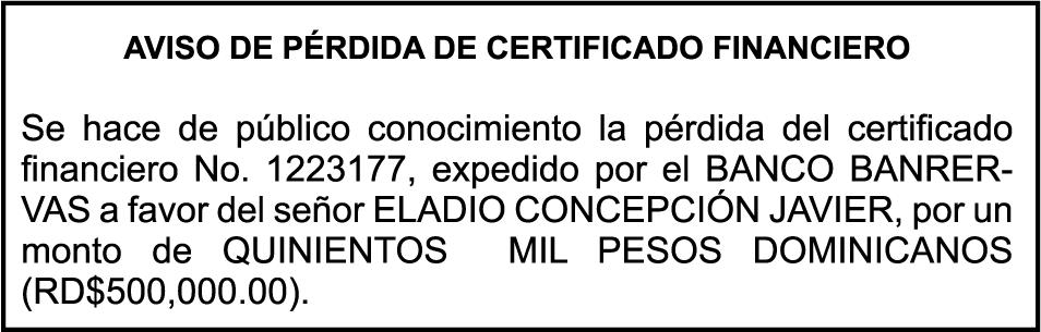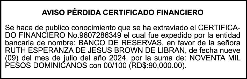 SE hace de público conocimiento la pérdida del Certificado Financiero número 847880119 emitido por Banco Popular Dominicano, S. A., a nombre de INDHIRA ROSALIA RODRIGUEZ VALDEZ, portadora de la Cédula de Identidad y Electoral número 402-3129189-5, certificado número 847880119 expedido en fecha 14 de marzo del 2025 por el monto de (RD$450,873.49), más intereses generados a la fecha.